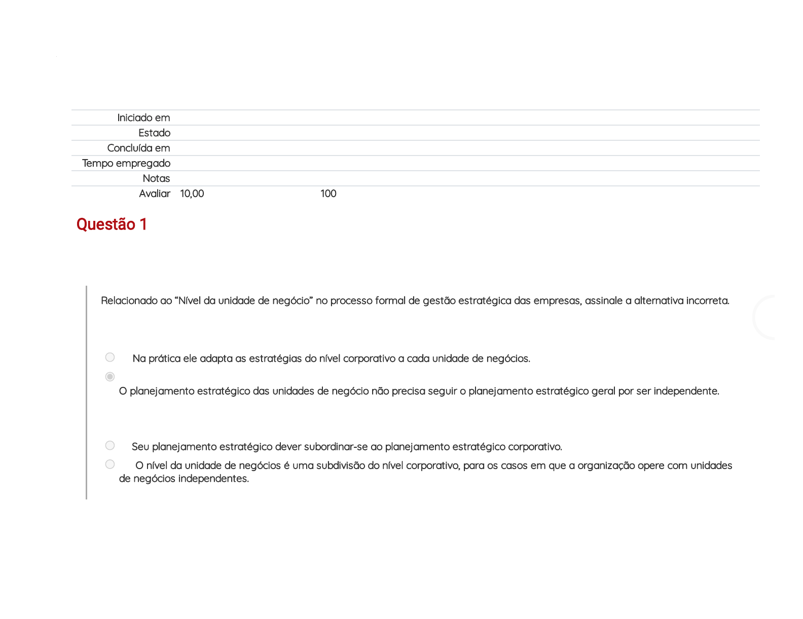 05/05/2021 AP3.1 - Avaliação Formativa Processual - Online (vale 40% da MAP): Revisão da tentativa https://virtual.uninta.edu.br/mod/quiz/review.php?attempt=2801264&cmid=688219 1/20 Iniciado em Wednesday, 5 May 2021, 19:29 Estado Finalizada Concluída em Wednesday, 5 May 2021, 19:50 Tempo empregado 21 minutos 58 segundos Notas 20,00/20,00 Avaliar 10,00 de um máximo de 10,00(100%) Questão 1 Correto Atingiu 1,00 de 1,00 Relacionado ao “Nível da unidade de negócio” no processo formal de gestão estratégica das empresas, assinale a alternativa incorreta. Escolha uma opção: a. Na prática ele adapta as estratégias do nível corporativo a cada unidade de negócios. b. O planejamento estratégico das unidades de negócio não precisa seguir o planejamento estratégico geral por ser independente. c. Seu planejamento estratégico dever subordinar-se ao planejamento estratégico corporativo. d. O nível da unidade de negócios é uma subdivisão do nível corporativo, para os casos em que a organização opere com unidades de negócios independentes. Sua resposta está correta. 05/05/2021 AP3.1 - Avaliação Formativa Processual - Online (vale 40% da MAP): Revisão da tentativa https://virtual.uninta.edu.br/mod/quiz/review.php?attempt=2801264&cmid=688219 2/20 Questão 2 Correto Atingiu 1,00 de 1,00 Relacionado ao “Nível Corporativo” no processo formal de gestão estratégica das empresas, assinale a alternativa incorreta. Escolha uma opção: a. O nível corporativo trata de decisões estratégicas. b. O nível corporativo trata de decisões que não podem ser descentralizadas sem que se corra o risco de erros. c. O nível corporativo trata de assuntos globais e estratégicos da organização. d. O nível corporativo discute estratégias táticas das organizações. Sua resposta está correta. 05/05/2021 AP3.1 - Avaliação Formativa Processual - Online (vale 40% da MAP): Revisão da tentativa https://virtual.uninta.edu.br/mod/quiz/review.php?attempt=2801264&cmid=688219 3/20 Questão 3 Correto Atingiu 1,00 de 1,00 Ainda sobre os Critérios Competitivos, assinale a alternativa errada. Escolha uma opção: a. Pode haver mais de 2 critérios por serviços; b. Facilita o trabalho do Marketing e de Operações ligados as exigências dos clientes; c. O conceito de estratégias competitivas de Porter foi uma grande in�uência. d. Nem todos os critérios se aplicam a todos os serviços Sua resposta está correta. 05/05/2021 AP3.1 - Avaliação Formativa Processual - Online (vale 40% da MAP): Revisão da tentativa https://virtual.uninta.edu.br/mod/quiz/review.php?attempt=2801264&cmid=688219 4/20 Questão 4 Correto Atingiu 1,00 de 1,00 “Ele constitui a missão do sistema de operações, que de forma mais simples é dizer onde o sistema de operações tem que atingir a excelência.” Assinale a opção que melhor de�ne o conceito acima: Escolha uma opção: a. Diferenciação; b. Segmentação; c. Conceito; d. Posicionamento; Sua resposta está correta. 05/05/2021 AP3.1 - Avaliação Formativa Processual - Online (vale 40% da MAP): Revisão da tentativa https://virtual.uninta.edu.br/mod/quiz/review.php?attempt=2801264&cmid=688219 5/20 Questão 5 Correto Atingiu 1,00 de 1,00 Complete a a�rmativa abaixo: Os objetivos da estratégia de operações referem-se aos ___________________ que devem ser estabelecidos e cuidadosamente priorizados pelas necessidades e/ou expectativas do mercado, nos quais o sistema de operações deve atingir excelência. Escolha uma opção: a. Critérios Competitivos b. Recursos Operacionais; c. Recursos Competitivos; d. Critérios Operacionais; Sua resposta está correta. 05/05/2021 AP3.1 - Avaliação Formativa Processual - Online (vale 40% da MAP): Revisão da tentativa https://virtual.uninta.edu.br/mod/quiz/review.php?attempt=2801264&cmid=688219 6/20 Questão 6 Correto Atingiu 1,00 de 1,00 “Atenção personalizada ao cliente; boa comunicação; cortesia; ambiente.” São indicadores de que critério de avaliação de serviços? Escolha uma opção: a. Tangíveis; b. Atendimento/Atmosfera; c. Custo. d. Velocidade de Atendimento; Sua resposta está correta. 05/05/2021 AP3.1 - Avaliação Formativa Processual - Online (vale 40% da MAP): Revisão da tentativa https://virtual.uninta.edu.br/mod/quiz/review.php?attempt=2801264&cmid=688219 7/20 Questão 7 Correto Atingiu 1,00 de 1,00 Os autores colocam que de acordo com dados do Great Place to Work (GPW) Instituem os fatores que mais atraem pessoas (futuro funcionários) para as empresas de serviços são: Escolha uma opção: a. Criatividade, Respeito, Justiça, Religião e Camaradagem b. Credibilidade, Respeito, Justiça, Religião e Camaradagem c. Criatividade, Respeito, Justiça, Orgulho e Camaradagem d. Credibilidade, Respeito, Justiça, Orgulho e Camaradagem Sua resposta está correta. 05/05/2021 AP3.1 - Avaliação Formativa Processual - Online (vale 40% da MAP): Revisão da tentativa https://virtual.uninta.edu.br/mod/quiz/review.php?attempt=2801264&cmid=688219 8/20 Questão 8 Correto Atingiu 1,00 de 1,00 “Conformidade com experiência anterior; ausência de variabilidade no resultado ou processo. Exemplo de empresa que enfatiza _______: McDonald’s.” Complete a a�rmação, com o Critério Competitivo correto, de acordo com os autores. Escolha uma opção: a. Competência; b. Credibilidade/Segurança c. Flexibilidade. d. Consistência Sua resposta está correta. 05/05/2021 AP3.1 - Avaliação Formativa Processual - Online (vale 40% da MAP): Revisão da tentativa https://virtual.uninta.edu.br/mod/quiz/review.php?attempt=2801264&cmid=688219 9/20 Questão 9 Correto Atingiu 1,00 de 1,00 Faz parte do conceito as de�nições de ______________, que é o processo de identi�cação de um grupo de consumidores com características comuns que viabilize a oferta do serviço (que atenda as necessidades de um grupo e consumidores); Escolha uma opção: a. Clientização; b. Posicionamento; c. Prioridades