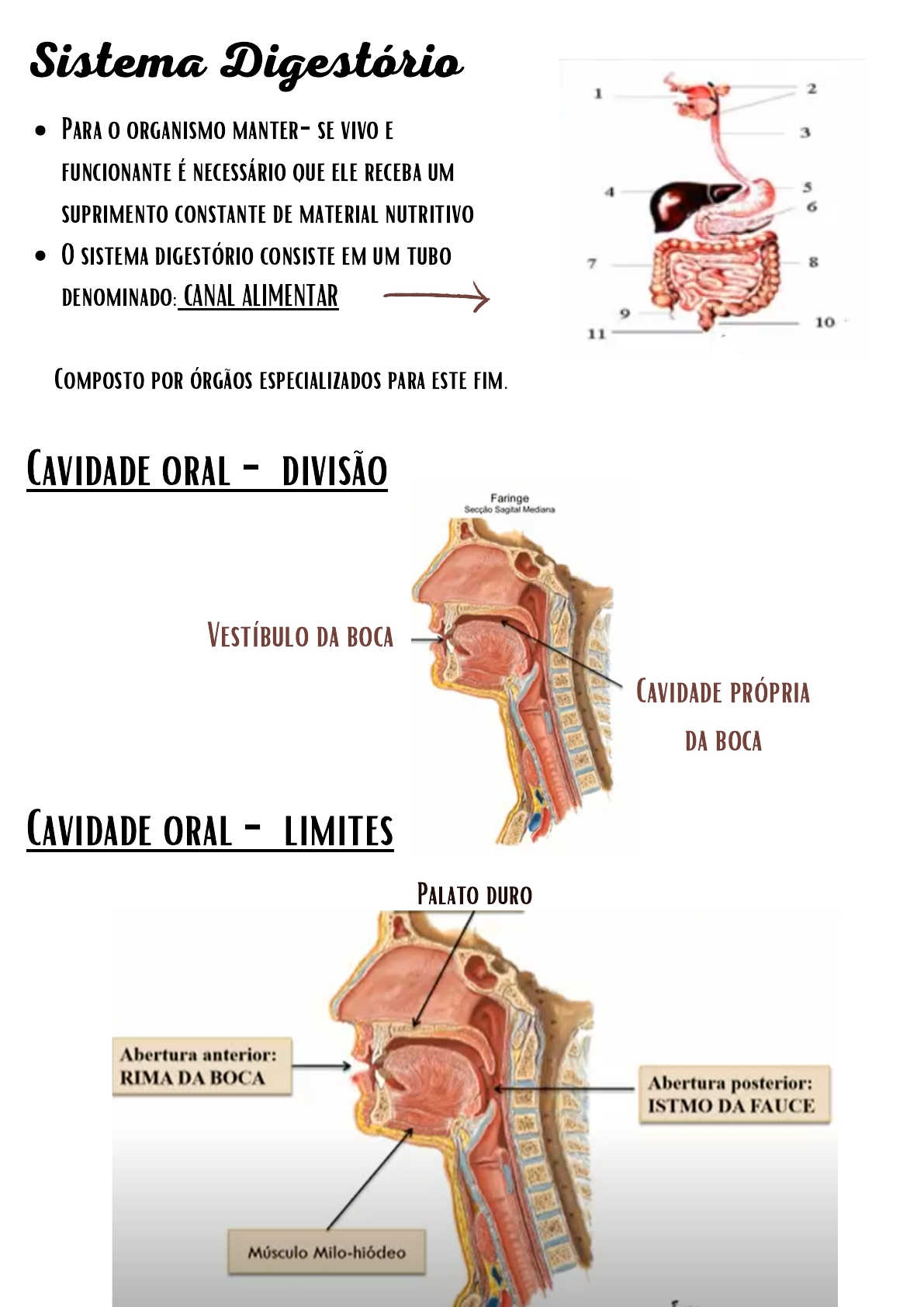 Para o organismo manter-se vivo e funcionante é necessário que ele receba um suprimento constante de material nutritivo O sistema digestório consiste em um tubo denominado: CANAL ALIMENTAR Sistema Digestório Composto por órgãos especializados para este fim. Cavidade oral - divisão Cavidade própria da boca Vestíbulo da boca Cavidade oral - limites Palato duro Transição da cavidade oral para faringe: Istmos das fauces Úvula palatina Língua Órgão revestido por mucosa Raíz Corpo Ápice da língua Margens da língua Dorso da língua Rica em vasos sanguíneos Rede capilar - absorção de medicamentos Face inferior da língua: Dorso da língua Sulco terminal da línguaParte pós sulcal - tonsilas linguais Parte pré sulcal - papilas linguais Papilas gustativas São as que detectam o sabor Cada tipo de papila detecta um tipo Parte pré sulcal do dorso da língua Dentes Esmalte Dentina Polpa Cemento Parte nasal Parte oral E coma laringe Órgão posterior, que tem contato com: Faringe Associada ao sist. respiratório e digestório Músculos constritores da faringe Músculos constritores superior da faringe Músculos constritores médio da faringe Músculos constritores inferior da faringe Junção faringoesofágica Esôfago Esôfago Mede em torno de 25cm Diâmetro em torno de 2cm Musculatura M.E.E (superior) Musculatura M.Liso (inferior) Inicio: junção faringoesofágica Término: Junção esofagogástrica Parte cervical Parte torácica Parte abdominal Possui 3 partes: Estômago Junções Óstios Partes Subpartes Capacidade 1 a 2L Vazio: forma da letra J Pouca absorção Função: digestão enzimática (o suco gástrico converte o alimento em quimo) Menor segmento do intestino delgado Mede por volta de 25cm Forma arco, C e U Parte maior é o Íleo (3/5) Parte menor é o jejuno (2/5) Não existe demarcação anatômica que separem os dois, mas sabemos que: Duodeno Jejuno Íleo 3 partes: Intestino Delgado Duodeno Jejuno e Íleo Junção ileal + Calibroso Fitas musculares - tênias do colo Saculações do colo Apendices adiposos do colo Intestino grosso Reto e canal anal Reto Canal anal Últimos segmentos do intestino grosso Características do intestino grosso: Aspectos funcionais - intestinos Completar a digestão iniciada no estômago Maior parte da absorção Executa a função de secretar muco e algumas enzimas Intestino delgado: Proporcionar absorção de água e tóxicos no bolo fecal Formar e conduzir o bolo fecal, e retê-lo até sua eliminação Intestino grosso: Peritônio Diminuir atrito Opor resistência às infecções e armazenamento de gordura. Principais funções: Órgãos anexos Vestíbulo da boca - 2° molar Fígado: faces e lobos Produzir e secretar a bile A bile é armazenada da vesícula biliar Função: Desidratar a bile e tornando-a mais concentrada Função da vesícula biliar: Vesícula biliar Pâncreas Estruturas: Ampola Hepatopancreática Vascularização: Artéria hepática comum Artéria gástrica esquerda Artéria esplênica Tronco celíaco Artéria mesentérica superior Artéria mesentérica inferior Veia porta do fígado Veia mesentérica superior Veia mesentérica inferior Veria esplênica