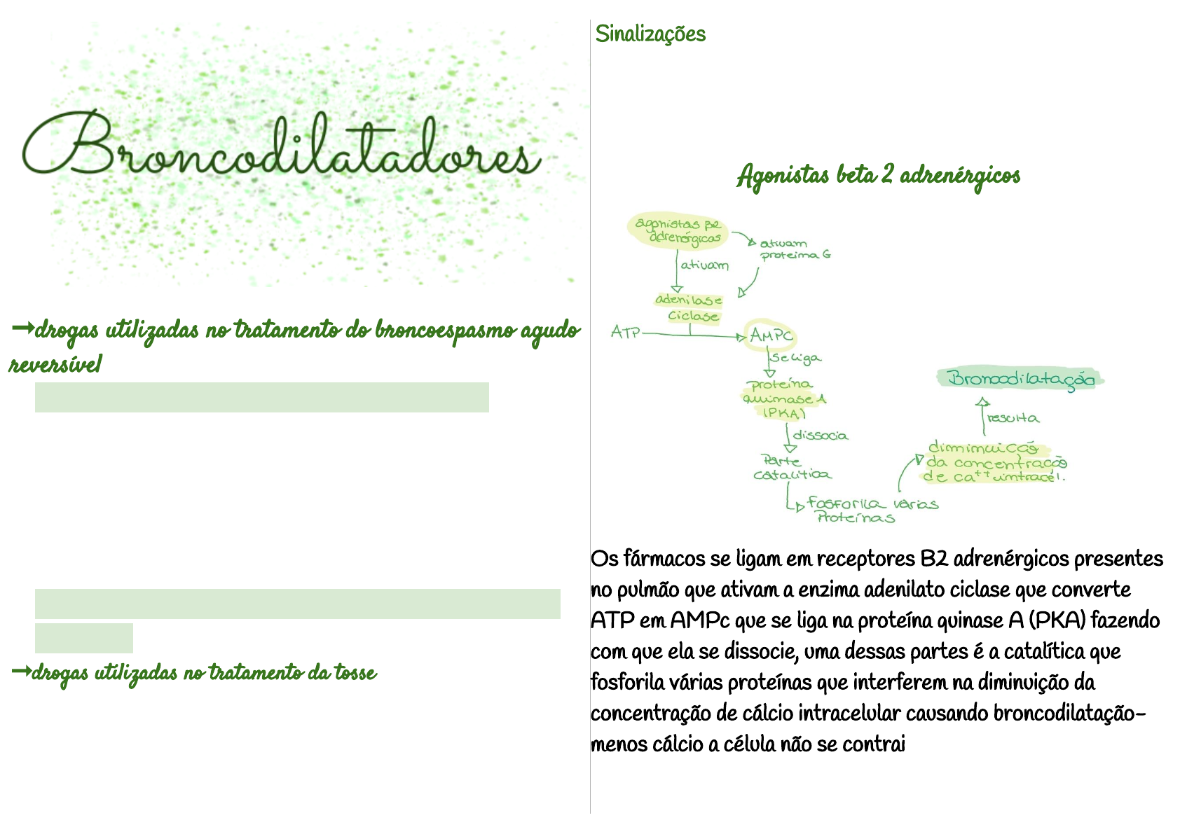 ➞drogas utilizadas no tratamento do broncoespasmo agudo reversível - agonistas B2 adrenérgicos- presente no pulmão - salbutamol - fenoterol - bambuterol - terbutalina - clembuterol (equinos) - anticolinérgicos (antagonistas colinérgicos muscarínicos) - xantinas ➞drogas utilizadas no tratamento da tosse - antitussígenos - mucolíticos - expectorantes Sinalizações: é o conjunto de reações bioquímicas que acontecem dentro da célula a partir da ligação de um hormônio, neurotransmissor, medicamento em seu receptor e assim a célula entenderá o que deve acontecer com ela Agonistas beta 2 adrenérgicos Os fármacos se ligam em receptores B2 adrenérgicos presentes no pulmão que ativam a enzima adenilato ciclase que converte ATP em AMPc que se liga na proteína quinase A (PKA) fazendo com que ela se dissocie, uma dessas partes é a catalítica que fosforila várias proteínas que interferem na diminuição da concentração de cálcio intracelular causando broncodilatação- menos cálcio a célula não se contrai Agonistas de curta e longa duração ➞curta duração - albuterol - terbutalina - fenoterol ➞longa duração (cauda de átomos de C e H hidrofóbica que se ligam próximo a B2) - bambuterol - aformoterol - salmeterol - clembuterol *Epinefrina, isoproterenol, metaproterenol não são seletivo a B2 podendo agir em alfa e em B1, causando efeitos adversos: - tremores - hipocalcemia (potássio) - taquicardia em altas doses Xantinas (metilxantina) - broncodilatação - não agem se ligando em receptor - são inibidores enzimáticos da enzima fosfodiesterase a inibindo- A enzima fosfodiesterase é responsável por degradar AMPc, porém com a xantina inibindo sua ação o AMPc não é degradado, se ligando na proteína quinase A que se dissocia e sua parte catalitica fosrolisa varías proteínas que influenciam na diminuição de ca++ intracelular causando a broncodilatação exemplos: - teofilina - aminofilina - cafeína - teobromina