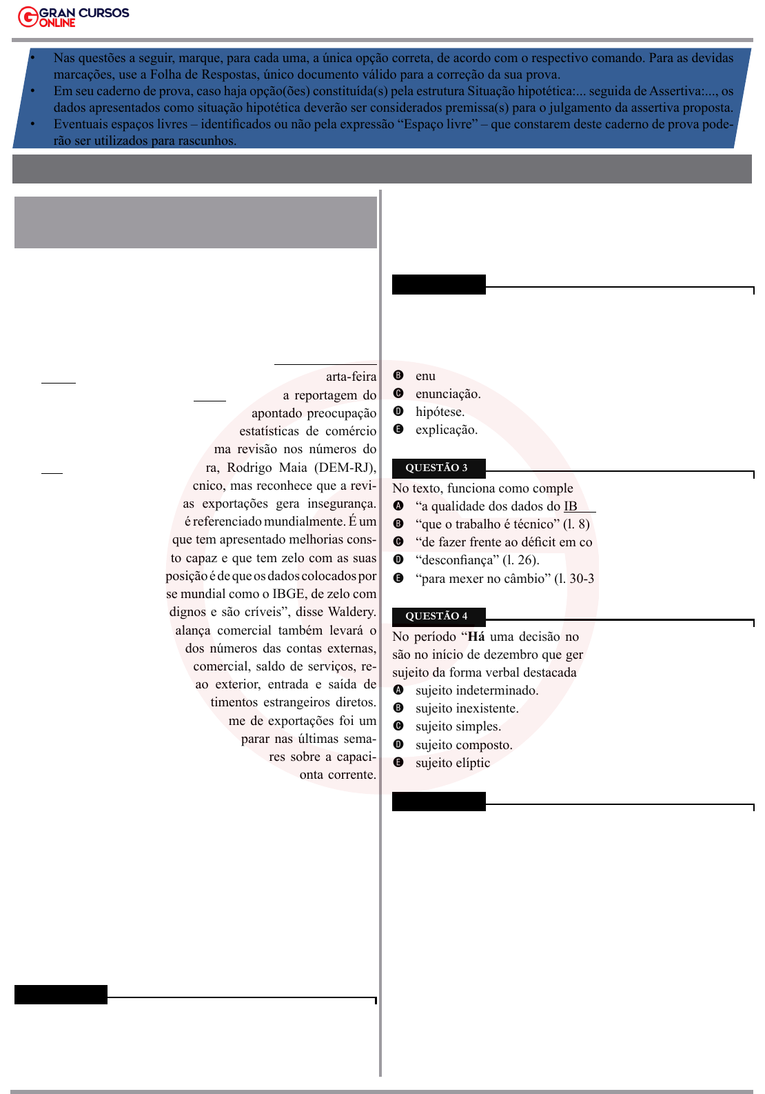 • Nas questões a seguir, marque, para cada uma, a única opção correta, de acordo com o respectivo comando. Para as devidas marcações, use a Folha de Respostas, único documento válido para a correção da sua prova. • Em seu caderno de prova, caso haja opção(ões) constituída(s) pela estrutura Situação hipotética:... seguida de Assertiva:..., os dados apresentados como situação hipotética deverão ser considerados premissa(s) para o julgamento da assertiva proposta. • Eventuais espaços livres – identificados ou não pela expressão “Espaço livre” – que constarem deste caderno de prova pode- rão ser utilizados para rascunhos. INSTITUTO BRASILEIRO DE GEOGRAFIA E ESTATÍSTICA (IBGE) � Baseado no formato de prova � aplicado pela banca Cebraspe Simulado IBGE – Recenseador LÍNGUA PORTUGUESA (LUCAS LEMOS) Governo defende dados do IBGE e diz que trabalho é referência mundial Jornal britânico apontou preocupação dos analistas com as revi- sões feitas pelo governo sobre os dados de exportações do país 1 Brasília – O secretário de Fazenda do Ministério da Eco- nomia, Waldery Rodrigues Junior, defendeu nesta quarta-feira a qualidade dos dados do IBGE, após uma reportagem do jornal britânico Financial Times ter apontado preocupação 5 de analistas com a mudança nas estatísticas de comércio exterior que poderá levar a uma revisão nos números do PIB. O presidente da Câmara, Rodrigo Maia (DEM-RJ), afirmou que o trabalho é técnico, mas reconhece que a revi- são recente de dados das exportações gera insegurança. 10 “O trabalho do IBGE é referenciado mundialmente. É um trabalho muito sólido e que tem apresentado melhorias cons- tantes. Um quadro muito capaz e que tem zelo com as suas apresentações. A nossa posição é de que os dados colocados por uma instituição de classe mundial como o IBGE, de zelo com 15 as estatísticas, são fidedignos e são críveis”, disse Waldery. � A retificação da balança comercial também levará o Banco Central à revisão dos números das contas externas, indicador que inclui saldo comercial, saldo de serviços, re- messas líquidas de renda ao exterior, entrada e saída de 20 aplicações financeiras e investimentos estrangeiros diretos. Nos últimos meses, o baixo volume de exportações foi um dos fatores que fizeram o dólar disparar nas últimas sema- nas, diante da preocupação de investidores sobre a capaci- dade do Brasil de fazer frente ao déficit em conta corrente. 25 “Há uma decisão no final de setembro e uma deci- são no início de dezembro que geram desconfiança. A gente tem que tomar um certo cuidado porque o tema do câmbio é muito sensível. Uma revisão tão rápida gera inse- gurança”, admitiu Rodrigo Maia. “O trabalho é técnico, 30 não tem influência política, não tem pressão para mexer no câmbio, para segurar câmbio”, concluiu o deputado. Disponível em https://exame.abril.com.br/economia/governo- -defende-dados-do-ibge-e-diz-que-trabalho-e-referencia-mun- dial/ (Acesso em 11/03/2020) QUESTÃO 1 Com relação a gênero e tipologia textuais, é correto considerar o texto como A uma peça publicitária construída em torno de uma narrativa. B uma notícia caracterizada pela descrição. C uma reportagem em que predomina a exposição. D um artigo que combina narração com descrição. E uma crônica baseada em uma narrativa. QUESTÃO 2 No trecho “O presidente da Câmara, Rodrigo Maia (DEM-RJ), afirmou que o trabalho é técnico” (l. 7-8), as vírgulas foram utili- zadas para marcar uma A ressalva. B enumeração. C enunciação. D hipótese. E explicação. QUESTÃO 3 No texto, funciona como complemento nominal o trecho: A “a qualidade dos dados do IBGE” (l. 3). B “que o trabalho é técnico” (l. 8). C “de fazer frente ao déficit em conta corrente” (l. 24). D “desconfiança” (l. 26). E “para mexer no câmbio” (l. 30-31). QUESTÃO 4 No período “Há uma decisão no final de setembro e uma deci- são no início de dezembro que geram desconfiança.” (l. 25-26), o sujeito da forma verbal destacada é conhecido como A sujeito indeterminado. B sujeito inexistente. C sujeito simples. D sujeito composto. E sujeito elíptico. QUESTÃO 5 No trecho “levará o Banco Central à revisão dos números” (l. 16-17), quanto ao emprego do acento grave: A Trata-se de um acento proibido. B Trata-se de um acento opcional. C Seria obrigatório, caso fosse inserido o pronome “aquela” an- tes da palavra “revisão”. D Seria obrigatório, caso fosse inserido o pronome “esta” antes da palavra “revisão”. E O acento indicativo de crase deveria ser mantido, caso o vocá- bulo “revisão” fosse empregado no plural. https://exame.abril.com.br/noticias-sobre/ministerio-da-economia https://exame.abril.com.br/noticias-sobre/ministerio-da-economia https://exame.abril.com.br/noticias-sobre/ibge/ https://exame.abril.com.br/noticias-sobre/pib https://exame.abril.com.br/noticias-sobre/ibge/ Simulado IBGE – Recenseador QUESTÃO 6 Em “Nos últimos meses, o baixo volume de exportações foi um dos fatores” (l. 21-22), a vírgula foi empregada para A marcar uma enumeração. B deslocar um adjunto adverbial. C isolar um aposto. D indicar um vocativo. E iniciar a citação de outra voz. QUESTÃO 7 No que se refere à relação de subordinação entre orações, assinale a alternativa que classifica a oração sublinhada em “Há uma deci- são no final de setembro e uma decisão no início de dezembro que geram desconfiança.” (l. 25-26). A Oração subordinada adjetiva restritiva. B Oração subordinada adverbial concessiva. C Oração subordinada adjetiva explicativa. D Oração subordinada adverbial final. E Oração subordinada substantiva subjetiva. QUESTÃO 8 No trecho “O presidente da Câmara, Rodrigo Maia (DEM-RJ), afirmou que o trabalho é técnico.” (l. 7-8), a oração destacada é A subordinada substantiva subjetiva
