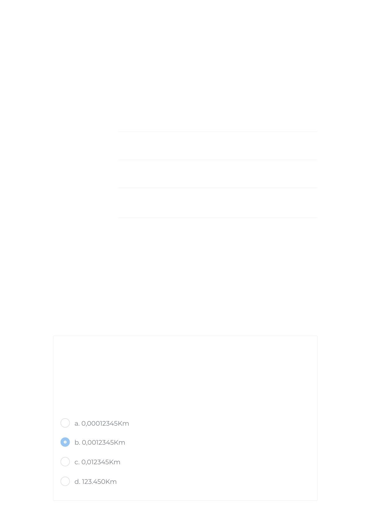 07/05/2021 Atividade 01 https://ava.politecnicabr.com.br/mod/quiz/review.php?attempt=955155 1/4 Painel / Cursos / 20A127 / Aula 01 / Atividade 01 Matemática Aplicada Iniciado em quarta, 6 Jan 2021, 11:58 Estado Finalizada Concluída em quarta, 6 Jan 2021, 12:01 Tempo empregado 3 minutos 36 segundos Avaliar 10,00 de um máximo de 10,00(100%) Questão 1 Completo Atingiu 2,00 de 2,00 Transforme 123,45 cm em Km. Escolha uma opção: a. 0,00012345Km b. 0,0012345Km c. 0,012345Km d. 123.450Km https://ava.politecnicabr.com.br/my/ https://ava.politecnicabr.com.br/course/index.php https://ava.politecnicabr.com.br/course/view.php?id=964 https://ava.politecnicabr.com.br/course/view.php?id=964#section-2 https://ava.politecnicabr.com.br/mod/quiz/view.php?id=25951 https://ava.politecnicabr.com.br/ 07/05/2021 Atividade 01 https://ava.politecnicabr.com.br/mod/quiz/review.php?attempt=955155 2/4 Questão 2 Completo Atingiu 2,00 de 2,00 Transforme 1,463 dam em cm. Escolha uma opção: Questão 3 Completo Atingiu 2,00 de 2,00 Transforme 33,55 m² em km². Escolha uma opção: a. 14,63cm b. 146,3cm c. 14.630cm d. 1.463cm a. 0,00033555Km² b. 0,03355Km² c. 0,00003355Km² d. 0,000003355Km² https://ava.politecnicabr.com.br/ 07/05/2021 Atividade 01 https://ava.politecnicabr.com.br/mod/quiz/review.php?attempt=955155 3/4 Questão 4 Completo Atingiu 2,00 de 2,00 Transforme 978m em km. Escolha uma opção: Questão 5 Completo Atingiu 2,00 de 2,00 Transforme 54321 cm² em km². Escolha uma opção: a. 9,78Km b. 0,00978Km c. 0,978Km d. 97,8Km a. 0,00000054321Km² b. 0,000054321Km² c. 0,00054321Km² d. 0,0000054321Km² https://ava.politecnicabr.com.br/ 07/05/2021 Atividade 01 https://ava.politecnicabr.com.br/mod/quiz/review.php?attempt=955155 4/4 © 2020 - Escola Politécnica Brasileira Entre em Contato https://www.politecnicabr.com.br 0800 084 2627 indisponível devido a pandemia de COVID-19, use outro canal! 0800 084 2627 comercial@politecnicabr.com.br Links Úteis Dicas da nossa Diretora Acadêmica Planner de Estudos Declaração de Matrícula Orientações do AVA Abertura de Ticket Fale com o Tutor Cronograma de Estudos Solicitação de Diploma Manual de Estágio Manual de Competência Siga-nos nas redes sociais https://ava.politecnicabr.com.br/mod/quiz/0 https://www.politecnicabr.com.br/ mailto:comercial@politecnicabr.com.br https://soundcloud.com/user-501638417/sets/escola-politecnica-brasileira https://storage.googleapis.com/sirius-pubstore/semestre_plannerdeestudo%20poli.pdf https://storage.googleapis.com/sirius-pubstore/declaracao_matricula.pdf https://storage.googleapis.com/sirius-pubstore/orientacoes_ava.pdf https://storage.googleapis.com/sirius-pubstore/abertura_ticket.pdf https://storage.googleapis.com/sirius-pubstore/fale_com_tutor.pdf https://storage.googleapis.com/sirius-pubstore/cronograma_estudos.pdf https://storage.googleapis.com/sirius-pubstore/solicitacao_diploma.pdf https://storage.googleapis.com/sirius-pubstore/manual_estagio.pdf https://storage.googleapis.com/sirius-pubstore/manual_competencia.pdf https://www.facebook.com/politecnicabr https://www.instagram.com/politecnicabr_oficial https://ava.politecnicabr.com.br/