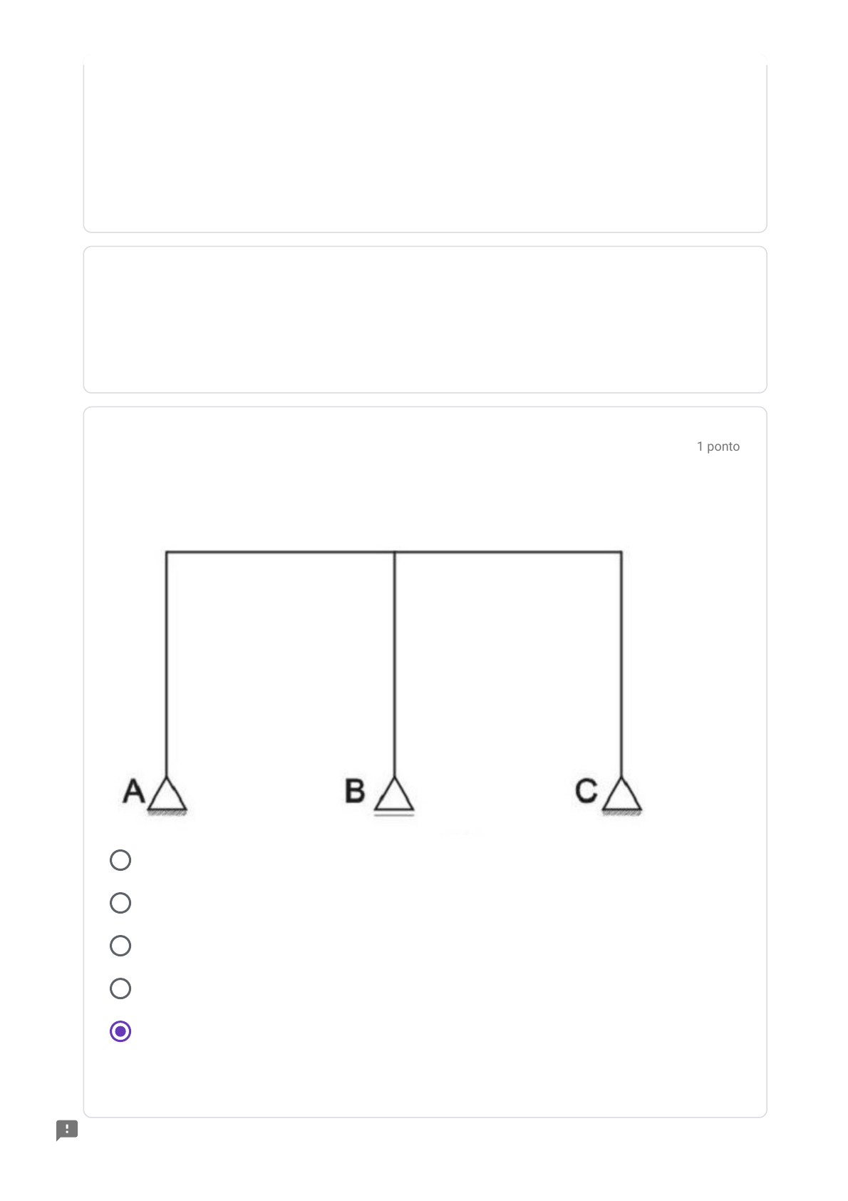 07/05/2021 Teoria das Estruturas - 2021/1 https://docs.google.com/forms/d/e/1FAIpQLSei-UpPj8_KXGv5DvvqvXEI1SNV-J1dNX5zr-e0xZ2EUNBu4A/viewform 1/19 E-mail * 1 ponto O apoio B é um vínculo externo de 2.º Gênero; O grau de liberdade do apoio A é igual a 2. A estrutura tem grau de hiperestaticidade interna igual a 2. O grau de hiperestaticidade externa da estrutura é igual a 5. A estrutura é hiperestática, com grau de hiperestacidade total igual a 2. Teoria das Estruturas - 2021/1 Prova Teórica - PT2 - Prof. Enio Ricardo Dorvil Coelho *Obrigatório liz.franciele@gmail.com Considerando a figura abaixo, que ilustra um pórtico plano, assinale a opção correta a respeito das características dos apoios e do conjunto da estrutura. Limpar seleção 07/05/2021 Teoria das Estruturas - 2021/1 https://docs.google.com/forms/d/e/1FAIpQLSei-UpPj8_KXGv5DvvqvXEI1SNV-J1dNX5zr-e0xZ2EUNBu4A/viewform 2/19 1 ponto Certo Errado 1 ponto Assinale a alternativa que contém a sequencia de alternativas corretas: I e II II e III I e III Todas estão Corretas Todas estão Erradas. A respeito de estruturas isostáticas e hiperestáticas, podemos afirma que : Uma Estrutura isostática é considerada instável, pois depende do tipo de carregamento para garantir o seu equilíbrio. * Esta afirmativa está? Com relação ao cálculo das Reações em uma grelha, analise as alternativas abaixo: * 07/05/2021 Teoria das Estruturas - 2021/1 https://docs.google.com/forms/d/e/1FAIpQLSei-UpPj8_KXGv5DvvqvXEI1SNV-J1dNX5zr-e0xZ2EUNBu4A/viewform 3/19 1 ponto I. Ponto de força concentrada vertical gera uma descontinuidade no diagrama de força cortante igual à força concentrada vertical. II. Ponto de força concentrada axial gera uma descontinuidade no diagrama de força axial igual à força concentrada axial. III. Ponto de momento concentrado gera uma descontinuidade no diagrama de momento �etor igual ao momento concentrado. Em relação ao Exposto: As afirmativas I e II estão corretas. As afirmativas II e III estão corretas. As afirmativas I e III estão é correta. Apenas a afirmativa I está correta. Todas as alternativas estão corretas. A partir dos diagramas de força axial(normal), força cortante e momento fletor apresentados para os carregamentos a seguir, é possível afirmar: * 07/05/2021 Teoria das Estruturas - 2021/1 https://docs.google.com/forms/d/e/1FAIpQLSei-UpPj8_KXGv5DvvqvXEI1SNV-J1dNX5zr-e0xZ2EUNBu4A/viewform 4/19 1 ponto V/ V/ V/ V F/ F/ V/ V V/ F/ V/ F F/ F/ F/ F V/ V/ F/ F 1 ponto 2 4 3 5 1 Com relação à estaticidade e estabilidade de uma estrutura, marque V para verdadeiro ou F para falso e, em seguida, assinale a alternativa que apresenta a sequência correta. * Em uma estrutura tipo grelha, o número de graus de liberdade por nó é igual a: Limpar seleção 07/05/2021 Teoria das Estruturas - 2021/1 https://docs.google.com/forms/d/e/1FAIpQLSei-UpPj8_KXGv5DvvqvXEI1SNV-J1dNX5zr-e0xZ2EUNBu4A/viewform 5/19 1 ponto Certo Errado 1 ponto Assinale a alternativa com a sequencia de informações corretas; I e II; II, III e IV II e IV III e IV II e IV. A figura a seguir apresenta corretamente o diagrama de esforços cortantes de uma viga contínua, submetida a um carregamento uniformemente distribuído, com intensidade constante ao longo de todo o seu comprimento. Limpar seleção Em estruturas aporticadas planas, os esforços internos, são definidos a partir de um sistema de Coordenadas Locais para cada barra, assim, podemos afirmar, que os esforços nas extremidades de barras ortogonais, guardam as seguintes relações: * 07/05/2021 Teoria das Estruturas - 2021/1 https://docs.google.com/forms/d/e/1FAIpQLSei-UpPj8_KXGv5DvvqvXEI1SNV-J1dNX5zr-e0xZ2EUNBu4A/viewform 6/19 1 ponto GH=0 GH=1 GH=2 GH=3 GH=6 Assinale a alternativa que identifica o grau de Hiperestaticidade do Pórtico abaixo: * 07/05/2021 Teoria das Estruturas - 2021/1 https://docs.google.com/forms/d/e/1FAIpQLSei-UpPj8_KXGv5DvvqvXEI1SNV-J1dNX5zr-e0xZ2EUNBu4A/viewform 7/19 1 ponto A B C D E Os esforços do pórtico mostrado na figura devem ser determinados utilizando o método das forças. Assinale, entre as opções apresentadas abaixo, o sistema principal isostático da estrutura: * 07/05/2021 Teoria das Estruturas - 2021/1 https://docs.google.com/forms/d/e/1FAIpQLSei-UpPj8_KXGv5DvvqvXEI1SNV-J1dNX5zr-e0xZ2EUNBu4A/viewform 8/19 E 1 ponto Com relação à situação apresentada, avalie as a�rmações a seguir. I. O momento �etor na extremidade da barra horizontal (ponto E) vale M = 15 kN.m. II. O módulo de elasticidade e as medidas da seção transversal não in�uenciam na determinação dos esforços nas barras, por se tratar de uma estrutura isostática. III. A força P1 faz com que a barra AC �que submetida à �exão oblíqua. IV. O diagrama de esforços axiais na barra CE é nulo. É correto apenas o que se a�rma em: I e II I e III lI e IV l, III II, III e IV A figura abaixo representa uma estrutura plana, na qual as forças P1 e P2 têm módulos iguais a 5 kN e 10 kN, respectivamente. * 07/05/2021 Teoria das Estruturas - 2021/1 https://docs.google.com/forms/d/e/1FAIpQLSei-UpPj8_KXGv5DvvqvXEI1SNV-J1dNX5zr-e0xZ2EUNBu4A/viewform 9/19 1 ponto Com base nestas informações, podemos dizer que o Digrama de Momento Fletor representa esquematicamente o Portico: Certo Errado O desenho abaixo mostra um pórtico plano rígido, com peso desprezível, rotulado no centro do vão horizontal e submetido a um carregamento uniformemente distribuído,não nulo, com intensidade q e seu respectivo diagrama de Momento Fletor. * 07/05/2021 Teoria das Estruturas - 2021/1 https://docs.google.com/forms/d/e/1FAIpQLSei-UpPj8_KXGv5DvvqvXEI1SNV-J1dNX5zr-e0xZ2EUNBu4A/viewform 10/19 1 ponto A B C D E Qual das estruturas a seguir é isostática: * 07/05/2021 Teoria das Estruturas - 2021/1 https://docs.google.com/forms/d/e/1FAIpQLSei-UpPj8_KXGv5DvvqvXEI1SNV-J1dNX5zr-e0xZ2EUNBu4A/viewform 11/19 1 ponto Grelhas com dois apoios do primeiro gênero, são isostát