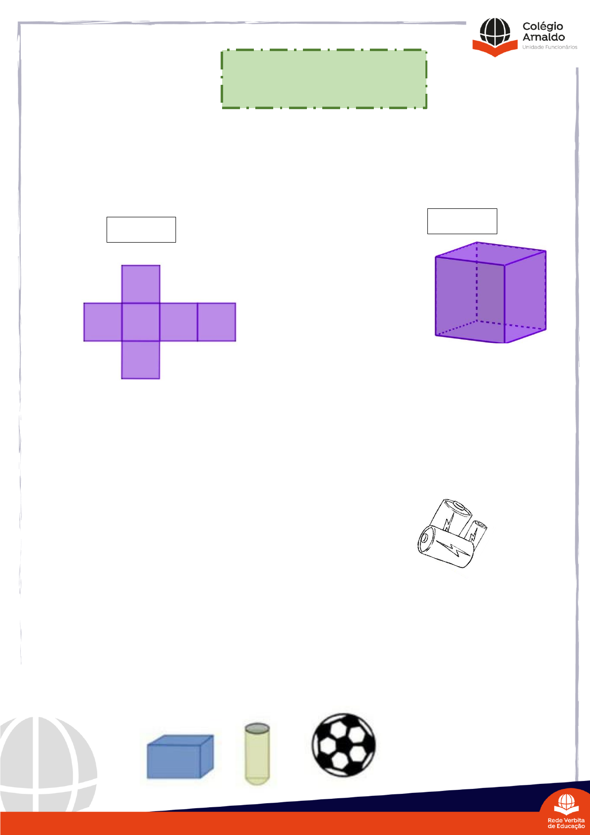1. OBSERVE as figuras abaixo. A figura 1 é a planificação da figura 2, o cubo. Com base na planificação da figura 2, podemos dizer que um cubo possui: a) 4 faces b) 3 faces c) 8 faces d) 6 faces 2. Esta pilha de lanterna tem, aproximadamente, a forma: a) de pirâmide b) do cubo c) do cilindro d) da esfera 3. Em uma das aulas de matemática, aprendi sobre os poliedros e os corpos redondos. Em seguida, fui ao supermercado. Lá comprei uma caixa de sabão em pó, uma lata de óleo e uma bola. No caixa percebi que os três produtos tinham, respectivamente, a forma de: a) cubo, cone e circunferência. b) Paralelepípedo, cone e esfera. c) Cubo, cilindro e circunferência. d) Paralelepípedo, cilindro e esfera. ROTEIRO DE ESTUDO MATEMÁTICA FIGURA 1 FIGURA 2