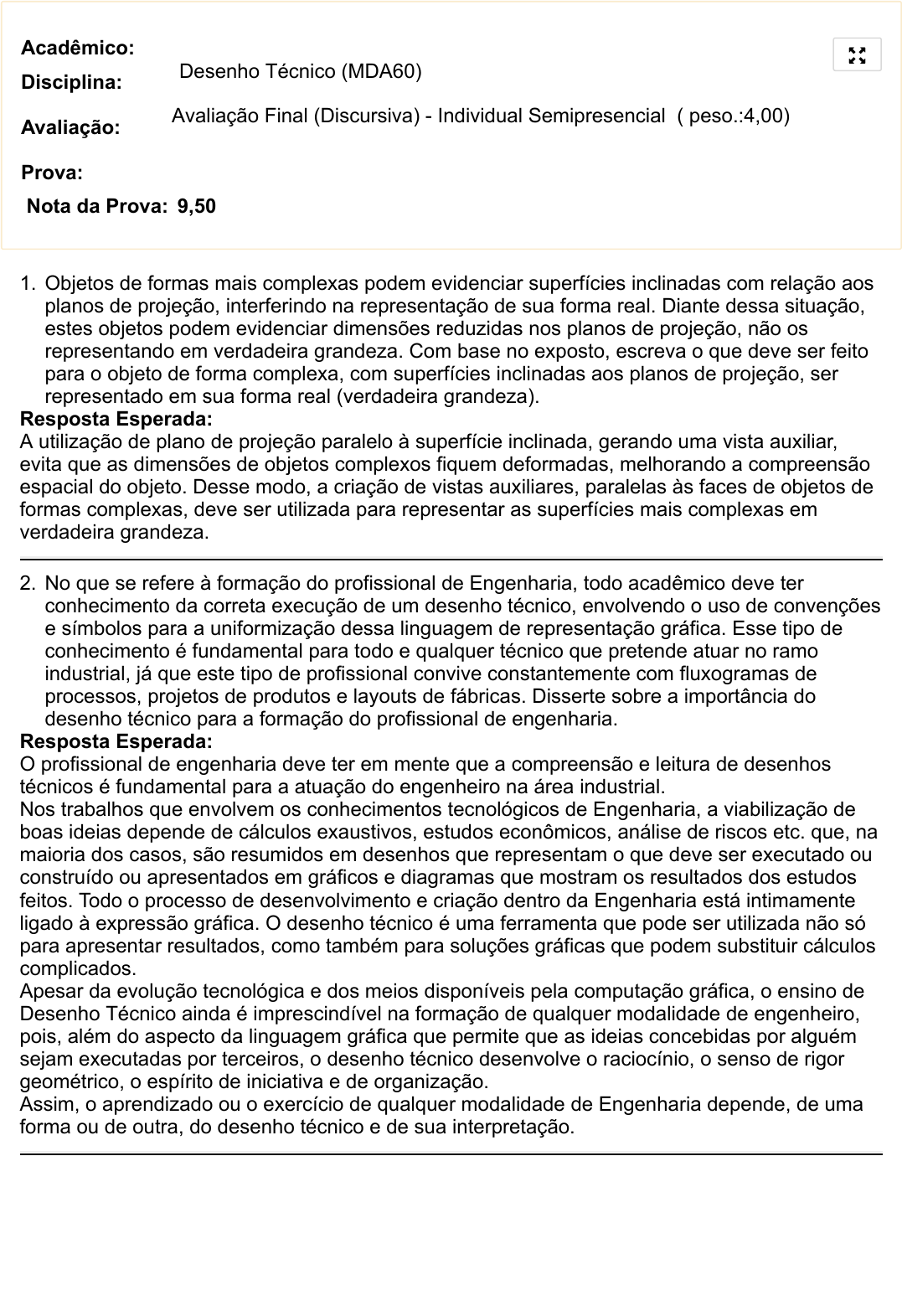 Acadêmico: Disciplina: Desenho Técnico (MDA60) Avaliação: Avaliação Final (Discursiva) - Individual Semipresencial ( peso.:4,00) Prova: Nota da Prova: 9,50 1. Objetos de formas mais complexas podem evidenciar superfícies inclinadas com relação aos planos de projeção, interferindo na representação de sua forma real. Diante dessa situação, estes objetos podem evidenciar dimensões reduzidas nos planos de projeção, não os representando em verdadeira grandeza. Com base no exposto, escreva o que deve ser feito para o objeto de forma complexa, com superfícies inclinadas aos planos de projeção, ser representado em sua forma real (verdadeira grandeza). Resposta Esperada: A utilização de plano de projeção paralelo à superfície inclinada, gerando uma vista auxiliar, evita que as dimensões de objetos complexos fiquem deformadas, melhorando a compreensão espacial do objeto. Desse modo, a criação de vistas auxiliares, paralelas às faces de objetos de formas complexas, deve ser utilizada para representar as superfícies mais complexas em verdadeira grandeza. 2. No que se refere à formação do profissional de Engenharia, todo acadêmico deve ter conhecimento da correta execução de um desenho técnico, envolvendo o uso de convenções e símbolos para a uniformização dessa linguagem de representação gráfica. Esse tipo de conhecimento é fundamental para todo e qualquer técnico que pretende atuar no ramo industrial, já que este tipo de profissional convive constantemente com fluxogramas de processos, projetos de produtos e layouts de fábricas. Disserte sobre a importância do desenho técnico para a formação do profissional de engenharia. Resposta Esperada: O profissional de engenharia deve ter em mente que a compreensão e leitura de desenhos técnicos é fundamental para a atuação do engenheiro na área industrial. Nos trabalhos que envolvem os conhecimentos tecnológicos de Engenharia, a viabilização de boas ideias depende de cálculos exaustivos, estudos econômicos, análise de riscos etc. que, na maioria dos casos, são resumidos em desenhos que representam o que deve ser executado ou construído ou apresentados em gráficos e diagramas que mostram os resultados dos estudos feitos. Todo o processo de desenvolvimento e criação dentro da Engenharia está intimamente ligado à expressão gráfica. O desenho técnico é uma ferramenta que pode ser utilizada não só para apresentar resultados, como também para soluções gráficas que podem substituir cálculos complicados. Apesar da evolução tecnológica e dos meios disponíveis pela computação gráfica, o ensino de Desenho Técnico ainda é imprescindível na formação de qualquer modalidade de engenheiro, pois, além do aspecto da linguagem gráfica que permite que as ideias concebidas por alguém sejam executadas por terceiros, o desenho técnico desenvolve o raciocínio, o senso de rigor geométrico, o espírito de iniciativa e de organização. Assim, o aprendizado ou o exercício de qualquer modalidade de Engenharia depende, de uma forma ou de outra, do desenho técnico e de sua interpretação.