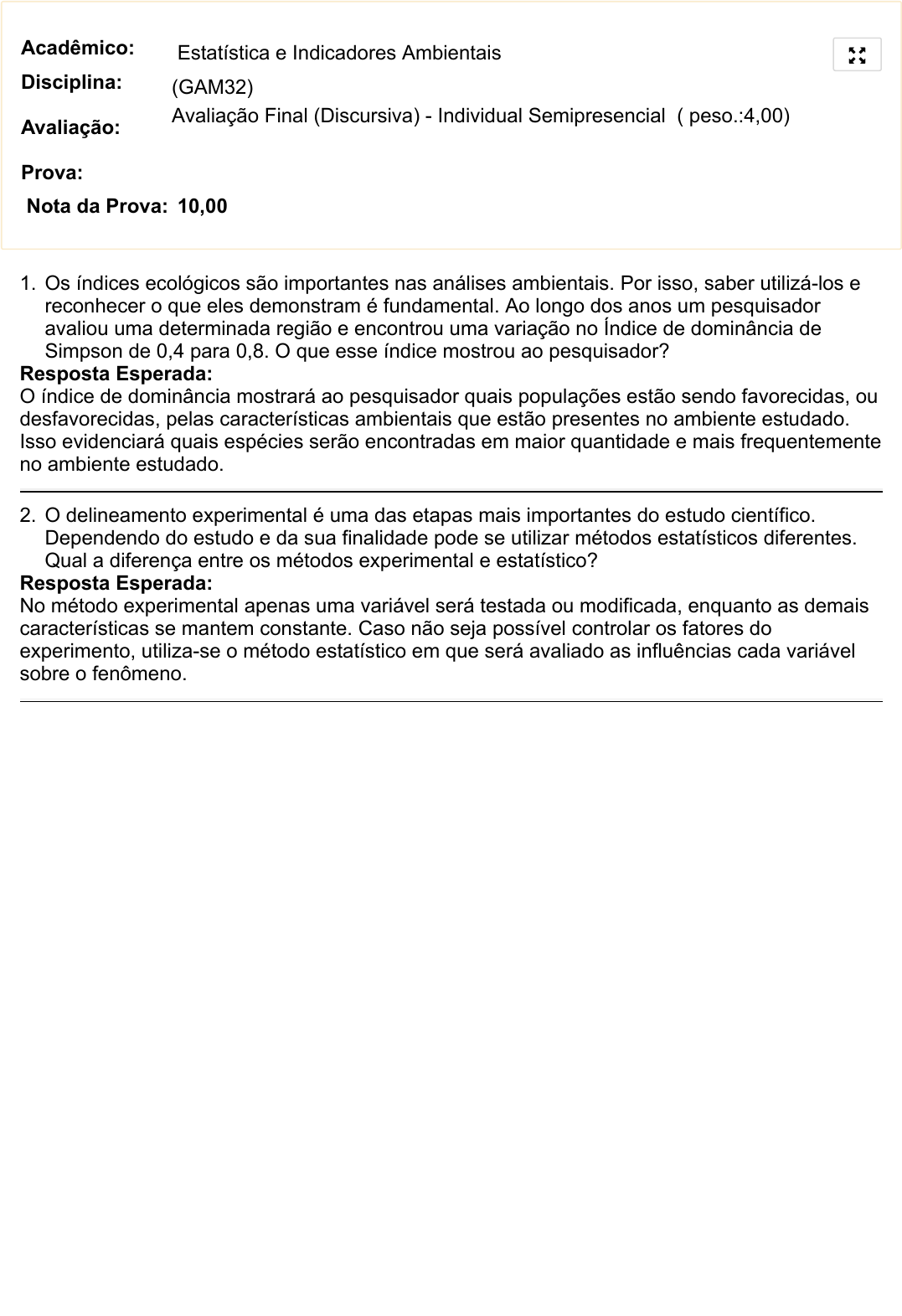 Acadêmico: Disciplina: Estatística e Indicadores Ambientais (GAM32) Avaliação: Avaliação Final (Discursiva) - Individual Semipresencial ( peso.:4,00) Prova: Nota da Prova: 10,00 1. Os índices ecológicos são importantes nas análises ambientais. Por isso, saber utilizá-los e reconhecer o que eles demonstram é fundamental. Ao longo dos anos um pesquisador avaliou uma determinada região e encontrou uma variação no Índice de dominância de Simpson de 0,4 para 0,8. O que esse índice mostrou ao pesquisador? Resposta Esperada: O índice de dominância mostrará ao pesquisador quais populações estão sendo favorecidas, ou desfavorecidas, pelas características ambientais que estão presentes no ambiente estudado. Isso evidenciará quais espécies serão encontradas em maior quantidade e mais frequentemente no ambiente estudado. 2. O delineamento experimental é uma das etapas mais importantes do estudo científico. Dependendo do estudo e da sua finalidade pode se utilizar métodos estatísticos diferentes. Qual a diferença entre os métodos experimental e estatístico? Resposta Esperada: No método experimental apenas uma variável será testada ou modificada, enquanto as demais características se mantem constante. Caso não seja possível controlar os fatores do experimento, utiliza-se o método estatístico em que será avaliado as influências cada variável sobre o fenômeno.