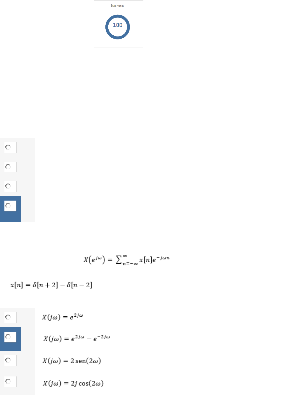 APOL 4 SINAIS E SISTEMAS (MSB) Para as seguintes afirmações: 1. A banda de rejeição de um filtro é aquela faixa onde as frequências são atenuadas ou rejeitadas. 2. Em um sistema LIT são sistemas que limitam amplitude de determinados sinais. 3. Um filtro ideal tem amplitude infinita. 4. A resposta em fase do filtro interfere na forma de onda do sinal resultante. assinale a opção correta: A 1 e 2 B 1 e 3 C 2, 3 e 4 D 1 e 4 ___________________________ Use a equação de análise: para calcular a transformada da função seguinte: Assinale a opção correta: A B C D E ________________________________________________________________ A transformada de Fourier de qualquer sinal é . Para a seguinte função, qual será a transformada de Fourier correspondente? Se for necessário use as propriedades da transformada de Fourier listadas na Tabela 4.1 da página 190 do livro texto. A B C D E __________________________________________________________ Use a equação de análise: para calcular a transformada da função seguinte: Assinale a opção correta: A B C D E _______________________________________ Para as seguintes afirmações: 1. A banda de rejeição de um filtro é aquela faixa onde as frequências são atenuadas ou rejeitadas. 2. Em um sistema LIT são sistemas que limitam amplitude de determinados sinais. 3. Um filtro ideal tem amplitude infinita. 4. A resposta em fase do filtro interfere na forma de onda do sinal resultante. assinale a opção correta: A 1 e 2 B 1 e 3 C 2, 3 e 4 D 1 e 4 E 1, 3 e 4