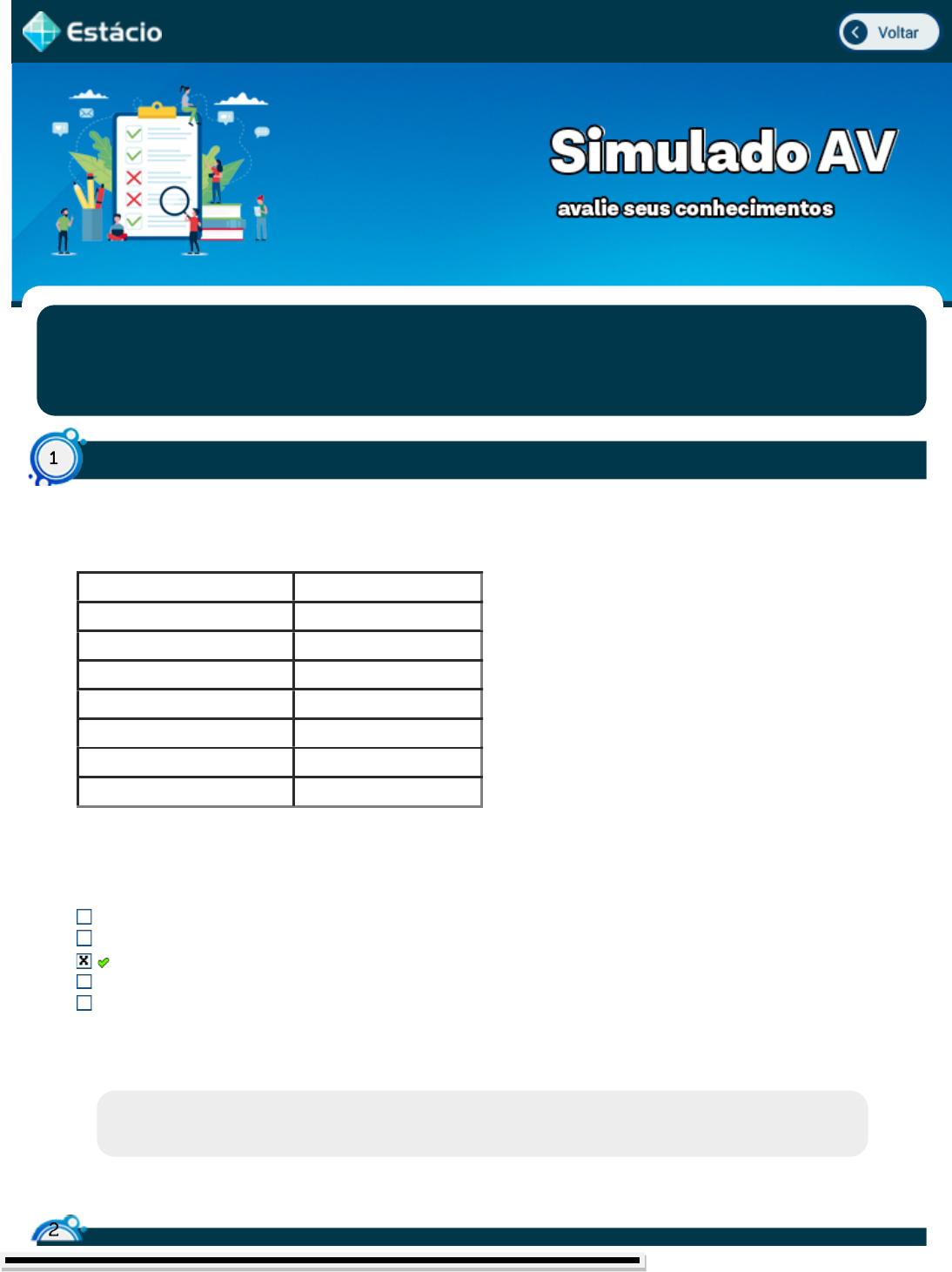 09/05/2021 Estácio: Alunos https://simulado.estacio.br/alunos/?p0=76158630&user_cod=2564141&matr_integracao=202001166564 1/5 1a Questão Acerto: 1,0 / 1,0 Disc.: ANÁLISE DE DADOS Aluno(a): XXXXXXXX XXXXXXXXXXXXXXXXXXx Acertos: 10,0 de 10,0 05/05/2021 Um levantamento realizado em um clube com relação a quantidade de filhos de seus associados forneceu a seguinte distribuição de frequências: Quantidade de filhos Número de sócios 0 400 1 300 2 200 3 80 4 10 5 10 Total 1.000 A média aritmética (quantidade de filhos por socio), a mediana e a moda correspondentes a essa distribuição são, respectivamente: 1,03; 1,50 e 1,00 1,03; 1,00 e 1,00 1,03; 1,00 e 0,00 1,00; 1,00 e 1,00 1,00; 0,50 e 0,00 Respondido em 05/05/2021 21:18:24 Explicação: Resposta correta: 1,03; 1,00 e 0,00 2a 09/05/2021 Estácio: Alunos https://simulado.estacio.br/alunos/?p0=76158630&user_cod=2564141&matr_integracao=202001166564 2/5 Explicação: Resposta correta: Mediana 3a Questão Acerto: 1,0 / 1,0 Explicação: A resposta correta é: 1/9. 4a Questão Acerto: 1,0 / 1,0 As medidas citadas adiante descrevem uma amostra obtida em um experimento aleatório. A única que mede a dispersão da amostra é: Média geométrica Média aritmética Desvio-padrão Mediana Moda Respondido em 05/05/2021 21:22:20 Uma urna contém 10 bolas numeradas de 1 a 10. Foram sacadas, sucessivamente e sem reposição, 2 dessas bolas. A probabilidade de a primeira bola ter um número par e a segunda ter um número múltiplo de 5 é igual a: 1/20 1/18 1/10 7/90 1/9 Respondido em 05/05/2021 21:24:42 Em uma caixa, há 3 moedas: 2 são honestas, e 1 tem 3 vezes mais probabilidade de dar cara do que de dar coroa. Uma moeda é selecionada aleatoriamente da caixa e é lançada sucessivamente 2 vezes. Qual é a probabilidade da ocorrência de duas caras? 25/64 17/48 9/17 13/32 17/54 Respondido em 05/05/2021 21:27:26 Questão Acerto: 1,0 / 1,0 09/05/2021 Estácio: Alunos https://simulado.estacio.br/alunos/?p0=76158630&user_cod=2564141&matr_integracao=202001166564 3/5 5a Questão Acerto: 1,0 / 1,0 Explicação: A resposta correta é: Geométrica. 6a Questão Acerto: 1,0 / 1,0 Explicação: A resposta correta é: 32/81. 7a Questão Acerto: 1,0 / 1,0 Marque a alternativa correta em relação ao modelo probabilístico que mais se adequa ao seguinte caso: lançamento de uma moeda honesta, contando o número de casos até a realização da primeira coroa. Poisson Hipergeométrica Uniforme Discreta Geométrica Pareto Respondido em 05/05/2021 21:38:12 Considere duas variáveis aleatórias discretas X e Y, ambas com distribuição binomial. Sabe-se que: X: b (2, p) e Y: b (4, p). Se P (X ≥ 1) = 5/9 então P (Y = 1) é: 65/81 16/27 40/81 32/81 16/81 Respondido em 05/05/2021 21:33:44 Uma variável aleatória X é uniformemente distribuída no intervalo [1, 5]. A média e a variância correspondentes são, respectivamente: Explicação: A resposta correta é: 17/48 09/05/2021 Estácio: Alunos https://simulado.estacio.br/alunos/?p0=76158630&user_cod=2564141&matr_integracao=202001166564 4/5 Explicação: Resposta correta: 3 e 4/3 8a Questão Acerto: 1,0 / 1,0 Explicação: Resposta correta: 0,5 9a Questão Acerto: 1,0 / 1,0 Explicação: 3 e 3/4 2 e 2/3 2 e 1/3 3 e 4/3 3 e 1/3 Respondido em 05/05/2021 21:36:50 O tempo necessário para um medicamento contra dor fazer efeito segue um modelo com densidade Uniforme no intervalo de 5 a 15 (em minutos). Um paciente é selecionado ao acaso entre os que tomaram o remédio. A probabilidade do medicamento fazer efeito em até 10 minutos, neste paciente, é: 0,8 0,7 0,5 0,3 0,4 Respondido em 05/05/2021 21:40:26 Assinale a alternativa correta sobre aleatorização: Ela necessária para obter boas previsões Não é possível fazer uma análise utilizando regressão linear sem ela Não é possível obter causalidade sem dados experimentais Ela é crucial dentro da abordagem estrutural Ela garante que para obter o efeito causal apenas precisamos subtrair valores esperados entre quem recebeu a intervenção e quem não recebeu. Respondido em 05/05/2021 21:39:24 09/05/2021 Estácio: Alunos https://simulado.estacio.br/alunos/?p0=76158630&user_cod=2564141&matr_integracao=202001166564 5/5 10a Questão Acerto: 1,0 / 1,0 Explicação: A resposta correta é: São dados de vários indivíduos em um único período de tempo. Assinale a definição correta de dados em corte transversal (também conhecidos como cross section): São dados populacionais. São dados de vários indivíduos em vários períodos de tempo. São dados do mesmo indivíduo para múltiplos períodos de tempo. São dados de vários indivíduos em um único período de tempo. São dados obtidos de maneira aleatória. Respondido em 05/05/2021 21:39:12 A resposta correta é: Ela garante que para obter o efeito causal apenas precisamos subtrair valores esperados entre quem recebeu a intervenção e quem não recebeu.