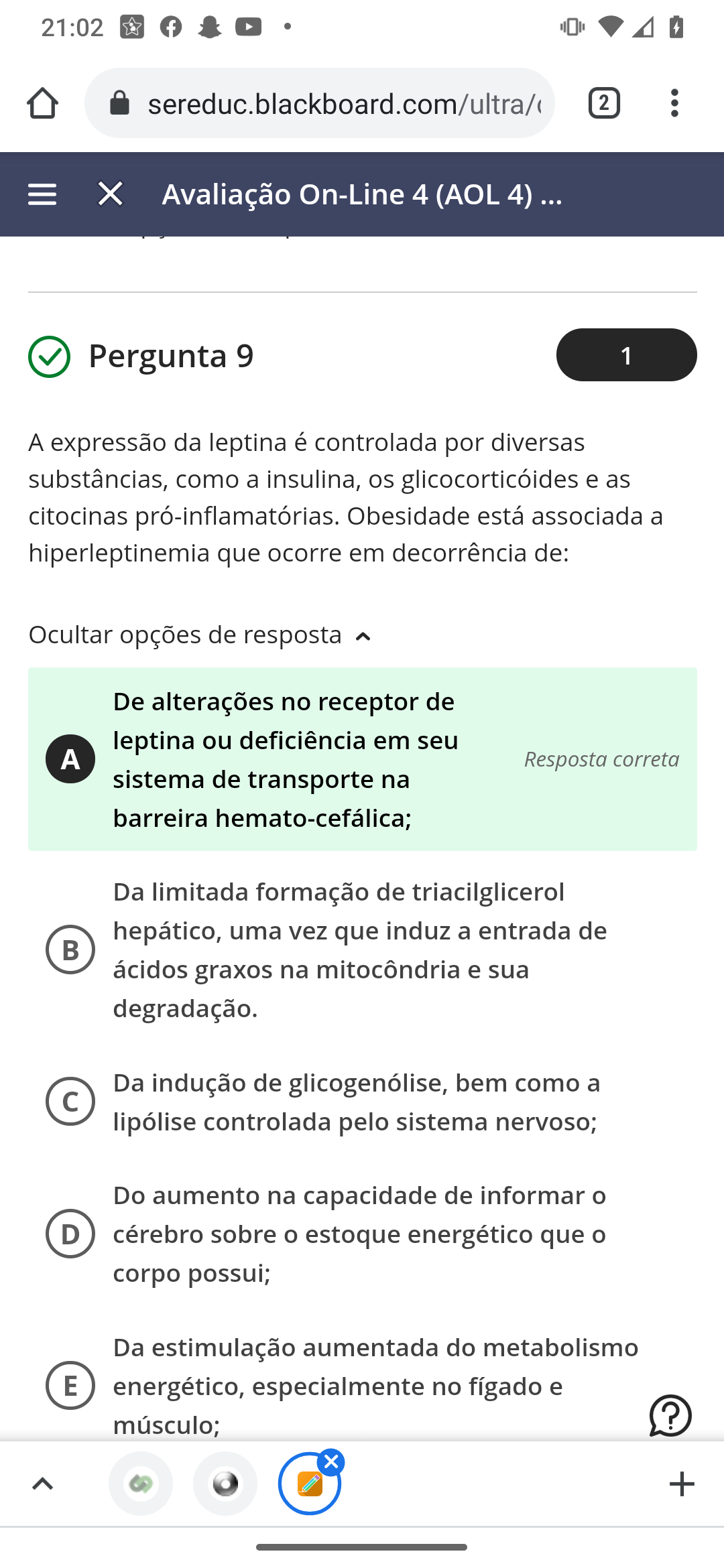 A expressão da leptina é controlada por diversas substâncias, como a insulina, os glicocorticóides e as citocinas pró-inflamatórias. Obesidade está associada a hiperleptinemia que ocorre em decorrência de: Obesidade está associada a hiperleptinemia que ocorre em decorrência de: A - De alterações no receptor de leptina ou deficiência em seu sistema de transporte na barreira hemato-cefálica; B - Da limitada formação de triacilglicerol hepático, uma vez que induz a entrada de ácidos graxos na mitocôndria e sua degradação. C - Da indução de glicogenólise, bem como a lipólise controlada pelo sistema nervoso; D - Do aumento na capacidade de informar o cérebro sobre o estoque energético que o corpo possui; E - Da estimulação aumentada do metabolismo energético, especialmente no fígado e músculo;