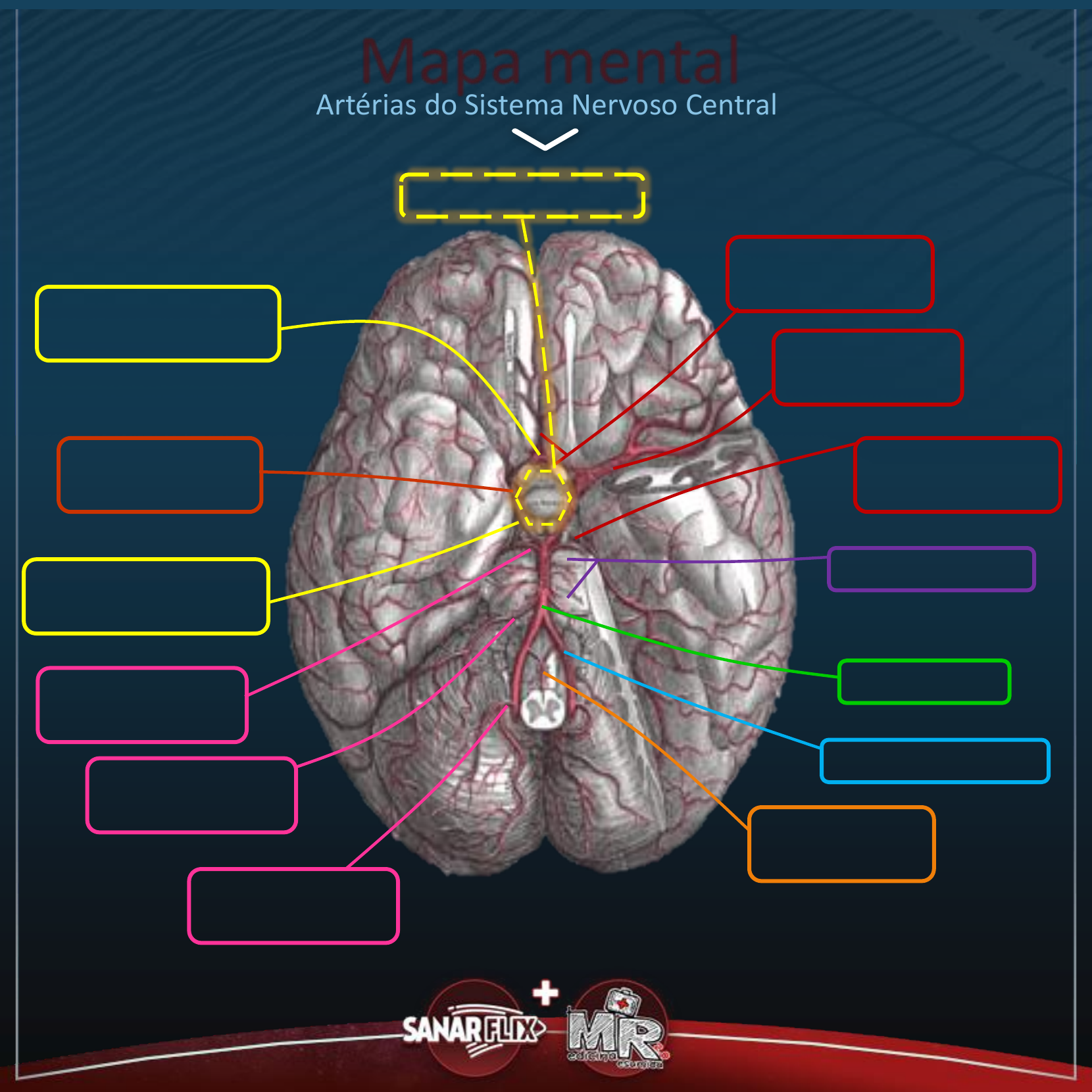 Artérias do Sistema Nervoso Central Mapa mental Artéria Comunicante Anterior Artéria Cerebral Média Artéria Cerebral Anterior Artéria Cerebral Posterior Artéria Comunicante Posterior Artéria Carótida Interna Artéria Basilar Artéria Cerebelar Inferior Anterior Artéria Cerebelar Inferior Posterior Artéria Espinal Anterior Artéria Cerebelar Superior Artérias Pontinas Artéria Vertebral Polígono de Willis