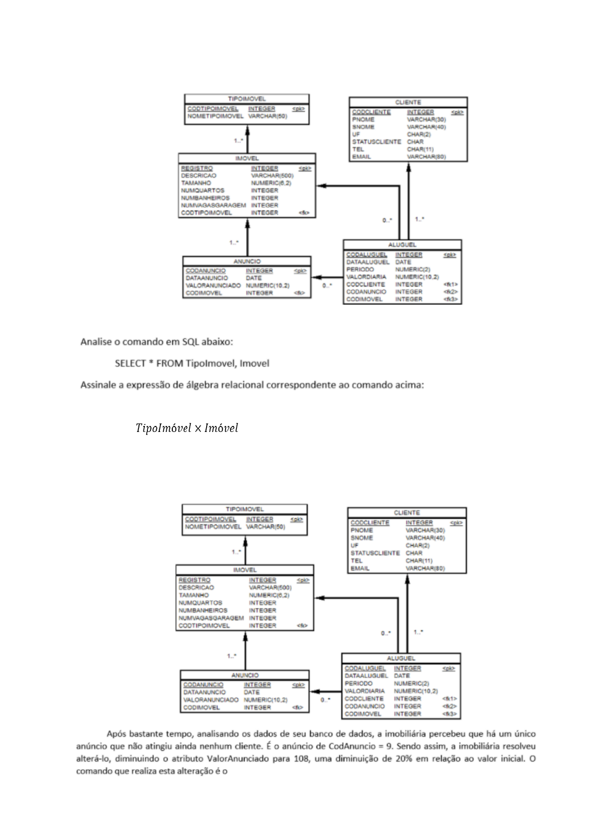 1. Uma imobiliária tem um banco de dados específico para aluguel de imóveis por temporada, conforme ilustrado no diagrama lógico relacional abaixo: Resposta: 2. Uma imobiliária tem um banco de dados específico para aluguel de imóveis por temporada, conforme ilustrado no diagrama lógico relacional abaixo: Resposta: UPDATE Anuncio SET ValorAnunciado = ValorAnunciado*0.8 WHERE CodAnuncio = 9 3. O esquema de banco de dados apresentado abaixo faz parte de um banco de dados criado a partir de um conjunto de dados públicos de captura de tubarões entre os anos de 2001 e 2013 na costa da Austrália. Características do esquema: Chave primária sublinhada e chave estrangeira em itálico. Seguem algumas tabelas do Esquema: Ordem (IDOrdem, NomeOrdem) Espécie (IDEspécie, IDOrdem. Nome_Científico, TamMaior, TamMenor, TamMédio) Nome (IDNome, IDEspécie, NomePopular) Tubarão (IDTubarão, IDEspécie, Comprimento, Sexo) Captura (NumCaptura, IDTubarão, IDLocal, Data, TempAgua) Deseja-se exibir os nomes das ordens das Espécies de Tubarões cadastradas até o identificador de espécie de número 018103, sem que os nomes se repitam. Assinale a alternativa correta abaixo: Resposta: SELECT DISTINCT nomeOrdem FROM Ordem O, Espécie E WHERE O.IDOrdem = E.IDordem AND E.IDEspécie <= 018013; 4. O comando SQL para excluir os registros da tabela Aluno, cujo campo nome comece com a letra M, é: Resposta: DELETE FROM Aluno WHERE nome LIKE M%. 5. Em SQL (Structured Query Language), as funções de agregação são muito úteis para obtenção de informação resumida sobre um resultado de um comando SELECT e também no tratamento de informações de forma agrupada (geralmente em grupos menores). No agrupamento de informações, resultados de consultas SQL, algumas cláusulas devem ser utilizadas quando se pretende restringir o conjunto de registros a ser utilizado. Nesse sentido, analise a afirmativa a seguir. Utiliza-se a cláusula ________________ sempre que se pretende restringir os registros a serem considerados na seleção. A cláusula ________________ serve para restringir os grupos que foram formados depois de aplicada a restrição da cláusula ________________." Assinale a alternativa que completa correta e sequencialmente a afirmativa anterior. Resposta: WHERE / HAVING / WHERE 6. Considere o seguinte comando SQL: SELECT D.NM_DEPARTAMENTO, SUM(P.SALARIO) FROM TB_DEPARTAMENTO D INNER JOIN TB_PROFESSOR P ON (D.COD_DEPARTAMENTO = P.COD_DEPARTAMENTO) É CORRETO afirmar: Resposta: A sintaxe do comando está incorreta, pois deveria apresentar a cláusula GROUP BY. 7. Uma imobiliária tem um banco de dados específico para aluguel de imóveis por temporada, conforme ilustrado no diagrama lógico relacional abaixo: Resposta: SELECT PNOME || || SNOME CLIENTE, VALORDIARIA, PERIODO FROM CLIENTE NATURAL JOIN ALUGUEL WHERE VALORDIARIA > (SELECT AVG(VALORDIARIA) FROM ALUGUEL); 8. Qual dos tipos de sub-consulta que faz referência a uma coluna da tabela da consulta externa? Resposta: Sub-Consulta Correlata 9. Ao implementar um sistema de gerência de fornecedores, o desenvolvedor percebeu que não existia no banco de dados relacional da empresa qualquer representação da entidade PRODUTO que aparecia em seu modelo de dados. Para corrigir essa falha, preparou um comando SQL que alteraria o esquema do banco de dados. Tal comando SQL deve ser iniciado com Resposta: CREATE TABLE PRODUTO 10. Qual a sintaxe SQL-SELECT errada? Resposta: SELECT COLUNA1, COLUNA2 FROM TABELA1 WHERE COLUNA3 LIKE (%X%) ORDER BY 3;