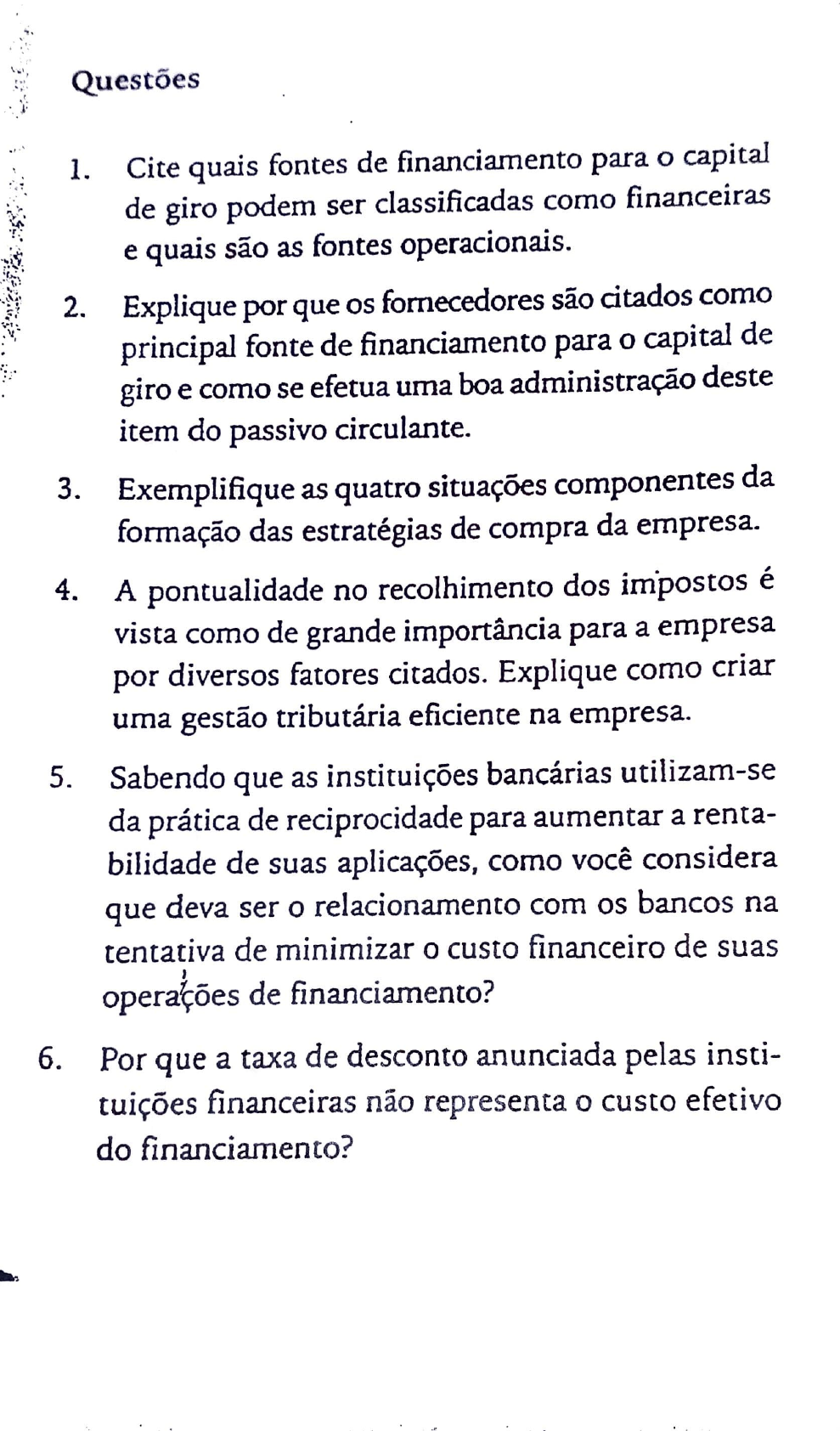 Questões Cite quais fontes de financiamento para o capital 1. de giro podem ser classificadas como financeiras e quais são as fontes operacionais. 2. Explique por que os fornecedores são citados como principal fonte de financiamento para o capital de giro e como se efetua urma boa administração deste item do passivo circulante. 2. Exemplifique as quatro situações componentes da formação das estratégias de compra da empresa. 3 4. A pontualidade no recolhimento dos impostos é vista como de grande importância para a empresa por diversos fatores citados. Explique como criar uma gestão tributária eficiente na empresa. Sabendo que as instituições bancárias utilizam-se da prática de reciprocidade para aumentar a renta- bilidade de suas aplicações, como você considera 5. que deva ser o relacionamento com os bancos na tentativa de minimizar o custo financeiro de suas operaçoes de financiamento? 6. Por que a taxa de desconto anunciada pelas insti- tuições financeiras não representao custo efetivo do financiamento0? Fontes de Financiamento para Capital de Giro 135 7. Vendor é uma modalidade de financiamento para vendas a curto prazo que pode viabilizar negócios para os quais o comprador teria dificuldades de obtenção de crédito junto à instituição financeira. Quais mecanismos tornam possível essa opera- ção? 8. O que difere o compror do vendor? 9. Um cliente deseja levantar um empr�stimo no valor de R$ 10.000,00 para ser pago em uma única parcela no final de quatro meses. Sabendo que a taxa de juros cobrada pelo banco é de 5% ao mês e que o IOF é de 1,5% ao ano, determine quanto deverá ser pago no vencimento do contrato. 10. Uma duplicata para vencimento daqui a 45 dias foi descontada pelo banco a uma taxa de desconto de 4,5% ao mês. Quanto foi depositado na conta do cliente sabendo que o valor da duplicata é de R$ 15.000,00? Qual a taxa de juros efetiva da opera- ção?