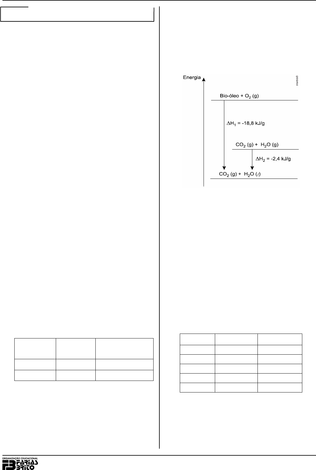 MODULO DE QUÍMICA 5 025.042 1. (Enem) Glicólise é um processo que ocorre nas células, convertendo glicose em piruvato. Durante a prática de exercícios físicos que demandam grande quantidade de esforço, a glicose é completamente oxidada na presença de 2O . Entretanto, em alguns casos, as células musculares podem sofrer um deficit de 2O e a glicose ser convertida em duas moléculas de ácido lático. As equações termoquímicas para a combustão da glicose e do ácido lático são, respectivamente, mostradas a seguir: 6 12 6(s) 2(g) 2(g) 2 ( ) C 3 (s) 2(g) 2(g) 2 ( ) C C H O 6 O 6 CO 6 H O H 2.800 kJ CH CH(OH)COOH 3 O 3 CO 3 H O H 1.344 kJ + → + ∆ = − + → + ∆ = − ℓ ℓ O processo anaeróbico é menos vantajoso energeticamente porque a) libera 112 kJ por mol de glicose. b) libera 467 kJ por mol de glicose. c) libera 2.688 kJ por mol de glicose. d) absorve 1.344 kJ por mol de glicose. e) absorve 2.800 kJ por mol de glicose. 2. (Enem) O carro flex é uma realidade no Brasil. Estes veículos estão equipados com motor que tem a capacidade de funcionar com mais de um tipo de combustível. No entanto, as pessoas que têm esse tipo de veículo, na hora do abastecimento, têm sempre a dúvida: álcool ou gasolina? Para avaliar o consumo desses combustíveis, realizou-se um percurso com um veículo flex, consumindo 40 litros de gasolina e no percurso de volta utilizou-se etanol. Foi considerado o mesmo consumo de energia tanto no percurso de ida quanto no de volta. O quadro resume alguns dados aproximados sobre esses combustíveis. Combustível Densidade 1(g mL )− Calor de combustão 1(kcal g )− Etanol 0,8 6− Gasolina 0,7 10− O volume de etanol combustível, em litro, consumido no percurso de volta é mais próximo de a) 27 b) 32 c) 37 d) 58 e) 67 3. (Enem) O aproveitamento de resíduos florestais vem se tornando cada dia mais atrativo, pois eles são uma fonte renovável de energia. A figura representa a queima de um bio-óleo extraído do resíduo de madeira, sendo 1HΔ a variação de entalpia devido à queima de 1 g desse bio-óleo, resultando em gás carbônico e água líquida, e 2H ,Δ a variação de entalpia envolvida na conversão de 1 g de água no estado gasoso para o estado líquido. A variação de entalpia, em kJ, para a queima de 5 g desse bio-óleo, resultando em 2CO (gasoso) e 2H O (gasoso), é: a) –106 b) –94 c) –82 d) –21,2 e) –16,4 4. (Enem) Um dos problemas dos combustíveis que contêm carbono é que sua queima produz dióxido de carbono. Portanto, uma característica importante ao se escolher um combustível é analisar seu calor de combustão oc( h )Δ , definido como a energia liberada na queima completa de um mol de combustível no estado padrão. O quadro seguinte relaciona algumas substâncias que contêm carbono e seu ocH∆ . Substância Fórmula ocH∆ (kJ/mol) benzeno 6 6C H ( ℓ ) - 3 268 etanol 2 5C H OH ( ℓ ) - 1 368 glicose 6 12 6C H O (s) - 2 808 metano 4CH (g) - 890 octano 8 18C H ( ℓ ) - 5 471 Neste contexto, qual dos combustíveis, quando queimado completamente, libera mais dióxido de carbono no ambiente pela mesma quantidade de energia produzida? a) Benzeno. d) Octano. b) Metano. e) Etanol. c) Glicose. TERMOQUÍMICA MODULO DE QUÍMICA 6 025.042 5. (Fuvest) Equipamentos domésticos chamados de vaporizadores para roupa utilizam o vapor de água gerado por um sistema de resistências elétricas a partir de água líquida. Um equipamento com potência nominal de 1.600 W foi utilizado para passar roupas por 20 minutos, consumindo 540 mL de água. Em relação ao gasto total de energia do equipamento, o gasto de energia utilizado apenas para vaporizar a água, após ela já ter atingido a temperatura de ebulição, equivale a, aproximadamente, Note e adote: Entalpia de vaporização da água a 100 C 40 kJ mol;° = Massa molar da água 18 g mol;= Densidade da água 1 g mL.= a) 0,04% b) 0,062% c) 4,6% d) 40% e) 62% 6. (Unesp) Para obter energia térmica, com a finalidade de fundir determinada massa de gelo, produziu-se a combustão de um mol de gás butano 4 10(C H ), a 1 atm e a 25 C.° A reação de combustão desse gás é: 4 10(g) 2(g) 2(g) 2 ( ) 13 C H O 4 CO 5 H O 2 + → + ℓ As entalpias-padrão de formação ( H)∆ das substâncias citadas estão indicadas na tabela: Substância ∆H (kJ/mol) 4 10(g)C H 126− 2(g)CO 393− 2 ( )H O ℓ 286− 2(g)O zero Considerando que a energia térmica proveniente dessa reação foi integralmente absorvida por um grande bloco de gelo a 0 C° e adotando 320 J g para o calor latente de fusão do gelo, a massa de água líquida obtida a 0 C,° nesse processo, pelo derretimento do gelo foi de, aproximadamente, a) 7 kg b) 5 kg c) 3 kg d) 10 kg e) 9 kg 7. (Unicamp) Numa fritadeira a ar com potência de 1400 W, um pedaço de carne ficou pronto para ser consumido após 18 minutos de funcionamento do equipamento. Um cozimento semelhante foi realizado em menor tempo em um fogão a gás. Nesse caso, foram consumidos 16 gramas de gás propano, cuja reação de combustão é dada por: 3 8(g) 2(g) 2(g) 2 (g) 1 C H O 3 CO 4 H O ; H 2046 kJ mol .Δ − + → + = − Comparando os dois processos de cozimento, o consumo de energia foi maior empregando-se Dados: C 12; H 1.= = a) o fogão a gás, sendo cerca de 1,5 vezes maior que o consumo da fritadeira a ar. b) o fogão a gás, sendo cerca de 12 vezes maior que o consumo da fritadeira a ar. c) a fritadeira a ar, sendo cerca de 6 vezes maior que o consumo do fogão a gás. d) a fritadeira a ar, sendo cerca de 2 vezes maior que o consumo do fogão a gás. 8. (Enem-PPL) O etanol é um combustível renovável obtido da cana-de-açúcar e é menos poluente do que os combustíveis fósseis, como a gasolina e o diesel. O etanol tem densidade 30,8 g cm , massa molar 46 g mol e calor de combustão aproximado de 1.300 kJ mol.− Com o grande aumento da frota de veículos, tem sido incentivada a produção de carros bicombustíveis econômicos, q
