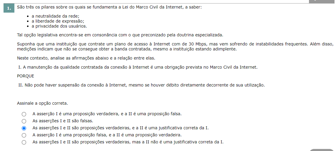 São três os pilares sobre os quais se fundamenta a Lei do Marco Civil da Internet, a saber: a neutralidade da rede; a liberdade de expressão; a privacidade dos usuários. Tal opção legislativa encontra-se em consonância com o que preconizado pela doutrina especializada. Suponha que uma instituição que contrate um plano de acesso à Internet com de 30 Mbps, mas vem sofrendo de instabilidades frequentes. Além disso, medições indicam que não se consegue obter a banda contratada, mesmo a instituição estando adimplente. Neste contexto, analise as afirmacoes abaixo e a relação entre elas. I. A manutenção da qualidade contratada da conexão à Internet é uma obrigação prevista no Marco Civil da Internet. II. Não pode haver suspensão da conexão à Internet, mesmo se houver débito diretamente decorrente de sua utilização. A asserção uma proposição verdadeira, e a II é uma proposição falsa. As asserções I e II são falsas. As asserções I e II são proposições verdadeiras, e a II é uma justificativa correta da I. A asserção uma proposição falsa, e a II é uma proposição verdadeira. As asserções I e II são proposições verdadeiras, mas a II não é uma justificativa correta da I.