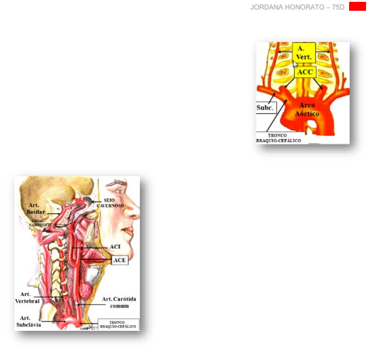 1 VASCULARIZAÇÃO ARTERIAL DO SNC Toda a irrigação arterial do encéfalo é formada por um conjunto de duas artérias, chamadas de artérias carótidas comuns e artérias vertebrais e seus ramos Essas tem como origem o arco aórtico, que apresenta no seu lado direito o tronco braquio-encefálico Do tronco braquio-encefálico parte a artéria carótida comum – um dos ramos principais da irrigação do SNC – e a artéria subclávia, que origina a artéria vertebral, que também participa da irrigação do sistema nervoso central Do lado esquerdo do arco aórtico, tem-se repetição do esquema citado, porém com ausência de tronco braquio-encefálico. Sendo nesse, a artéria carótida comum e a artéria subclávia ramos diretos da crosta aórtica (IMAGEM) Mostra a origem do tronco braquio-encefálico, tratando-se portanto de uma imagem do lado direito A artéria carótida comum sobe pelo pescoço, sendo originada em apenas um ramo. Na altura da cartilagem tireoide, essa se divide em artéria carótida externa e artéria carótida interna. Os ramos da artéria carótida externa não penetram o encéfalo Apenas o ramo da carótida externa, nomeado artéria maxilar interna merece destaque. Esse origina a artéria meníngea média, que penetra no crânio pelo forame espinhoso e é a principal irrigação da dura- máter A artéria carótida interna – principal – continua subindo pelo pescoço, sem formar ramos. Essa entra no crânio pelo canal carotídeo, passa pela parte petrosa do osso temporal e então avança pelo seio cavernoso, fazendo formato de um S, constituindo o sifão carotídeo, a partir desse ponto entra no crânio, penetrando a aracnoide e a dura-máter e então, a partir dessa porção intracraniana, origina ramos que vão irrigar a maior região do encéfalo. As artérias vertebrais – tanto a direita quanto a esquerda – vão subir pelo pescoço, passando por dentro dos forames transversos das seis primeiras vertebras cervicais Entra no crânio através do forame magno Dentro do crânio origina a artéria basilar e ramos, que vão participar diretamente da irrigação do SNC JORDANA HONORATO – 75D 2 As artérias vertebrais direitas e esquerdas subindo pelo pescoço, passando pelos forames transversos das vertebras cervicais, e dentro do crânio se fundem originando outra artéria, chamada de artéria basilar O conjunto das artérias vertebrais se fundindo e formando a artéria basilar constitui o SISTEMA VÉRTEBRO BASILAR As duas carótidas internas formam o SISTEMA CAROTÍDEO INTERNO SISTEMA CAROTÍDEO INTERNO A artéria carótida interna na sua porção intracraniana forma duas artérias: artéria cerebral média e artéria cerebral anterior A artéria cerebral média é uma continuação quase que direta da artéria carótida interna. É um ramo mais calibroso que se projeta lateralmente ao encéfalo e vai em direção à face lateral do cérebro A artéria cerebral anterior é um ramo que se projeta anteriormente e entra na fissura longitudinal anterior do cérebro, depois contornando o corpo caloso e se dividindo em diversos ramos A carótida cerebral ainda origina duas artérias comunicantes: artéria comunicante anterior que se projeta anteriormente (pequena ponte arterial que comunica a artéria cerebral anterior direita e artéria cerebral anterior esquerda) e um ramo de projeção posterior – dos dois lados – chamado de artéria comunicante posterior A artéria cerebral média é responsável pela irrigação de toda a face lateral do cérebro A artéria cerebral anterior é responsável pela irrigação de praticamente toda a face medial do cérebro BASE DO CRÂNIO JORDANA HONORATO – 75D 3 (IMAGEM) Face lateral do cérebro. A Artéria. Cerebral Média percorre a Fissura de Sylvius, passando logo acima do Lobo Temporal, abrindo um leque de ramos para irrigar toda a face lateral do cérebro. (IMAGEM) A Artéria Cerebral Anterior ao entrar na linha média vai percorrer/contornar o corpo caloso e emitir diversos ramos que vão participar da irrigação de praticamente toda a face medial do cérebro. (IMAGEM) A Artéria Cerebral Posterior, ramo do Sistema Vértebro-Basilar, ao se projetar para trás irriga a face inferior do cérebro, do lobo temporal e também ajuda na irrigação da face medial do lobo occiptal (responsável pela visão) JORDANA HONORATO – 75D 4 SISTEMA VÉRTEBRO-BASILAR É formado pelas duas artérias vertebrais (artéria vertebral direita e artéria vertebral esquerda) Essas duas artérias se fundem a nível do sulco bulbo pontino e constituem a artéria basilar Essa artéria faz o sulco basilar da ponte (impressão) Tem como ramo terminal a artéria cerebral posterior (direita e esquerda) A artéria cerebral posterior se dirige posteriormente e percorre a face interior do cérebro em direção ao lobo occipital Irriga a face inferior do cérebro ou face inferior do lobo temporal Auxilia na irrigação da face medial do lobo occipital (responsável pela visão) As artérias vertebrais dão origem as artérias espinhais, que são seus ramos diretos Artéria espinhal anterior: única, artéria delicada, formada por dois filetes arteriais que se originam diretamente das artérias vertebrais. Essa desce pela fissura mediana anterior e é responsável pela irrigação da face anterior da medula espinhal Artérias espinhais posteriores: são dois ramos delicados, que nascem em ambos os lados das artérias vertebrais. Sendo de possível visualização apenas na visão posterior. Descem nos sulcos laterais posteriores dos dois lados da medula. São responsáveis pela irrigação da porção posterior da medula espinhal JORDANA HONORATO – 75D 5 Artéria cerebelar póstero inferior (PICA): responsável pela irrigação do cerebelo, região posterior e inferior dele. Ramo da artéria vertebral, discreto, nasce na região inferior dela partindo para a região póstero inferior do cerebelo. Tem ela em ambos o lados. Ramos da artéria bas