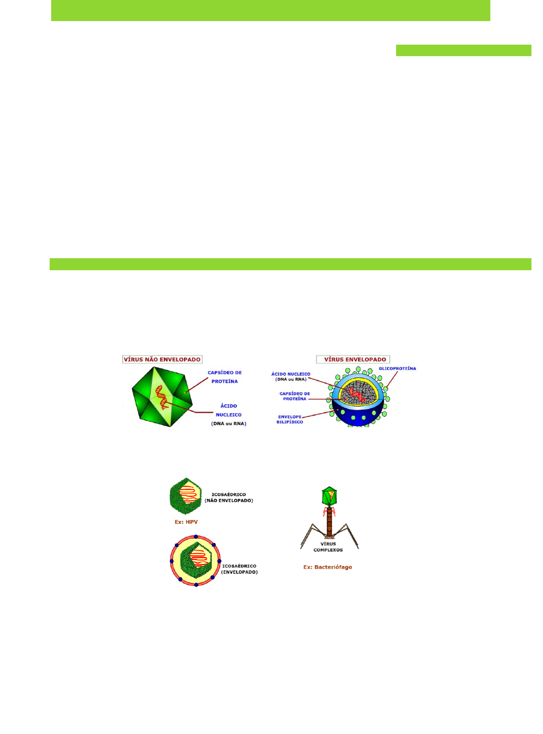 Vírus Os vírus são muito pequenos (entre 10 e 100nm), por isso, só podem ser vistos através de microscópios eletrônicos. Existe uma grande discussão a respeito do vírus ser um ser vivo ou não. Aqueles que defendem que ele é um ser vivo, argumentam que eles são capazes de se reproduzir. Os que defendem que ele não é um ser vivo, utilizam o argumento da Teoria Celular (estabelece que todo ser vivo é formado por células. Como os vírus são acelulares, eles não seriam seres vivos). Características gerais → Acelulares (proteína + ácido nucleico); → Possuem DNA, RNA ou ambos; → Não têm metabolismo próprio; → São parasitas intracelulares obrigatórios (só se reproduzem no interior de uma célula); → São agentes infecciosos (viroses); → Fora da célula se chamam vírios; → Não sofrem ação de antibióticos; → Podem sofrer mutação (RNA tende a mutar mais); → São altamente específicos. Estrutura Os vírus não envelopados apresentam externamente um capsídeo constituído de proteínas variadas e internamente um material genético, um ácido nucleico (DNA/RNA). Os vírus envelopados apresentam um envelope bilipídico impregnado de diversas glicoproteínas. Dentro do envelope há o capsídeo proteico que protege seu material genético. Os vírus apresentam, também, diferentes “formatos geométricos”: A transmissão de um vírus pode acontecer de diversas formas: em relações sexuais, pelo ar, pelo contato com lesões e sangue infectado e pelo contato com animais. Independente do tipo de transmissão, a penetração do vírus na célula hospedeira pode ocorrer pela injeção de ácido nucleico, onde apenas o ácido penetra na célula, e o restante do vírus permanece na região externa dela. Pode ocorrer também pela fusão em que o envelope viral se funde com a membrana plasmática e a liberação do material genético ocorre. Por último, pode acontecer a endocitose, um processo em que a célula envolve o vírus por inteiro. Observe: Ciclo reprodutivo Para um vírus típico, o seu ciclo de vida pode ser dividido em cinco grandes passos (apesar que os detalhes desses passos serão diferentes para cada vírus). 1. Adsorção: adesão entre o envelope ou capsídeo viral e a membrana da célula hospedeira; 2. Penetração: passagem do vírus (ou de seu genoma) para o interior da célula hospedeira; 3. Descapsidação: desintegração do capsídeo viral dentro da célula hospedeira; 4. Expressão gênica: replicação do genoma viral e síntese de proteínas virais; 5. Montagem: montagem de novos vírus no interior da célula hospedeira; 6. Liberação: novos vírus são liberados pela célula hospedeira. Até uma bactéria pode pegar um vírus! Os vírus que infectam bactérias são chamados de bacteriófagos. Os bacteriófagos podem utilizar dois ciclos diferentes para infectar seus hospedeiros: Retrovírus Retrovírus possuem um único ciclo de vida. Eles são de especial importância pois o vírus da imunodeficiência humana (HIV), o vírus que causa a síndrome da imunodeficiência adquirida, ou AIDS, é um retrovírus. O genoma de um retrovírus é composto por RNA de fita simples e vem em duas cópias por partícula viral. O RNA deve ser convertido em DNA de fita dupla por uma enzima chamada transcriptase reversa, revertendo o fluxo normal de informação (DNA para RNA para proteína) nas células. → Diferença entre HIV e AIDS: Os primeiros medicamentos antirretrovirais surgiram na década de 1980. Eles agem inibindo a multiplicação do HIV no organismo e, consequentemente, evitam o enfraquecimento do sistema imunológico. A AIDS surge quando a pessoa desenvolve infecções oportunistas, que podem acometer os pulmões, cérebro, olhos e outros órgãos. As doenças mais comuns em pessoas com AIDS incluem a tuberculose, a pneumonia e a histoplasmose (infecção respiratória causada por um fungo), entre outras. Portanto, HIV não apresenta sintomas, enquanto a AIDS apresenta. No ciclo lítico, o DNA viral invade a bactéria e passa a comandar seu metabolismo. Novos vírus são produzidos, causando a quebra da célula bacteriana. No ciclo lisogênico, o DNA viral integra-se ao DNA bacteriano. Nesse caso, o DNA viral passa a ser chamado de profago. O metabolismo bacteriano não é afetado e a bactéria consegue se reproduzir normalmente gerando bactérias que carregam, em seu genoma, o genoma viral integrado. https://pt.khanacademy.org/science/biology/gene-expression-central-dogma