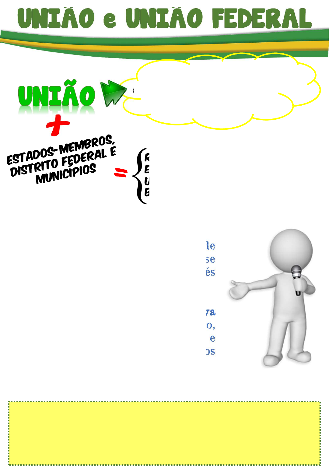 UNIÃO e UNIÃO FEDERAL se constitui pela congregação das comunidades regionais que vêm a ser os Estados-Membros. República Federativa do Brasil Estado Federal União Federal Brasil Assim, uma coisa é a União – unidade federativa – ordem central, que se forma pela reunião de partes através de um pacto federativo. Outra coisa é a República Federativa do Brasil, formada pela União, Estados-Membros, Distrito Federal e Municípios. Todos autônomos, nos termos da CF. A República Federativa do Brasil, A República Federativa do Brasil, portanto, é SOBERANA no plano internacional, enquanto os entes federativos são autônomos entre si.