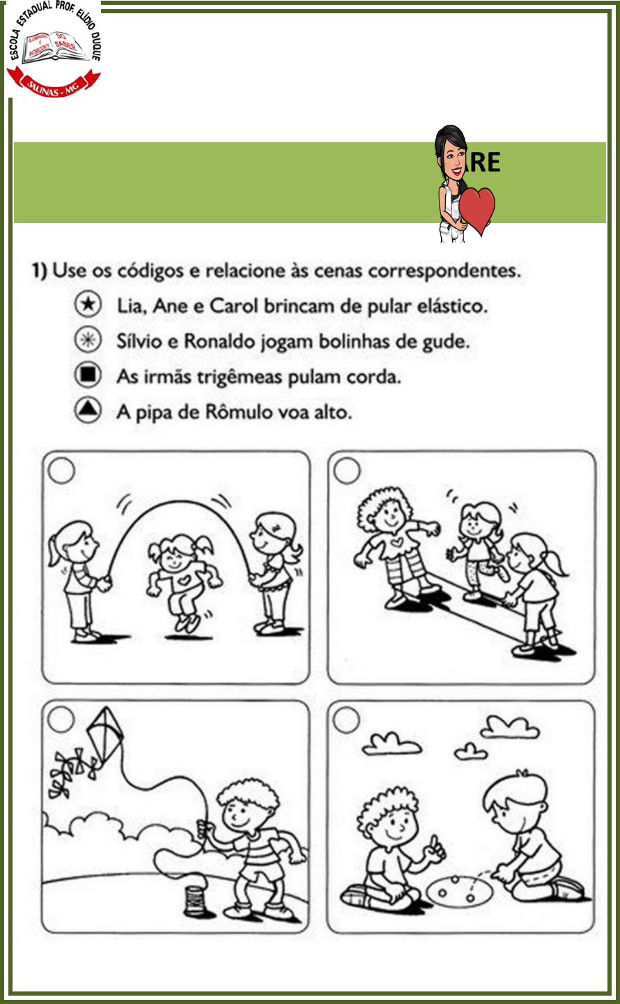 Escola Estadual Professor Elídio Duque Data: ___/____/2021 Disciplina: Educação Física Professora: Kelly Myhária Simões dos Reis Aluno(a): _____________________________________ 1º REG 5 ATIVIDADES COMPLEMENTARES SEMANA 01 Escola Estadual Professor Elídio Duque Data: ___/____/2021 Disciplina: Educação Física Professora: Kelly Myhária Simões dos Reis Aluno(a): _____________________________________’ 1º REG 5 ATIVIDADES COMPLEMENTARES SEMANA 02 Escola Estadual Professor Elídio Duque Data: ___/____/2021 Disciplina: Educação Física Professora: Kelly Myhária Simões dos Reis Aluno(a): _____________________________________ 1º REG 5 ATIVIDADES COMPLEMENTARES SEMANA 03 ATIVIDADE 1 - QUENTE OU FRIO COMO REALIZAR A ATIVIDADE? O COMANDANTE ESCONDE UM OBJETO E DEIXA QUE O OUTRO PROCUR E. A DIVERSÃO ESTÁ EM DAR PISTAS DI ZENDO SE A PESSOA ESTÁ QUENTE (PERTO DO OBJETO) OU SE ESTÁ FRIO (LONGE DO OBJETO). VARIAÇÕES: •BRINCAR COM OS OLHOS VENDADOS · BRINCAR NO ESCURO, COM A JUDA DE UMA LANTERNA. · Brincar com os olhos vendados. •BRINCAR COM OS OLHOS VENDADOS DICAS: •PARTICIPAR COM A FAMÍLIA TODA. •SE FOR BEM ESCONDI DO O OBJETO, A BRINCADEIRA POD E R ENDER BASTANTE TEMPO E MUITA D IVERSÃO, DE FORMA QUE NINGUÉM VÁ NOTAR SE LÁ FOR A R EALMENTE ESTÁ QU ENTE · PARTICIPAR TODA A FAMÍLIA · SE FOR BEM ESCONDIDO O OBJETO, A BRINCADEIRA PODE RENDER BASTANTE TEMPO E MUITA DIVERSÃO, DE FROMA QUE NINGUÉM VÁ NOTAR SE LÁ FORA ESTÁ REALMENTE QUENTE OU FRIO, NÃO É MESMO? MATERIAL: OBJETO, LENÇO PARA VENDAR OS OLHOS, LANTERNA. PARA SABER MAIS S OBRE COMO BRINCAR VEJA O VÍDEO ABAIXO : https://www.youtube.com/watch?v=4GTCdWXakjc ATIVIDADE 2 –GARRAFABOL COMO REALIZAR A AT IVIDADE? UMA PESSOA LANÇA A BOLINHA PARA A OUTR A, QUE TENTA PEGÁ-LA COM A TAÇA IMPROVISADA. O OB JE TIVO É PASSAR A BOLA ARREMESSAND O-A PARA O ALTO UTILIZANDO A TAÇ A IMPROVISADA E QUANDO A MESMA VIER NA SUA DIREÇÃO VOCÊ DEVE ENCAÇAPÁ-LA. VARIAÇÕES: •REALIZAR A ATIVIDADE INDIVIDUALMENTE: JOG AR A BOLA PARA CIMA E PEGAR ANTES DE CAIR NO CHÃO OU J OG AR PARA CIMA, DEIXAR DAR UMA QUICADA OU DUAS ANTES DE PEGÁ-LA. DICAS: •A BOLA POD E SER FEITA DE PANO, MEIA QUE NÃO USA MAIS OU DE SACOLAS PLÁSTICAS. MODO DE FAZER SUA TAÇA •CORTAR AS DUAS GARRAFAS A APROXIM ADAMENTE 15 CM DO GARGALO. FAZER O ACABAMENTO NO LUGAR DO CORTE, COM FITA, LIXANDO OU QUEIMANDO PARA NÃO MACHUCAR A CRIANÇ A (PEÇA AJUDA PARA UM ADULTO NESSE MOMENTO) •MATERIAL:GARRAFAS PET OU DE AMACI ANTES, TESOURAS, FITAS, BOLAS. Escola Estadual Professor Elídio Duque data: ___/____/2021 Disciplina: Educação Física Professora: Kelly Myhária Simões dos Reis Aluno(a): _____________________________________ 1º REG 5 ATIVIDADES COMPLEMENTARES SEMANA 04 1. LEIA A IMAGEM ABAIXO. CIRCULE UMA BRINCADEIRA QUE ENVOLVE CORRIDA COM BARREIRA E UMA BRINCADEIRA QUE ENVOLVE ALVO. 2. NA IMAGEM ABAIXO A MODALIDADE QUE ESTÁ SENDO PRATICADA PELA MÔNICA, PERSONAGEM DA TURMA DA MÔNICA, ENVOLVE PRECISÃO. a) QUAL O NOME DO ESPORTE QUE A PERSONAGEM DA TURMA DA MÔNICA ESTÁ PRATICANDO NA IMAGEM ACIMA? FAÇA UM “X” NA ALTERNATIVA COM A RESPOSTA CORRETA. ( ) ARCO E FLECHA. ( ) FUTEBOL. ( ) BOLICHE. ( ) FUTSAL.