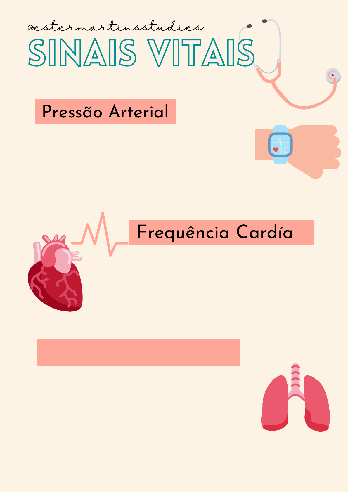 Bradicardia: abaixo de 60 bpm Normocardia: 60 a 100 bpm Taquicardia: acima de 100 bpm Bradipneia: abaixo de 14 irpm Eupneia: 14 a 20 irpm Taquipneia: acima de 20 irpm Hipotensão: 90/60 mmHg Normotensão: 120/80 mmHg Hipertensão: >140/90 mmHg Sinais Vitais @estermartinsstudies Pressão Arterial Frequência Cardíaca Frequência Respiratória Hipotermia: 35°C ou menos Normal: 36°C a 37,5°C Febre: acima de 37,5°C Temperatura Dor @estermartinsstudies