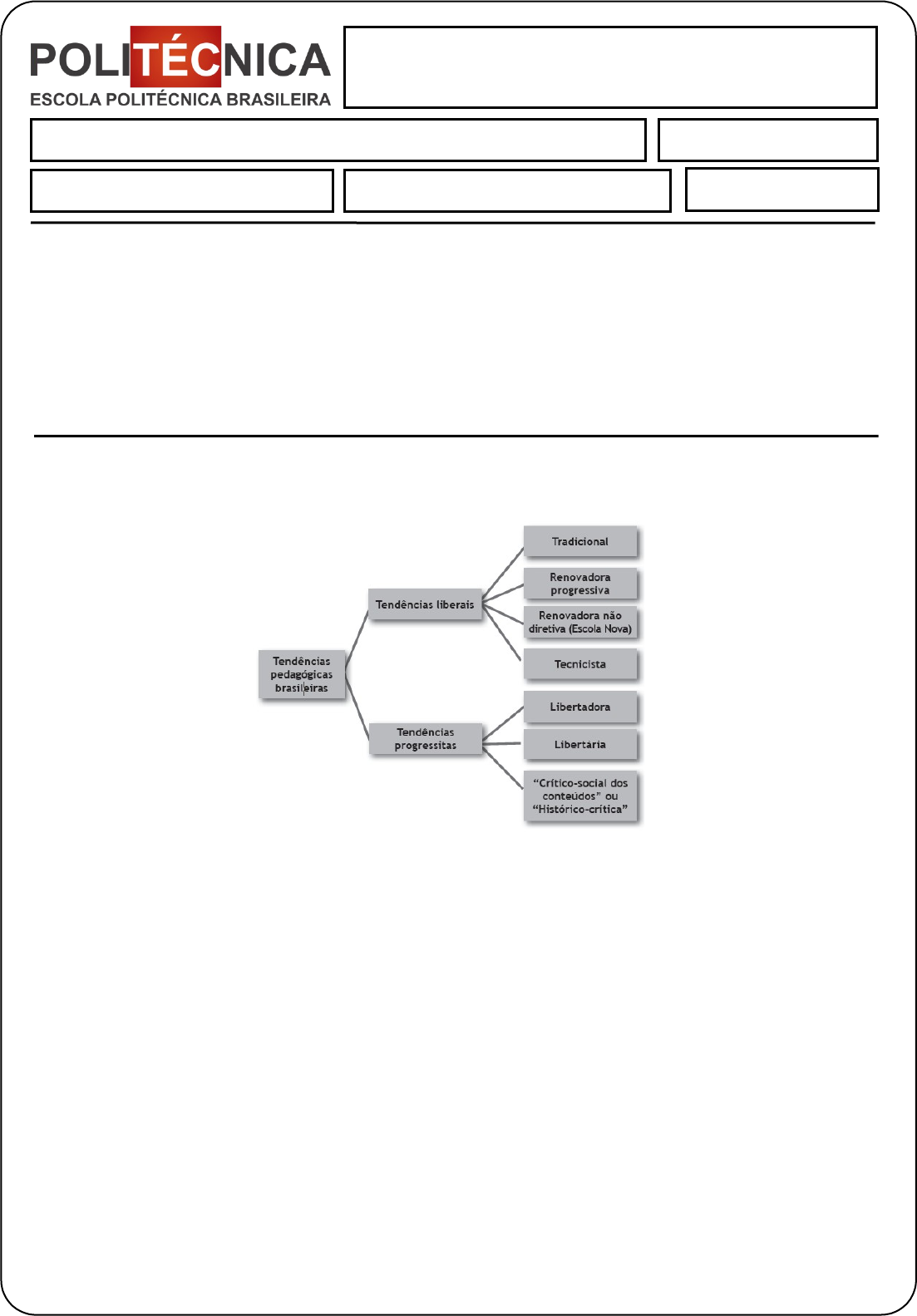 Avaliação de Pesquisa: Base Histórica e Legal da Educação 1. Analise o esquema e descreva as tendências pedagógicas brasileiras. Mostrando que as principais tendências pedagógicas usadas na educação brasileira se dividem em duas grandes linhas de pensamento pedagógico. Elas são: Tendências Liberais e Tendências Progressistas. Os professores devem estudar e se apropriar dessas tendências, que servem de apoio para a sua prática pedagógica 2. A Lei 9.394/96 apresenta um significativo avanço no que se refere à estrutura organizacional do ensino, tendo a educação básica sua finalidade. Na sua opinião, apresente aspectos das mudanças no campo educacional e a finalidade da escola. Com os novos paradigmas da educação surgidos nos últimos anos, as mudanças ocorridas no processo de ensino e aprendizagem trouxeram mais qualidade à educação, mas necessitando de maior empenho dos profissionais bem como da manutenção do seu processo de formação. Sabemos que hoje, uma graduação não é o bastante para o exercício de uma profissão, mas que existe a necessidade constante do profissional, seja de que classe for, se manter atualizado sobre as novidades e mudanças ocorridas no mercado de trabalho. Base Histórica e Legal da Educação Aluno (a): Data: / / Atividade de Pesquisa NOTA: ORIENTAÇÕES: Ler atentamente as instruções contidas no documento é de fundamental importância na realização da avaliação. Para esta atividade o aluno poderá utilizar-se das ferramentas de pesquisas como: internet, artigos científicos, manuais técnicos, livros e literaturas disponibilizadas em nossa biblioteca. Preencha todos os dados referente a sua identificação como: nome completo, data de entrega. As respostas poderão ser de escritas forma manual e/ou digitadas abaixo de cada pergunta. Ao terminar a avaliação o arquivo deverá ser salvo com o nome: "Avaliação de Pesquisa" (nome do aluno). Envie o arquivo pelo sistema em formato digital em pdf ou word. Bons Estudos! Avaliação de Pesquisa: Base Histórica e Legal da Educação Não muito distante, tínhamos uma escola coercitiva, que feria os princípios éticos e morais, que agredia fisicamente e moralmente os alunos através de castigos, puxões de orelhas, orelhas de burro, xingamentos, dentre várias outras ações agressoras. As práticas pedagógicas eram voltadas para o ato de decorar os conteúdos, além de utilizar recursos cansativos, como as cópias e os cadernos de caligrafia. Com novas pesquisas na área da psicologia da educação, o aspecto lúdico foi apontado como um dos mais importantes para a aprendizagem, ligando-a ao prazer do aluno em aprender. Temos também uma gama maior de cursos de especialização, de congressos e outros onde são discutidas as práticas educativas das últimas décadas, levando maior capacitação aos professores. 3. Nesse período tivemos as contribuições de Condorcet, que dividiu o ensino em cinco graus de instrução com as seguintes designações: “1.° Escolas primárias; 2.° Escolas secundárias; 3.° Institutos; 4.° Liceus; 5.° Sociedade nacional das ciências e artes” (CONDORCET, 2010, p. 25). Somente o último grau de instrução não seria gratuito: “en estos cuatro grados de instrucción, la enseñanza será totalmente gratuita” (CONDORCET, 1997, p. 272). Pesquise sobre a vida de Condorcet e faça relação com as escolas brasileiras de educação integral. Condorcet nasceu em 17 de setembro de 1743 em Ribemont e seu nome é MarieJean- Antonie-Nicolas Caritat. Filho de uma família aristocrática, fez seus primeiros estudos no Colégio Jesuíta de Reims. Aproximou-se dos enciclopedistas e escreveu verbetes sobre matemática para a enciclopédia. Tornou-se amigo de D´Lambert, Codilac, Diderot, Voltaire, Helvécio e Turgot. Durante o período revolucionário francês escreveu praticamente sozinho o Relatório e Projeto de Decreto Sobre a Organização Geral da Instrução Pública, o qual foi submetido à Assembléia Nacional em 20 e 21 de abril de 1792. Elaborou também um Projeto de Constituição, no entanto, “a versão da carta constitucional aprovada desagradou Condorcet, o que o levou a escrever Avis aux français sur la nouvelle constitution”. Nesse escrito o autor adverte aos franceses da “ameaça que pairava sobre a liberdade”. Como conseqüência, foi perseguido pelo terror, passando a viver na clandestinidade até março de 1794, quando foi preso. Morreu na prisão em circunstâncias não muito claras e “as explicações oscilam entre o suicídio por envenenamento e o esgotamento físico” (ALVES, 2010, p. 4 - 5). O autor francês, apesar de defender a universalização da instrução, nesse primeiro momento se refere somente ao primeiro grau, pelo qual todos deveriam passar, por ser onde se ensina, aquilo que é necessário a qualquer indivíduo para se conduzir por si mesmo e gozar da plenitude dos seus direitos. Esta instrução será suficiente mesmo aos que aproveitarão as lições dadas aos homens para torná-los capazes de exercer as funções públicas mais simples, às quais é bom que todo cidadão possa ser convocado, como aquela de jurado, de guarda municipal (CONDORCET, 2010, p. 25). Pelo lado burguês, as concepções de educação e de educação integral somente podem ser entendidas no contexto histórico da divisão social do trabalho capitalista, do qual Dewey é a expressão mais acabada e, pela grande influência que vai exercer na educação brasileira, por meio de Anísio Teixeira, é um nome primordial para a compreensão desse contexto. 4. Podemos utilizar aulas expositivas, dialogadas, exploratórias, práticas na educação integral, dependendo do que formos abordar. Lembramos que as diferentes formas podem ser usadas simultaneamente. Com a definição da metodologia de trabalho, devemos estabelecer os recursos necessários à execução desta. Antes de falarmos sobre recursos didáticos, precisamos d