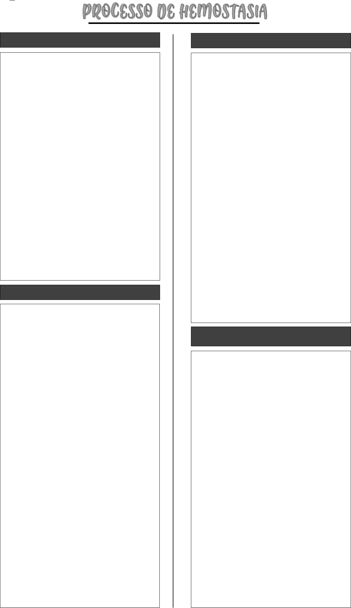 Processo de Hemostasia Hemostasia Secundária @a keyla Atuação dos vasos sanguíneos e plaquetas para impedir o sangramento. Lesão Vascular: Ativa os processos nervosos por parte do endotélio e das células musculares lisas, fazendo com que o sangue (ao extravasar) entra em contato com substancias que se encontram na parede do vaso, ativando o processo de coagulação sanguínea, a primeira ação que ocorre é a vascular. Ação Vascular: Vasoconstrição, contração da parede do vaso sanguíneo a fim de diminuir o seu calibre como também o tamanho da lesão e o fluxo sanguíneo. Ação das Plaquetas: São ativadas, seu tamanho e irregulares). plaquetas forma Logo ocorre são alterados (ficam após por meio das à ação adesão plaquetária e agregação plaquetária. As plaquetas requerem a intervenção de uma proteína plasmática, denominada fator Von Wille-brand (VWF), que facilita a adesão plaquetária à matriz subendotelial do endotélio exposto. Culmina com a ativação dos fatores de coagulação. Fatores Coagulação: Formados por uma família de proteínas que similaridade em suas possuem sequências, estruturas e, em certo grau, função. Esses fatores estarão circulando no sangue na forma inativa e para que eles sejam ativados necessita-se do estimulo de uma lesão vascular ocorrendo à ativação em sequência chamada de cascata de coagulação, ou seja, um vai ativando o outro, culminando na formação da trombina, que transforma o fibrinogênio em fibrina. A formação da fibrina garante que todo o processo de coagulação não vá além do necessário para estancar a hemorragia e restaurar a integridade vascular. A ativação ocorre em duas etapas, por meio da Via Intrínseca e Via Extrínseca. A permanência do coagulo de fibrina pode trazer consequências para a parede endotelial. Sua destruição começa quando o plasminogênio é ativado em plasmina. Essa ação é realizada pelo ativador do plasminogênio tissular e pela urocinase, a fim de evitar o excesso de fibrinólise, que poderia servir de fator para uma hemorragia, o organismo produz antiplasmina-2 que inibi a formação da plasmina. Ainda na via extrínseca, a proteína C é ativada e com a ajuda da S, inativa fatores 5 e 6, e a antitrombina 3, que inibe a trombina. Lembrando que a deficiência qualitativa ou quantitativa de algum desses fatores causará uma coagulopatia (hereditária ou adquirida), cuja gravidade será de acordo com sua importância e ao grau de deficiência do fator. Hemostasia terciária Hemostasia Primária Hemostasia (do grego, haima: sangue; stasis: detenção), também denominada hemóstase. O termo hemostasia refere-se ao conjunto de mecanismos pelos quais se mantêm o sangue fluindo dentro do vaso, sem coagular (trombose) nem extravasar (hemorragia), envolvendo a estrutura e o funcionamento normais dos vasos sanguíneos, das plaquetas e dos fatores de coagulação. A partir do momento em que o vaso se lesiona, ativa-se todo um processo de coagulação para reprimir a hemorragia, reparando assim a lesão e voltando ao estado normal (liquido). Em casos de hemorragia, classifica-se a hemostasia em: Hemostasia primária – Vasoconstrição. Hemostasia secundária – Coagulação. Hemostasia terciária – Fibrinólise