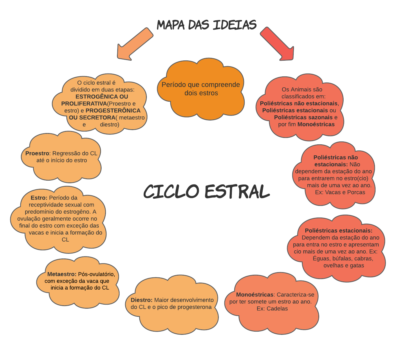 CI CLO ESTRAL Período que compreende dois estros Os Animais são classificados em: Poliéstricas não estacionais, Poliéstricas estacionais ou Poliéstricas sazonais e por fim Monoéstricas Poliéstricas não estacionais: Não dependem da estação do ano para entrarem no estro(cio) mais de uma vez ao ano. Ex: Vacas e Porcas Poliéstricas estacionais: Dependem da estação do ano para entra no estro e apresentam cio mais de uma vez ao ano. Ex: Éguas, búfalas, cabras, ovelhas e gatas Monoéstricas: Caracteriza-se por ter somete um estro ao ano. Ex: Cadelas O ciclo estral é dividido em duas etapas: ESTROGÊNICA OU PROLIFERATIVA(Proestro e estro) e PROGESTERÔNICA OU SECRETORA( metaestro e diestro) Proestro: Regressão do CL até o início do estro Estro: Período da receptividade sexual com predomínio do estrogêno. A ovulação geralmente ocorre no final do estro com exceção das vacas e inicia a formação do CL Metaestro: Pós-ovulatório, com exceção da vaca que inicia a formação do CL Diestro: Maior desenvolvimento do CL e o pico de progesterona MAPA DAS I DEI AS MAPA MENTAL SOBRE CICLO ESTRAL Page 1