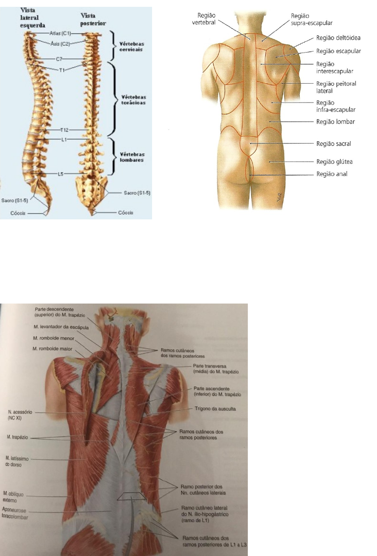 Fernanda F. Ferreira - TXI Dorso A principal região do dorso é a vertebral, a qual está sobre a coluna vertebral. Estende-se até a terceira vértebra sacral (apoiada na fenda interglútea). Separa-se está região das vizinhas através dos processos transversos onde passa a linha para-vertebral. Lateralmente, tem-se a região escapular divida em supra, infra e interescapular/ interescapulovertebral. Essas regiões laterais estão atrás do tórax, aproximando-se do abdome há a região que confere acesso ao rim chamada de região lombar (termina na crista ilíaca). Mais para baixo tem-se a chamada região glútea. A região mais baixa recebe o nome de sacral. *escápulas embora localizadas no dorso são parte do esqueleto apendicular →Livro: Mm. Extrínsecos do dorso: - superficiais: trapézio, latíssimo, levantador da escápula e romboides – unem o esqueleto axial (coluna vertebral) ou axial ( cíngulo do M. superior e úmero) - intermediários: serrátil posterior (mm. Respiratórios superficiais) superior abaixo dos mm. romboides e inferior profundo ao latíssimo do dorso – são supridos pelos nn. Intercostais – o superior pelos 4 primeiros e o inferior pelos 4 últimos Mm. Próprios do dorso- mantém a postura e controlam mov. Da coluna – são revestidos por uma fascia que se fixa aos processos transversos e às costelas = aponeurose toracolombar - camada superficial: mm. Esplênios: do pescoço e da cabeça que revestem e mantém mm. Do pescoço em posição - camada intermédia: são os eretores da espinha –mm. Iliocostal, longuíssimo e espinal – mm. Geradores de mov que atuam bilateralmente - camada profunda: profundos aos mm. Eretores da espinha – grupo oblíquo de mm. Mais curtos: mm. Semiespinais, multífidos e rotadores – ocupam o sulco entre os processos transversos · Pode ser dividido em três partes: 1. Cervical posterior 2. Posterior ao tórax · Supraescapular · Escapular · Subescapular · Interescapular vertebral ( D ou E) 3. Lombar · Vertebral · Supra-escapular · Deltoidea · Escapular · Interescapular · Peitoral lateral · Infra-escapular · Lombar · Sacral · Glútea · Anal · Limites: · Superior: Linha que liga os dois acrômios, passando por C7 (proeminente). Vai desde o acrômio (ponta do ombro) ao outro acrômio → é uma linha passando de acrômio a acrômio passando pela vértebra proeminente (vértebra C7) – esse é o limite superior do dorso. Apesar de não fazer parte do dorso, a região cervical posterior muitas vezes é estudada no dorso (os mm. do dorso se continuam para o pescoço). · Inferior: Linha que une as cristas ilíacas e que se prolonga até a fenda interglútea. vai desde as cristas ilíacas e continua até começar a fenda interglútea (sulco que separa as 2 nádegas) – linha que contorna as cristas ilíacas até a fenda interglútea. · Topografia 1. Pele · Grossa, sem discriminação tátil, espessa e protetora. Difere da pele do pescoço que é mais fina, apresenta bastante glândulas sebáceas o que explica o maior número de abcessos, espinhas etc. 2. Tela subcutânea · Densa (+gordura) na região vertebral e mais frouxa nas regiões laterais. Nos obesos tem-se mais gordura na região superior da nuca assim como na região lombar. 0. Músculos · Retirando o tegumento comum · Duas camadas musculares principais no dorso 1. Pré-vertebrais: a frente dos processos transversos ou se originam deles · M. psoas maior – bem do lado do corpo da vértebra flexão lateral da coluna, estabilização da região lombar, assim do processo transverso · M. quadrado do lombo – do lado do processo transverso Flexor lateral, estabilização da região lombar · Mm. Largos do abdome (M. oblíquo interno, M. oblíquo externo e M. transverso é o mais interno) O fortalecimento desses músculos auxilia na estabilização da coluna lombar, proteção da parede anterolateral do abdômen O Ilíaco e o psoas se unem abaixo do ligamento inguinal p formar o ilío-psoas. Esses 3 músculos atuam na coluna vertebral para permitir movimento da coluna vertebral, permitem flexão da coluna. Então, são músculos que movimentam, estabilizam e sustentam a coluna vertebral. 0. Pós-vertebrais: por de trás dos processos transversos · Mm. Superficiais (músculos migrantes, isto é, não se originam no dorso). · Mm. Profundos · Mm. Para-vertebral · Mm. Superficiais São músculos que se estendem da coluna vertebral até o membro superior, portanto são considerados toracoapendiculares. 1. M. Trapézio: · Inervação: N. acessório; · Função: Elevar, retrair o ombro ou girar a escápula; · Origem: Protuberância occipital; · Inserção: Escápula e processos espinhoso de T12. 0. M. Latíssimo do Dorso: · Função: Adução, extensão e rotação medial do braço, e ajuda da mov. Do gradiado costal ( sendo assim um m. acessório da respiração) · Origem: Processos espinhosos das vertebras torácicas (através da aponeurose toracolombar) · Inserção: Úmero - entre tubérculo maior e menor da região anterior do úmero, chamado de espinoapendicular · Inervação: N. toracodorsal (ramo do fascículo posterior do plexo braquial) · Principal musculo da natação e acessório da respiração 0. M. Levantador da escapula · Inervação: N. dorsal da escápula (plexo braquial) · Inserção: acima da espinha da escápula · Função: Elevação do ombro, trabalha junto ao trapézio (fibras descendentes) 0. M. Romboide menor: · Função: Fixa e retrai a escápula · Inserção: no nível da espinha da escápula 0. M. Romboide maior: · Função: Fixa e retrai a escápula · Inserção: margem medial da escápula, abaixo da espinha · Mm. Profundos: · Aponeurose toracolombar: separa a musculatura superficial da profunda. Na região cervical recebe o nome de fáscia da nuca e envolve os esplênios e se fixa no ligamento nucal. Na região do tórax a aponeurose toracolombar se fixa nos processos espinhosos medialmente, reco
