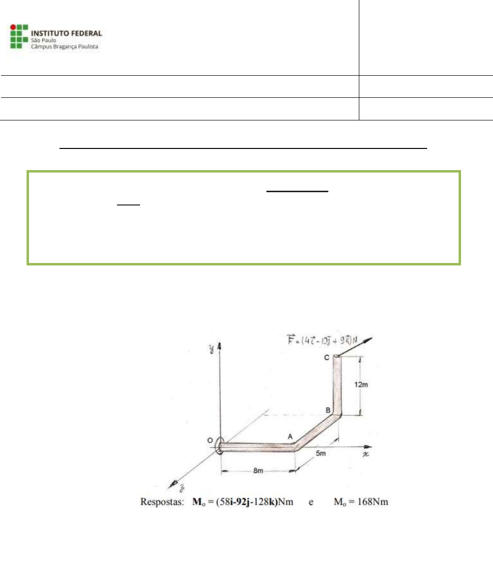 1 Lista 2 Nome: Turma: 3° Período Professor Adilson Vitor Rodrigues Data: 30-03-2021 MEGS3 - ENGENHARIA DE CONTROLE E AUTOMAÇÃO Observações: - Esta lista de exercícios é a 1ª atividade a ser contabilizada na composição dos (até) 2,0 pontos de trabalhos/bimestre; - Será agendada uma data para entrega de todas as listas (sim, deverão ser entregues juntas, de uma só vez); - A entrega será feita via Moodle, então digitalize sua resolução (preferencialmente em um dos formatos: .jpeg ou .pdf). 1) Determinar o vetor cartesiano e o módulo da força F=(4i-10j+9k)N em relação ao ponto O, ponto de fixação da tubulação OABC. 2) Determine o momento produzido por cada força em relação ao ponto O localizado na broca da furadeira. Expresse os resultados como vetores cartesianos. 2