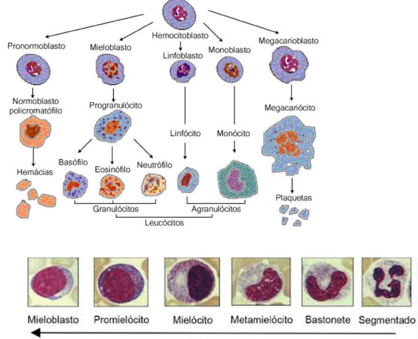 Leucocitoses e Leucemias Leucocitose -> aumento de leucócitos, seja às custas de granulócitos (eosinófilo, basófilo, neutrófilo) ou linfócitos. Valores de referência em número absoluto LEUCÓCITOS : 4.000 – 10.000 - Neutrófilo segmentado : 1.500-7.000 (fazer a porcentagem do valor total de leucócitos para obter o valor absoluto). - Linfócito : 1.000-4.500 (fazer a porcentagem do valor total de leucócitos para obter o valor absoluto). NEUTRÓFILOS : série granulocítica Neutrofilia : o aumento dos neutrófilos ocorre em infecções bacterianas, uso de corticoide, pós trauma ou esplenectomia. Desvio da linhagem percussora § Com desvio à esquerda : tem células imaturas que não poderiam estar presentes no sangue, como metamielócitos, mielócitos, promielócitos, mieloblastos. ® Desvio escalonado/regenerativo : o aumento celular obedece a sequência : segmentado > bastonete > meta > mielócito > promielócito > mieloblasto. Ocorre na reação leucemóide decorrente à infecção, leucemia mielóide aguda (>20% de blastos), leucemia mielóide crônica (causa visceromegalia de grande monta). ® Desvio não escalonado/degenerativo : o aumento celular não segue a sequência precursora. Ocorre quando a maturação está bagunçada. § Com desvio à direita : aumento dos segmentados. Ocorre na recuperação de infecções, medicamentos e causas não infecciosas. Ex: 5% metamielócito + 15% bastonetes + 60% neutrófilo segmentado. LINFÓCITOS : série linfocítica Linfocitose : o aumento de linfócitos ocorre em doenças virais (mononucleose infecciosa), doenças clonais (linfoproliferativas), linfocitose monoclonal idiopática. CASO 1 Paciente compareceu ao serviço devido hemograma alterado, visto na consulta da UBS, mas encontra-se assintomático. Tem apenas HAS leve e controlada. Encontra-se apenas levemente pálido, com discreta linfonodomegalia cervical bilateral e baço palpável em posição e Schuster. Sombra celular / mancha de Gumprecht -> célula estourada roxo claro. Hemograma com anemia normocítica e normocrômica, leucocitose às custas de linfocitose, plaquetopenia leve. HIPÓTESES : linfoma, leucemia linfocítica crônica. Não pode ser LL aguda porque o paciente estaria sintomático. CONDUTA : pedir imunofenotipagem de sg periférico (usar anticorpos fluorescentes direcionados aos antígenos dos linfócitos B). LEUCEMIA LINFOCÍTICA CRÔNICA Neoplasia que tem como célula neoplásica o linfócito B, uma célula clonal que tem escape de apoptose, proliferação aumentada e não se matura em plasmócito, devido a hiperativação da via tirosina quinase de Bruton. Acomete pacientes idosos, normalmente assintomática, mas quando sintomática tem adenomegalia e esplenomegalia, podendo ter anemia. Tem um curso clínico silencioso e de anos. Diagnóstico consiste no hemograma com leucocitose as custas de linfócitos (> 5mil) + imunofenotipagem do sg periférico positivo para linfócito B clonado (marca CD5+). O esfregaço de sg periférico apresenta monotonia de linfócitos com manchas de Gumprecht (linfócito B estourado). Após o diagnóstico, estratificamos a leucemia para saber como tratar. Se leucemia de baixa classificação, apenas observamos se evoluir. Se leucemia de média e alta classificação / leucemia com anemia (Hb < 10) / leucemia com plaquetopenia (plaqueta < 100mil) / leucemia com adenomegalia importante, tratar com quimioterapia e imunoterapia com rituximab (anti-CD2O apoptótico). CASO 2 Paciente com dor abdominal e fraqueza há 8 meses, de característica progressiva, refere plenitude pós prandial e aumento do volume abdominal e dor à esquerda. Já estava no aguardo de consulta com hematologia devido alterações em exame de sangue. Ao exame físico, hipocorado, baço palpável até fossa ilíaca direita e fígado palpável há 8 dedos do rebordo costal direito. Esterase : marcador dos leucócitos. Adulto, com história crônica e progressiva. Desconforto pós prandial por esplenomegalia e hepatomegalia. Hemograma com anemia, leucocitose às custas de neutrófilos (desvio à esquerda escalonado) e leve plaquetopenia. HIPÓTESES : leucemia mielóide crônica. Não pode ser aguda por conta do quadro arrastado e por ser um desvio escalonado ; se fosse aguda teria mais blasto. CONDUTA : mielograma, imunofenotipagem e estudo genético (procura do cromossomo Philadelfia). LEUCEMIA MIELÓIDE CRÔNICA Doença mieloproliferativa crônica cuja célula neoplásica é da linhagem mielóide, que tem intensa proliferação e pouca diferenciação celular. Pode acometer pacientes mais novos, e agudizar. No início da doença, podem haver pacientes assintomáticos. Com a evolução da doença, o paciente apresenta fadiga, sangramento, perda de peso, sudorese, plenitude abdominal por hiperesplenismo, esplenomegalia de grande monta (abaixo do umbigo). O diagnóstico é feito por esfregaço de sg periférico (mais células nucleadas e em diferentes estágios de maturação), hemograma com leucocitose desviada à esquerda e escalonado, citogenética para cromossomo Philadelfia e detectação do oncogene BCR-ABL. O tratamento consiste no uso do inibidor da tirosina quinase chamado imatinibe. CASO 3 Paciente com 25 anos, apresenta dor de garganta e compareceu ao OS por odinofagia há 3 dias, acompanhada de febre. Ao exame físico apresenta orofaringe com placas pultáceas. Paciente com quadro infeccioso súbito. Hemograma sem anemia, sem plaquetopenia e com leucocitose às custas de neutrófilo, com desvio escalonado à esquerda (predominância de segmentados). HIPÓTESE : infecção bacteriana. Esfregaço de sangue periférico com predomínio de segmentados. REAÇÃO LEUCEMÓIDE Aumento de leucócito secundário à outro processo, provavelmente infeccioso. Leucócitos > 25.000-30.000 com desvio escalonado à esquerda, às custas de linfócito ou granulócitos. Pacientes possuem fosfatase alcalina leucocitária alta têm reação leucemóide benigna. Principais 