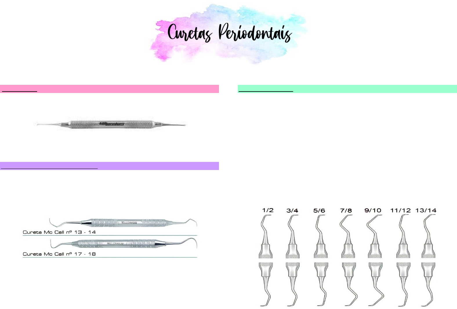 CURETA 00: ↳ Indicada para os dentes anteriores (regiões interproximais). CURETAS MCCALL (UNIVERSAIS): ↳ indicadas para raspagens supragengival. 13-14 ⇾ Dentes Anteriores. 17-18 ⇾ Dentes Posteriores. CURETAS GRACEY: ↳ indicadas para raspagens sub e supragengival. 1-2 ⇾ Dentes anteriores (todas as faces). 3-4 ⇾ Dentes anteriores (todas as faces). 5-6 ⇾ Dentes Anteriores (faces livres) e Pré Molares (todas as faces). 7-8 ⇾ Dentes Posteriores (faces livres). 9-10 ⇾ Dentes Posteriores (faces livres). 11-12 ⇾ Dentes Posteriores (mesial). 13-14 ⇾ Dentes Posteriores (distal).
