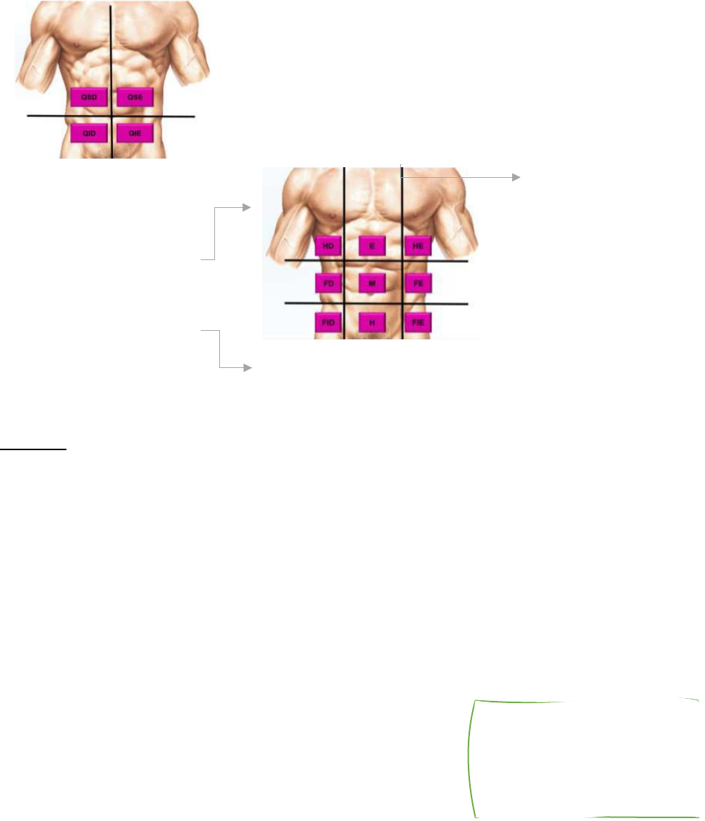 Anatomia Abdome Supramesocólico · O abdome está localizado abaixo do diafragma até a região pélvica. · O abdome pode ser dividido em nove ou quatro regiões. A divisão em nove regiões é mais utilizada por ser mais específica na topografia dos órgãos analisados, de dores e ainda de doenças. Quadrante Superior Direito - Quadrante Superior Esquerdo Quadrante Inferior Direito - Quadrante Superior Esquerdo Hipocôndrio Direito – Epigastro – Hipocôndrio Esquerdo Flanco Direito – Mesogastro – Flanco Esquerdo Fossa ilíaca Direita – Hipogastro – Fossa Ilíaca Esquerda Peritônio: Membrana serosa que se reflete sobre as vísceras abdominais (a exemplo do estômago, intestino, baço, fígado). Recobre a parede anterolateral do abdome e vários órgãos situados adjacentes à parede posterior do abdome em suas faces internas. Consiste em duas lâminas contínuas, o peritônio parietal (recobre a face interna da parede abdominopélvica) e o visceral (recobre estômago e intestino) e ambas constituem o mesotélio, uma lâmina de epitélio pavimentoso simples. Derivados do Peritônio:Víscera oca – que tem luz, tubo Ex: Estômago, intestino Víscera Maciça: Ex: Fígado, rim, pâncreas 1. Omento – prende 2 vísceras 2. Meso – une uma víscera OCA a parede abdominal 3. Ligamento – une uma víscera MACIÇA a parede abdominal