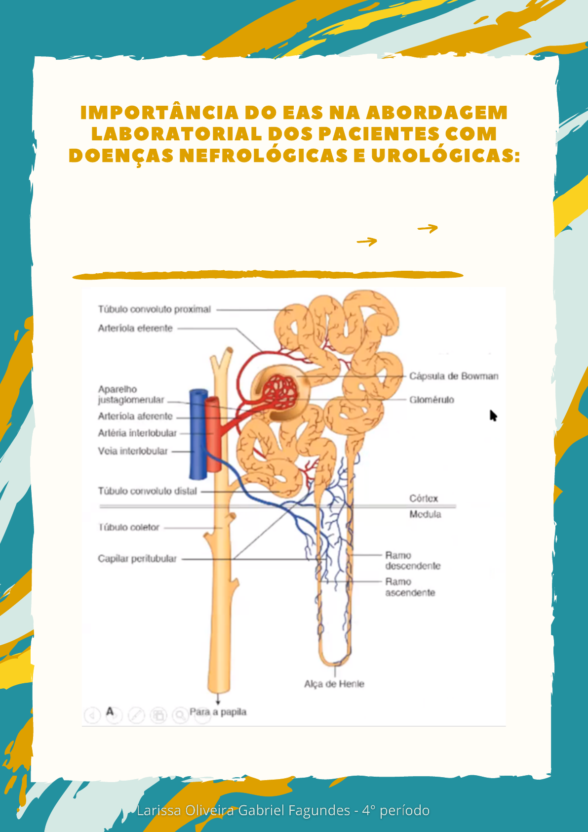 ·GLOMÉRULO = É um sistema único de filtração capilar de alta pressão localizado entre duas arteríolas: a aferente e a eferente. ·ARTERÍOLAS = são vasos de alta resistência; ·A arteríola aferente tem um diâmetro maior do que a arteríola eferente A pressão arterial no glomérulo é extremamente elevada para um leito capilar Capaz de forçar o líquido e os solutos para fora do sangue até o capilar glomerular ao longo de todo o seu comprimento IMPORTÂNCIA DO EAS NA ABORDAGEM LABORATORIAL DOS PACIENTES COM DOENÇAS NEFROLÓGICAS E UROLÓGICAS: FORMAÇÃO DA URINA: Excreção = filtração – reabsorção + secreção. A filtrabilidade dos solutos é inversamente proporcional ao seu tamanho. Urina normal: Contém resíduos metabólicos e, pouca ou nenhuma proteína plasmática, células do sangue ou moléculas de glicose. Ureia sérica (azoternia); Creatinina sérica; Acúmulo de resíduos nitrogenados no sangue que seriam normalmente excretados na urina; Proteinúria e microalbuminúria; Hematúria (presença de 1 ou mais hemácias/campo); Presença de cilindros granulosos, células epiteliais tubulares e cilindros de células epiteliais; Diminuição da TFG (Taxa de filtração glomerular); Diminuição do volume urinário (oligúria) à comumente observado, mas nem sempre; Acidose metabólica Nefrolitíase; Gonorreia e outras infecções sexualmente transmissíveis - estenoses uretrais de causa infecciosa; Tumores da bexiga e invasão secundária da bexiga por tumores originados das estruturas localizadas ao redor e da uretra podem comprimir o colo vesical ou a uretra, causando obstrução; Constipação intestinal e impactação fecal >>> Compressão e obstrução da uretra Bexiga espástica > incapacidade de armazenar urina; Bexiga flácida > incapacidade de eliminar urina; Exfíncter externo não relaxável; Obstrução das vias urinárias inferiores e estase: Homens: Compressão externa da uretra >>> crescimento da próstata; Homens e mulheres: Infecção das vias urinárias (cistite - bexiga); Distúrbios vesicais neurogênicos >>> Interrupção da inervação do órgão; ACHADOS LABORATORIAIS ALTERADOS EM PACIENTES COM DOENÇAS NEFROLÓGICAS Principais doenças urológicas É necessário um período de pelo menos 6 horas sem urinar para concentrar a urina; Geralmente é a primeira amostra de urina do dia; Faz-se a higiene da genitália externa com água e sabão; Descarta o primeiro jato de urina e coleta o jato intermediário no pote; Esta amostra é útil para testes qualitativos de proteína e de densidade específica; A amostra recém coletada é mais confiável >>> a medida que o tempo passa a urina coletada pode conter hemácias degradadas, sedimentos desintegrados e bactérias que de multiplicam rapidamente. Descarta-se a primeira urina do dia; Coleta as demais urinas ao longo de 24 horas; Refrigera a amostra até chegar no laboratório URINA ROTINA OU URINA TIPO 1: URINA 24 H: Incontiência urinária >>> emissão involuntária de urina; Câncer de Bexiga Achados laboratoriais em pacientes com doenças urológicas: Hematúria; Bacteriúria; Piúria; Presença de cristais; Ureia e creatinina séricas; Coleta da urina para a realização dos testes: EAS (Elementos Anormais e sedimentoscopia); Dosagem de creatinina sérica; Clearance de creatinina; Taxa de filtração glomerular; Dosagem de ureia sérica; Cistatina C; Física: cor e aspecto; Química: tira reagente: Densidade, pH, proteínas, glicose, urubilinogênio, bilirrubina, cetonas, sangue, leucócitos, nitrito e ácido ascórbico; Sedimentoscopia da urina: Eritrócitos, leucócitos, cilindros, bactérias, células epiteliais, cristais, entre outros Exames laboratoriais para avaliar a função renal e a função da bexiga: 1. 2. 3. 4. 5. 6. EAS - ELEMENTOS ANORMAIS E SEDIMENTOSCOPIA: - O exame de elementos e sedimentos anormais (EAS) da urina, ou exame de urina tipo I, é um exame de rotina e corriqueiro, que faz análise: A presença de cristais urinários é comum e raramente apresenta relevância clínica; Cristalúria>>> cálculos renais; Importância da identificação de cristais anormais na urina >>> Diagnóstico de erros inatos do metabolismo, doenças hepáticas e outras condições; A formação dos cristais ocorre quando sais urinários precipitam-se em virtude de alterações de pH, temperatura ou ainda, condições de concentração do filtrado glomerular; Cristais mais comuns em urinas ácidas >>> Uratos; Cristais mais comuns em urinas alcalinas >>> Cristais de fosfato, biurato de amônio e carbonato de cálcio; Cristais anormais >>> Formados por cistina, colesterol, bilirrubina, leucina e tirosina, principalmente. Estão relacionados com as seguintes condições metabólicas: Creatinina: Derivada principalmente do metabolismo da creatina muscular; O nível sérico da creatinina depende da idade, sexo, do estado nutricional e massa muscular; Nem sempre a creatinina tem relação com a Taxa de filtração glomerular (TFG); Ex: alimentação, desnutrição, DRC, amputação e perda muscular. Quanto maior a concentração de creatinina sérica, menor estará a TFG; A Creatinina sérica é um parâmetro renal que demora se alterar. Valor da creatinina sérica acima do normal só ocorre a partir de diminuição da ordem de 50-60% da TFG. Valores de referência: Era considerada o melhor método de determinação da TFG na prática clínica; A depuração da creatinina não preenche os critérios de um marcador ideal da TFG, pois além de filtrada, a creatinina também é secretada pelo túbulo contorcido proximal > A depuração da creatinina superestima a TFG. Quanto > depuração da creatinina < [ creatinina sérica]; Utiliza a amostra de urina de 24 horas - Cistais de cistina: indica cistinúria e estão relacionados com erros metabólicos; - Cristais de colesterol: Bastante raros, mas podem estar presentes sobretudo em amostras refrigeradas DOSAGEM DE CRATININA SÉRICA: - 0,7 - 1,3 mg/ dL (H