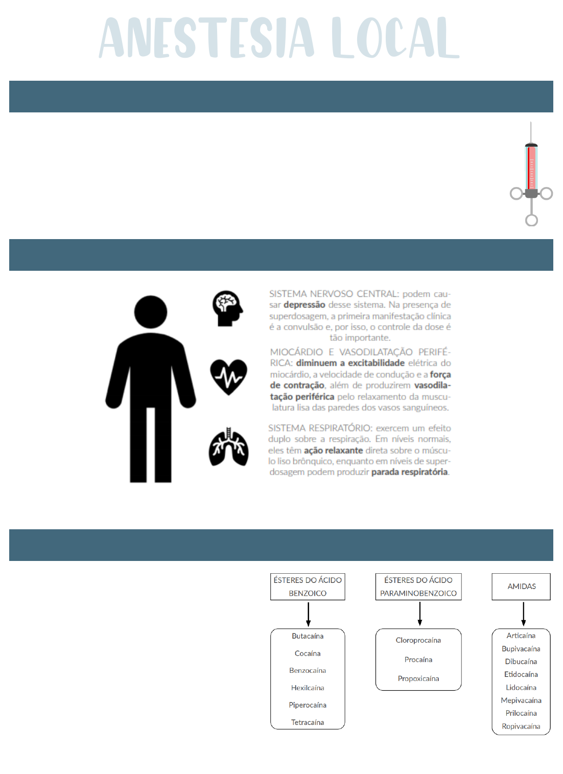 Anestesia local Introdução É indispensável a qualquer intervenção cirúrgica odontológica.. Os anestésicos locais são substâncias químicas que bloqueiam os potenciais de ação que transmitem os estímulos dolorosos temporariamente e, por isso, são fundamentais a abordagem cirúrgica. Lembrando que tais substâncias também possuem alguns efeitos colaterais a serem considerados. Efeitos adversos Efeitos adversos dos anestésicos locais. Fonte: Telessaúde RS – UFRGS Tipos de anestésicos Os anestésicos locais podem ser classificados de acordo com a sua função orgânica em ésteres do ácido benzoico, ésteres do ácido paraminobenzoico e amidas. É importante ressaltar que os ésteres deixaram de ser utilizados de forma mais ampla devido a sua degradação, que resulta em um metabólico com alto potencial alergênico (ácido paraminobenzoico–PABA). Efeitos adversos dos anestésicos locais. Fonte: Telessaúde RS – UFRGS (anestesia local) É importante lembrar de características como propriedades, indicações, contraindicações e segurança, tempo de ação. Por fim, lembre-se que todos os anestésciso locais injetáveis clinicamente eficazes são vasodilatadores. Sendo este fator variável a depender do local de injeção e resposta individual do paciente. Após a introdução de um anestésico local nos tecidos, os vasos sanguíneos (principalmente arteríolas e capilares) da área dilatam-se, resultando em um aumento da perfusão/fluxo sanguíneo no local. Desta forma, se faz necessárias substancias vasoconstritoras para compensar o prejuízo da vasodilatação. Contraindicações Colinesterase plasmática atípica: Não utilizar anestésicos ésteres, já eu as enzimas responsáveis pela sua metabolização estão afetadas, podendo causar efeitos e superdosagem dos anestésicos (fazer uso de amidas: lidocaína, bupivacaína, prilocapina, mepivacaína ou articaína) Metahemoglobinemia idiopática ou congênita Não utilizar prilocaína, pois doses excessivas deste anestésico poderão gerar algum sintoma clínico Disfunção hepática significativa (ASA 3-4) Utilizar os anestésicos de forma cautelosa (ou seja, utilizar a menor quantidade possível de tubetes), visto que o órgão não poderá fazer sua metabolização de forma adequada Disfunção renal significativa ( ASA 3-4) Utilizar os anestésicos de forma cautelosa (ou seja, utilizar a menor quantidade possível de tubetes), visto que o órgão não poderá fazer sua metabolização de forma adequada Gravidez Não utilizar prilocaína ou articaína para evitar o risco de desenvolvimento de metahemoglobinemia. Nestes casos, a lidocaína deve ser utilizada Vasoconstritores São fármacos adicionados aos tubetes para compensar o efeito vasodilatador dos anestésicos. .Essa contração dos vasos controla a perfusão tecidual e o fluxo sanguíneo, reduzindo o sangramento no local da administração, cooperando também no que diz respeito a hemostasia transoperatória. Lembrando também que essa característica contribui para que a absorção do anestésico para o sistema cardiovascular torna-se mais lenta, e assim terá níveis menores no sangue. Levando em conta tais características, o resultado é: aumento do tempo de ação da anestesia local e diminuição do risco de toxicidade do anestésico. Contraindicações Absolutas: - Doenças cardiovasculares: angina instável, infarto do miocárdio recente (há menos de 6 meses), cirurgia de revascularização miocárdica recente (há menos de 6 meses), acidente vascular cerebral recente (há menos de 6 meses), arritmias refratárias, hipertensão arterial sistêmica grave não-tratada ou nãocontrolada (pressão arterial sistólica ↑180 mmHg e diastólica ↑110 mmHg), insuficiência cardíaca congestiva intratável ou não-controlada.. - Hipertireoidismo não-controlado. Além disso, a adrenalina é contraindicada para pacientes que apresentem evidência clínica de hipertireoidismo.. - Diabetes melito não-controlado - Feocromocitoma (tumor raro que acomete glândulas). Este tumor causa um aumento nos níveis circulantes de adrenalina e noradrenalina e, para evitar, uma intoxicação sistêmica por estas substâncias, o uso de anestésicos locais com vasoconstritores está contraindicado. - Hipersensibilidade a sulfitos. Os sulfitos são encontrados em todos anestubes que contenham vasoconstritores, pois ele atua como antioxidante para esta substância. Portanto, pacientes que apresentam hipersensibilidade ou alergia aos sulfitos não poderão receber anestesia local associada ao uso de vasoconstritores Relativas: - Doença cardiovascular significativa (ASA III–IV): não utilizar altas concentrações de vasoconstritores (como a adrenalina em fios retratores ou grandes quantidades de tubetes anestésicos, seguindo a orientação do quadro abaixo). - Diabetes: a adrenalina deve ser evitada, mesmo que utilizada em pacientes com a doença compensada. A adrenalina provoca a quebra de glicogênio em glicose, podendo resultar em hiperglicemia. Por isso, tende-se a escolher a prilocaína com felipressina ou mepivacaína sem vasoconstritor. - Gravidez: a administração de felipressina está absolutamente contraindicada devido às ações ocitócicas (aumento das contrações uterinas) deste vasoconstritor. Também, deve-se evitar o uso de noradrenalina, pois a mesma possui um risco de diminuição da irrigação placentária. A adrenalina apresenta os mesmos efeitos que a noradrenalina, mas apenas se usada em altas doses. Interação medicamentosa Alguns medicamentos não contraindicam o uso do anestésico local; mas ao realizarmos anestesia local em um paciente que utiliza um fármaco específico, podemos observar algumas reações. Antagonistas β-adrenérgicos não seletivos (Ex.: Propanolol): O metabolismo hepático dos anestésicos locais do tipo amida por ser diminuído. Antiarrítmicos (Ex.: Mexiletina e tocainida): Deperessão aditiva do SNC e SCV. Orien