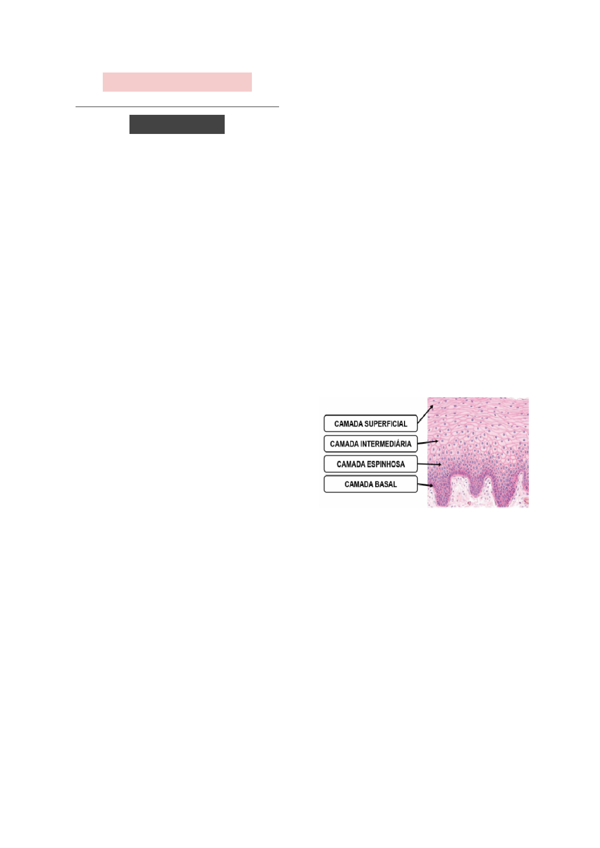His����gi� � Em��i�l��i� O��l Epi�éli� �� Mu��s� O epitélio da mucosa da boca é do tipo estratificado pavimentoso e suas células principais são os queratinócitos. Por causa da sua função de forramento, o epitélio oral prolifera constantemente, porém, com velocidades variáveis segundo a sua localização, sendo originadas novas células na sua parte mais profunda e descamadas outras na sua superfície. Os tecidos que compõem a cavidade oral possuem características distintas e isso é estabelecido pelas determinadas funções que as células teciduais são submetidas. Os queratinócitos são as principais células do epitélio oral e são responsáveis por promover um revestimento e/ou depositar queratina, porém nem todas as regiões da cavidade oral apresentam queratina em sua composição. O epitélio oral pode ser classificado como queratinizado e não queratinizado e cada um deles possui características, camadas e localização específicas. Os �i��s �� �élu��� q�e ���ão p����n�e� na ����sa ���� são: • Queratinócitos → São células responsáveis pela deposição de queratina e promovem proteção através do revestimento do tecido. • Melanócitos → São células responsáveis pela produção da melanina que está diretamente relacionada com a coloração dos tecidos. • Células de Langerhans → São células dendríticas responsáveis por promover a defesa dos tecidos contra microrganismos e agentes agressores. • Células de Merkel → São células responsáveis pela sensibilidade nervosa do tecido. • Células sanguíneas → São células como os linfócitos e neutrófilos que normalmente estão relacionadas com inflamação, porém são encontradas esporadicamente no tecido sadio. Epi�éli� �ão q���a��n��a�� É classificado como: Tecido epitelial pavimentoso, estratificado e não queratinizado. - As camadas do epitélio não queratinizado possuem a seguinte nomenclatura: As regiões da cavidade oral que apresentam esse tipo de epitélio são: Mucosa jugal, mucosa Labial, mucosa alveolar, região do ventre de língua, palato mole e as papilas foliadas. Epi�éli� ��e��t��i��d� - É classificado como: Tecido epitelial pavimentoso estratificado e pode ser ortoqueratinizado ou paraqueratinizado. - As camadas do epitélio queratinizado possuem a seguinte nomenclatura: O tecido ortoqueratinizado: possui a característica de não possuir núcleos celulares na camada córnea do tecido, assim caracterizando um processo total de deposição da queratina. - As regiões da cavidade oral que apresentam o tecido epitelial ortoqueratinizado são: O palato duro, papilas valadas e as papilas filiformes. O tecido paraqueratinizado: Possui a presença de núcleo e restos celulares que podem aparecer eventualmente na camada córnea do tecido, assim caracterizando uma deposição parcial de queratina. - As regiões da cavidade oral que apresentam o tecido epitelial paraqueratinizado são: a gengiva e as papilas fungiformes.