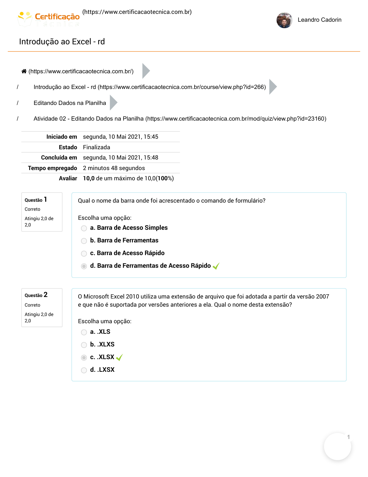 (https://www.certificacaotecnica.com.br) Leandro Cadorin Introdução ao Excel - rd Questão 1 Correto Atingiu 2,0 de 2,0 Questão 2 Correto Atingiu 2,0 de 2,0 / / / Iniciado em segunda, 10 Mai 2021, 15:45 Estado Finalizada Concluída em segunda, 10 Mai 2021, 15:48 Tempo empregado 2 minutos 48 segundos Avaliar 10,0 de um máximo de 10,0(100%) Qual o nome da barra onde foi acrescentado o comando de formulário? Escolha uma opção: a. Barra de Acesso Simples b. Barra de Ferramentas c. Barra de Acesso Rápido d. Barra de Ferramentas de Acesso Rápido O Microsoft Excel 2010 utiliza uma extensão de arquivo que foi adotada a partir da versão 2007 e que não é suportada por versões anteriores a ela. Qual o nome desta extensão? Escolha uma opção: a. .XLS b. .XLXS c. .XLSX d. .LXSX (https://www.certificacaotecnica.com.br/) Introdução ao Excel - rd (https://www.certificacaotecnica.com.br/course/view.php?id=266) Editando Dados na Planilha Atividade 02 - Editando Dados na Planilha (https://www.certificacaotecnica.com.br/mod/quiz/view.php?id=23160) 1 https://www.certificacaotecnica.com.br/ https://www.certificacaotecnica.com.br/ https://www.certificacaotecnica.com.br/course/view.php?id=266 https://www.certificacaotecnica.com.br/mod/quiz/view.php?id=23160 Questão 3 Correto Atingiu 2,0 de 2,0 Questão 4 Correto Atingiu 2,0 de 2,0 Questão 5 Correto Atingiu 2,0 de 2,0 Uma guia permanece oculta na faixa de opções até que um determinado objeto seja selecionado. Qual o nome desta guia? Escolha uma opção: a. Guia Forma b. Guia Formatar c. Guia Formatação d. Guia Objeto O Microsoft Excel permite que imagens e formas sejam inseridas numa planilha. Os comandos para inseri-las estão localizadas em qual guia? Escolha uma opção: a. Guia Inserir b. Guia Formatar c. Guia Inserir Imagens d. Guia Página Inicial A opção Formatar como Tabela está localizada em qual guia da faixa de opções? Escolha uma opção: a. Guia Arquivo b. Guia Inserir c. Guia Página Inicial d. Guia Formatar