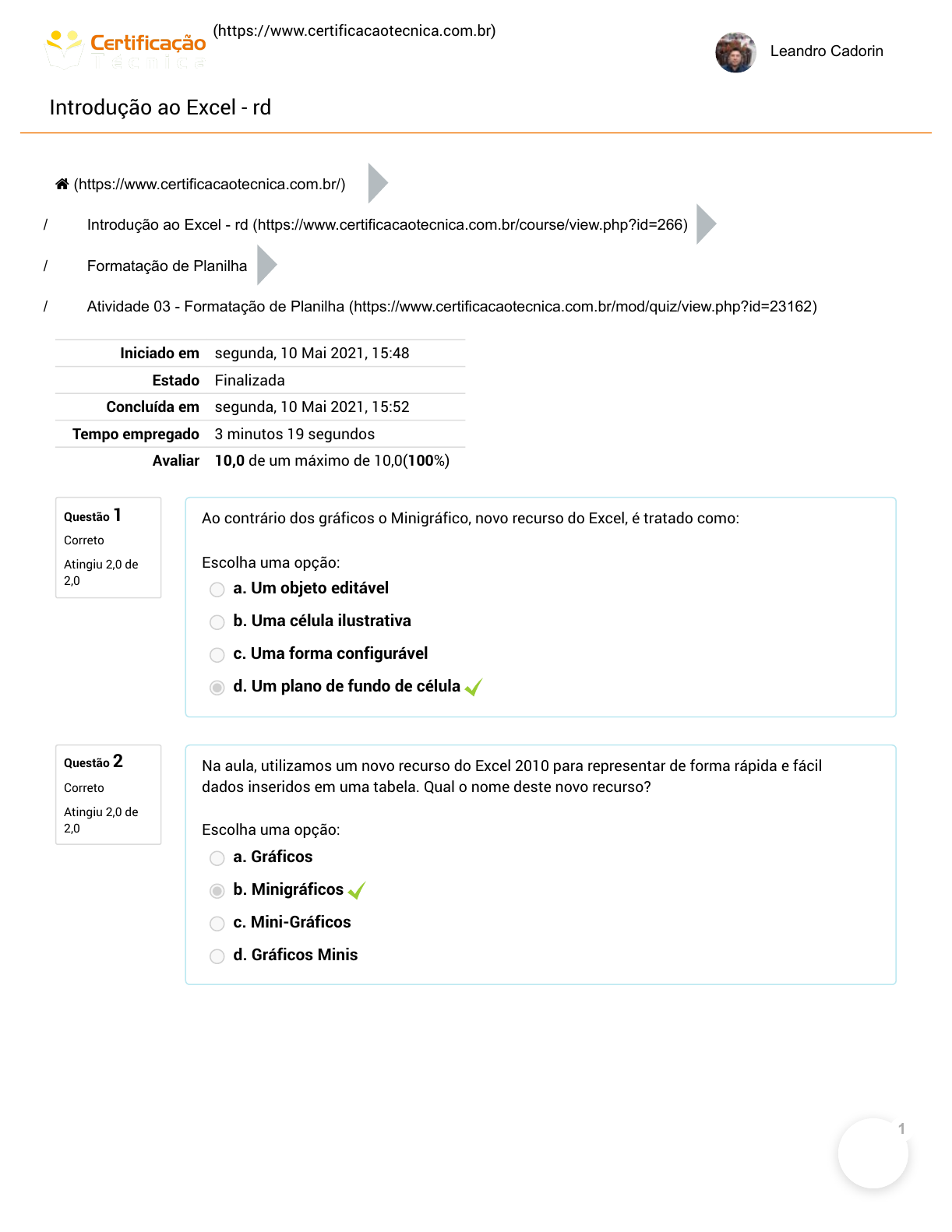 (https://www.certificacaotecnica.com.br) Leandro Cadorin Introdução ao Excel - rd Questão 1 Correto Atingiu 2,0 de 2,0 Questão 2 Correto Atingiu 2,0 de 2,0 / / / Iniciado em segunda, 10 Mai 2021, 15:48 Estado Finalizada Concluída em segunda, 10 Mai 2021, 15:52 Tempo empregado 3 minutos 19 segundos Avaliar 10,0 de um máximo de 10,0(100%) Ao contrário dos gráficos o Minigráfico, novo recurso do Excel, é tratado como: Escolha uma opção: a. Um objeto editável b. Uma célula ilustrativa c. Uma forma configurável d. Um plano de fundo de célula Na aula, utilizamos um novo recurso do Excel 2010 para representar de forma rápida e fácil dados inseridos em uma tabela. Qual o nome deste novo recurso? Escolha uma opção: a. Gráficos b. Minigráficos c. Mini-Gráficos d. Gráficos Minis (https://www.certificacaotecnica.com.br/) Introdução ao Excel - rd (https://www.certificacaotecnica.com.br/course/view.php?id=266) Formatação de Planilha Atividade 03 - Formatação de Planilha (https://www.certificacaotecnica.com.br/mod/quiz/view.php?id=23162) 1 https://www.certificacaotecnica.com.br/ https://www.certificacaotecnica.com.br/ https://www.certificacaotecnica.com.br/course/view.php?id=266 https://www.certificacaotecnica.com.br/mod/quiz/view.php?id=23162 Questão 3 Correto Atingiu 2,0 de 2,0 Questão 4 Correto Atingiu 2,0 de 2,0 Questão 5 Correto Atingiu 2,0 de 2,0 Em forma de Linha, um minigráfico pode apresentar em seu corpo pontos para facilitar a representação dos dados. Como se chamam estes pontos? Escolha uma opção: a. Eixos b. Marcas de pontos c. Marcadores d. Marcas Além de representar valores numéricos, os minigráficos podem representar datas. Mas para isto eles devem estar no formato: Escolha uma opção: a. Tipo de Eixo de Tempo b. Tipo de Eixo de Dias c. Tipo de Eixo de Mês e Ano d. Tipo de Eixo de Data Além do formato de linhas, os minigráficos podem ser exibidos nos formatos de: Escolha uma opção: a. Barras e Colunas b. Colunas e Ganha/Perde c. Cilindros e Colunas d. Barras