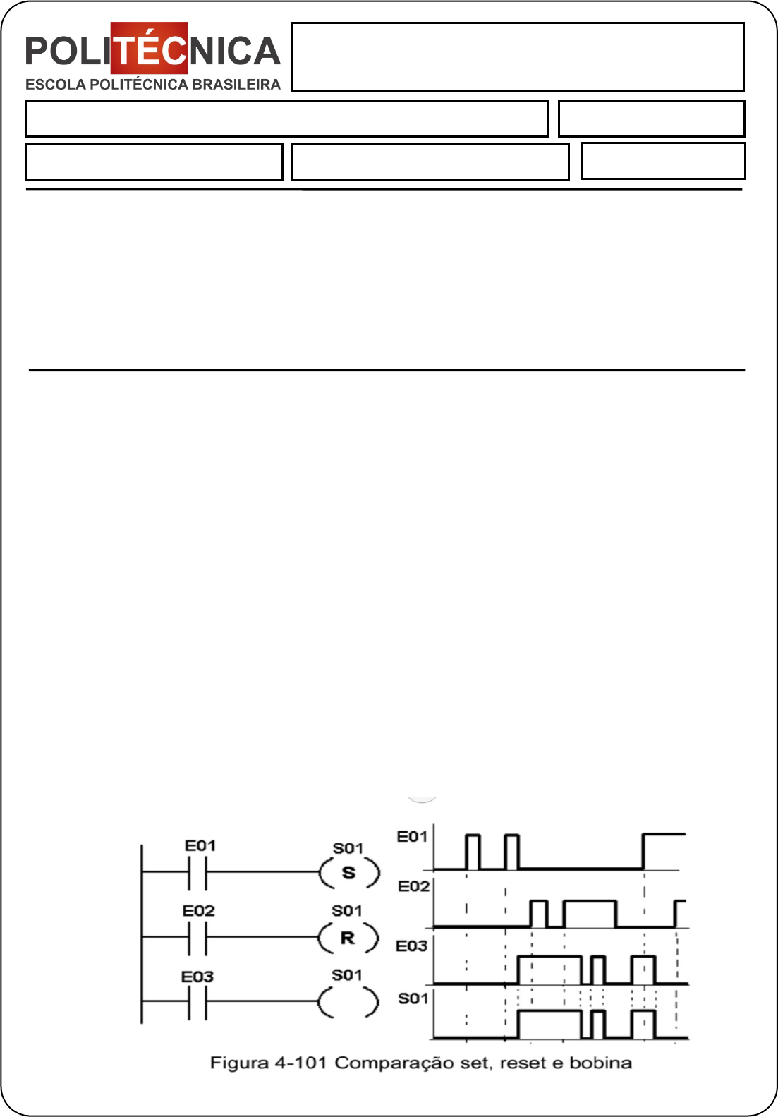 CLP Aluno (a): Vagner de Souza Freitas Data: 17 /05/ 2021 Atividade de Pesquisa NOTA: INSTRUÇÕES: · Esta Avaliação de pesquisa contém 02 questões, totalizando 10 (dez) pontos. · Você deve preencher dos dados no Cabeçalho para sua identificação · Nome / Data de entrega · Utilize o espaço abaixo destinado para realizar a atividade. · Ao terminar grave o arquivo com o nome Avaliação de Pesquisa 01 (nome do aluno). · Envie o arquivo pelo sistema. 1) Definir um programa em ladder para um semáforo, onde temos os seguintes sinais: E01 : Ha: habilita circuito, S01 : VM1: Lâmpada vermelha 01, S02 : AM1: Lâmpada amarela 01, S03 : VD1: Lâmpada verde 01, S04 : VM2: Lâmpada vermelha 02, S05 : AM2: Lâmpada amarela 02, S06 : VD2: Lâmpada verde 02. O algoritmo de controle é o seguinte: Ligar a lâmpada verde durante 10 segundos; Ligar a lâmpada vermelha durante 13 segundos; Ligar a lâmpada amarela durante 3 segundos; Utilizar a seguinte seqüência: primeiro ligar a lâmpada verde, após tempo de verde, ligar a lâmpada amarela, após tempo de amarela ligar a lâmpada vermelha. Ao ligar lâmpada vermelha também ligar a lâmpada verde do outro semáforo. 2) Definir um programa em ladder para a máquina sequencial de envase de líquidos, representada na figura 4-36. Onde temos os seguintes sinais: E01 : Ha: habilita máquina, E02 : S1: sensor ótico de presença de recipiente na entrada, E03 : S2: Sensor ótico de presença de recipiente no bico, E04 : S3: Sensor ótico de presença de recipiente na saída, S01 : M1: contator aciona motor 1 da correia de transporte, S02 : Bico: Aciona bico de dosagem. Utilizar o seguinte algoritmo de controle: Ao habilitar a máquina seguir a seqüência abaixo; Ligar motor para posicionar produto no bico, caso sensor de saída livre e produto na entrada; Quando existir produto no bico (S2=1) acionar válvula durante 3 segundos; Ao encher a lata, desligar o bico e esperar 1 segundo; Após espera, ligar o motor até atingir o sensor de saída; Ligar motor para posicionar novamente o produto no bico, caso sensor de saída livre e produto na entrada; Repetir passos anteriores, enquanto existir recipiente na entrada e a máquina estiver habilitada. Avaliação de Pesquisa : CLP