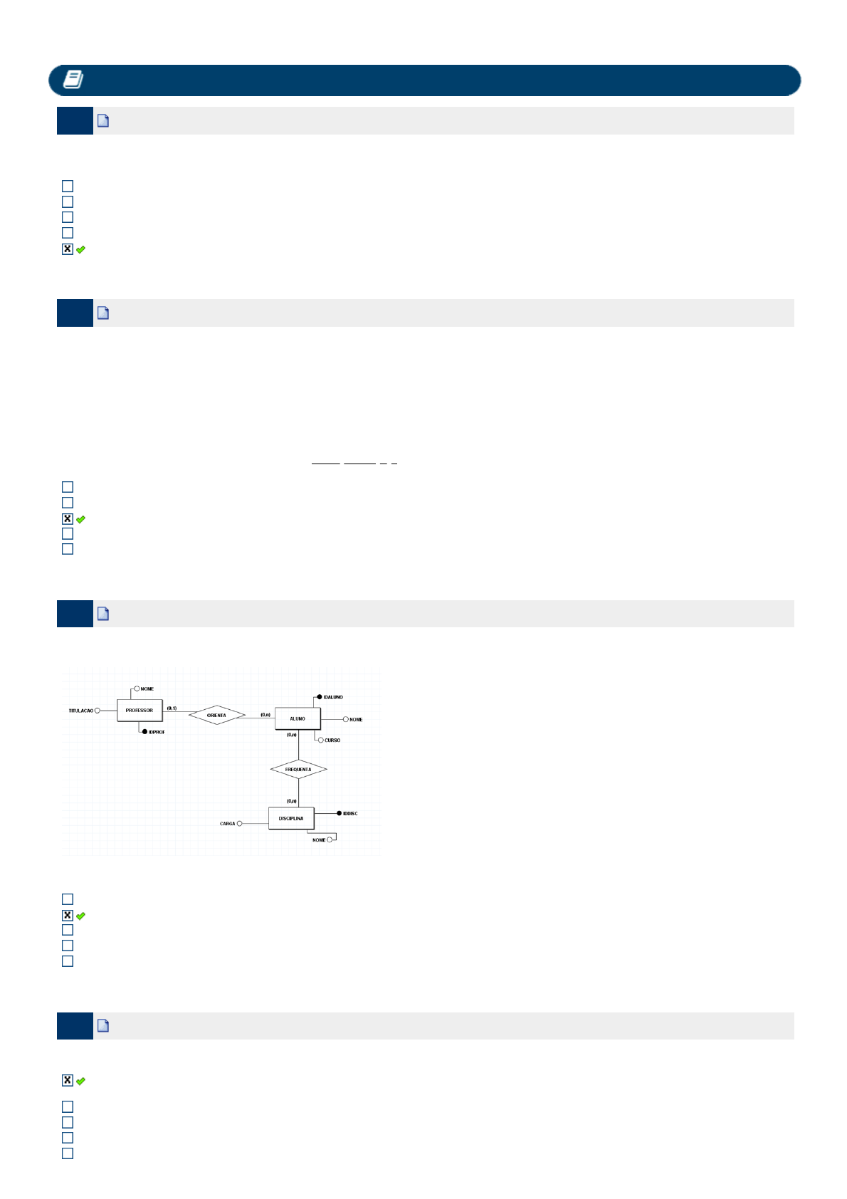 15/12/2020 Estácio: Alunos https://simulado.estacio.br/alunos/ 1/3 BANCO DE DADOS - EEX0022 1. Ref.: 3892017 Pontos: 1,00 / 1,00 Que invenção da IBM permitiu a utilização dos computadores na implementação de sistemas de informação, inaugurando a chamada era do processamento de dados? A memória RAM. O modelo relacional de dados. O microcomputador. Os arquivos eletrônicos. O disco magnético. 2. Ref.: 3882898 Pontos: 1,00 / 1,00 (VUNESP 2009 CETESB - Analista de Tecnologia da Informação - Banco de Dados) Considere os seguintes exemplos de atributos contidos em uma tabela de um banco de dados relacional: I. Rua das Rosas, 505, São Paulo, SP. II. Parafuso. III. Masculino. Constitui(em) exemplo(s) de atributo(s) composto(s) o contido em: I e III, apenas I e II, apenas I, apenas II e III, apenas I, II e III 3. Ref.: 3891740 Pontos: 1,00 / 1,00 (VUNESP 2010 CEAGESP Analista de Sistemas Desenvolvimento de Aplicações adaptado) Considere o seguinte diagrama entidade- relacionamento de um banco de dados relacional, representando as bibliotecas de uma universidade. A partir desse diagrama, pode-se afirmar que: Disciplina não pode ter atributos com o valor nulo. Um aluno pode frequentar diversas disciplinas e pode ser orientado por apenas um professor. Aluno e Disciplina são entidades fracas. Todos os atributos de Aluno podem ser classificados como compostos. Os atributos ID Prof, ID Aluno e ID Disc devem ser implementados como sendo do tipo literal. 4. Ref.: 3891750 Pontos: 1,00 / 1,00 (Tribunal de Justiça de Pernambuco - 2012 - Cargo: Analista Judiciário - Área Analista de Sistemas ) É correto que uma relação está na: 2FN se, e somente se, estiver na primeira e todos os atributos não chave forem totalmente dependentes da totalidade da chave primária. 3FN se, e somente se, todos os domínios básicos forem multivalorados. 2FN se, e somente se, estiver na primeira e todos os atributos não chave forem dependentes não transitivos da chave primária. 3FN se, e somente se, ela estiver na segunda e todos os atributos não chave contiverem mais de um valor discreto periódico. javascript:alert('C%C3%B3digo da quest%C3%A3o: 3892017.'); javascript:alert('C%C3%B3digo da quest%C3%A3o: 3882898.'); javascript:alert('C%C3%B3digo da quest%C3%A3o: 3891740.'); javascript:alert('C%C3%B3digo da quest%C3%A3o: 3891750.'); 15/12/2020 Estácio: Alunos https://simulado.estacio.br/alunos/ 2/3 2FN se, e somente se, todos os domínios básicos contiverem mais de um valor discreto periódico. 5. Ref.: 3907057 Pontos: 1,00 / 1,00 Qual dos fatores a seguir não deve ser levado em consideração ao implementarmos um banco de dados levando em conta questões de desempenho? Organização de políticas de acesso a dados. Restrições de exclusividade em colunas da tabela. Consultas e transações de banco de dados. Restrições de tempo de consulta e transações. Frequências esperadas de operações de atualização. 6. Ref.: 3907078 Pontos: 1,00 / 1,00 Dentre as opções a seguir, assinale a que contém a expressão em SQL que inclui uma coluna Email do tipo VARCHAR(80) na tabela PROFESSOR. ALTER TABLE PROFESSOR ADD COLUMN Email VARCHAR(80). ADD COLUMN Email VARCHAR(80) TO TABLE PROFESSOR. ALTER TABLE PROFESSOR MODIFY COLUMN Email VARCHAR(80). ALTER DATABASE PROFESSOR ADD COLUMN Email VARCHAR(80). ALTER DATABASE ADD COLUMN Email VARCHAR(80) TO PROFESSOR. 7. Ref.: 3907329 Pontos: 1,00 / 1,00 Em sistemas de banco de dados, uma transação corresponde a uma sequência de instruções de consulta e/ou atualização. Instrução que faz com que uma transação corrente seja revertida, ou seja, desfaz todas as atualizações realizadas pelas instruções SQL na transação é: cancel commit reverse rollback retrieve 8. Ref.: 3908203 Pontos: 1,00 / 1,00 Seja uma tabela assim estruturada: DISCPLINA(CODIGOD, DESCRICAO, CARGAHORARIA). Qual código a seguir retorna as disciplinas cuja descrição inicia pela letra "A" e que tenham carga horária menor que 80 horas? javascript:alert('C%C3%B3digo da quest%C3%A3o: 3907057.'); javascript:alert('C%C3%B3digo da quest%C3%A3o: 3907078.'); javascript:alert('C%C3%B3digo da quest%C3%A3o: 3907329.'); javascript:alert('C%C3%B3digo da quest%C3%A3o: 3908203.'); 15/12/2020 Estácio: Alunos https://simulado.estacio.br/alunos/ 3/3 9. Ref.: 3892039 Pontos: 1,00 / 1,00 (FCC - 2009 - TRE-PI - Analista Judiciário - Tecnologia da Informação - Análise de Sistemas) Para obter todas as linhas da tabela B, o comando SELECT deverá utilizar na sequência um JOIN entre as tabelas A e B do tipo: CROSS JOIN. RIGHT OUTER JOIN. LEFT OUTER JOIN. INNER JOIN. FULL OUTER JOIN. 10. Ref.: 3891770 Pontos: 0,00 / 1,00 Considere que cada tabela a seguir pertence a um banco de dados distinto. Qual consulta retorna o nome e o CPF dos cidadãos que são clientes e alunos? SELECT NOME, CPF FROM ALUNO EXCEPT SELECT NOME, CPF FROM CLIENTE; SELECT NOME, CPF FROM CLIENTE INTERSECT SELECT NOME, CPF FROM ALUNO; SELECT NOME, CPF FROM CLIENTE JOIN SELECT NOME, CPF FROM ALUNO; SELECT NOME, CPF FROM ALUNO UNION SELECT NOME, CPF FROM CLIENTE; SELECT NOME, CPF FROM CLIENTE MINUS SELECT NOME, CPF FROM ALUNO; javascript:alert('C%C3%B3digo da quest%C3%A3o: 3892039.'); javascript:alert('C%C3%B3digo da quest%C3%A3o: 3891770.');