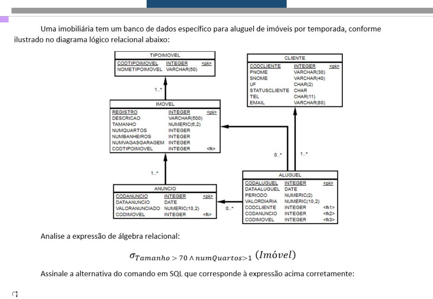 IMPLEMENTAÇÃO DE BANCO DE DADOS Quest.: 1 1. SELECT * FROM Imovel WHERE Tamanho > 70 OR numQuartos >1 SELECT * FROM Imovel WHERE Tamanho > 70 AND numQuartos >1 SELECT Tamanho > 70 AND numQuartos > 1 FROM Imovel SELECT Imovel FROM Tamanho > 70 OR numQuartos > 1 SELECT Tamanho > 70 OR numQuartos > 1 FROM Imovel Quest.: 2 2. Qual dos comandos SQL abaixo pode ser utilizado para incluir na definição da tabela aluno o atributo CPF com 11 caracteres? insert into aluno cpf char(11); alter table aluno add cpf char(11); update table aluno insert cpf char(11); add into aluno cpf char(11); alter table aluno insert cpf char(11); Quest.: 3 3. Considere a seguinte consulta SQL:SELECT XXX A FROM TAB.Para que não haja repetições nos valores obtidos como resposta para o atributo A, XXX deve ser substituído por: ALL IN SINGLE DISTINCT LIKE Quest.: 4 4. Observe a tabela R: Qual será o resultado da consulta: SELECT X FROM R WHERE Y is null; null e 5 1 e 4 1 e 5 5 4 e null Quest.: 5 5. Dentre as opções a seguir, qual não é uma função de grupo? CONT(*) MAX(x) AVG (x) SUM(x) MED(X) Quest.: 6 6. quinze linhas. cinco linhas. seis linhas. oito linhas. dez linhas. Quest.: 7 7. SEJA O MODELO: Forncedor(cod_fornec, nome_fornec, telefone, cidade, uf) Estado(UF, nome_estado) A expressão SQL que obtém os nomes dos estados para os quais não há fornecedores cadastrados é: SELECT E.nome_estado FROM Estado AS E, FROM Fornecedor AS F WHERE E.UF = F.UF SELECT E.UF FROM ESTADO AS E WHERE E.nome_estado NOT IN (SELECT F.UF FROM FORNECEDOR AS F) SELECT E.nome_estado FROM Estado AS E, FROM Fornecedor as F WHERE E.nome_estado = F.UF SELECT E.nome_estado FROM Estado AS E WHERE E.UF NOT IN (SELECT F.UF FROM FORNECEDOR AS F) SELECT E.nome_estado FROM Estado AS E WHERE E.UF IN (SELECT F.UF FROM FORNECEDOR AS F) Quest.: 8 8. De acordo com a tabela de banco de dados relacional abaixo: Carro(placacarro(PK),tipo,modelo,ano,chassis,km,valor,cor,filial_idfilial(FK)) -Construa uma consulta em SQL para retornar "o ano dos carros que são mais velhos que a média dos anos de todos os carros". SELECT ano FROM carro WHERE ano > AVG(ano) SELECT ano, AVG(ano) FROM carro SELECT ano FROM carro WHERE ano > (SELECT AVG(*) FROM carro) SELECT ano FROM carro WHERE ano > (SELECT AVG(ano) FROM carro) SELECT ano FROM carro WHERE ano = (SELECT AVG(ano) FROM carro) Quest.: 9 9. Considere a seguinte consulta SQL: SELECT nome, count(*) FROM aluno GROUP BY nome Esta consulta tem como resultado. todos os atributos das tabelas nome e aluno. o atributo nome e o número de registros existentes para cada nome, da tabela aluno. o atributo nome e o número de registros existentes para cada nome, na tabela nome. o atributo nome e a soma do conteúdo do atributo nome, da tabela aluno. todos os atributos da tabela nome, além do atributo especial Count. Quest.: 10 10. A cláusula having, quando usada, estabelece uma condição sobre uma agregação obtida de: order by em uma expressão select. group by em uma cláusula order by. group by em uma expressão select. sum em uma expressão create. Reorganiza-se automaticamente com pequenas mudanças locais.