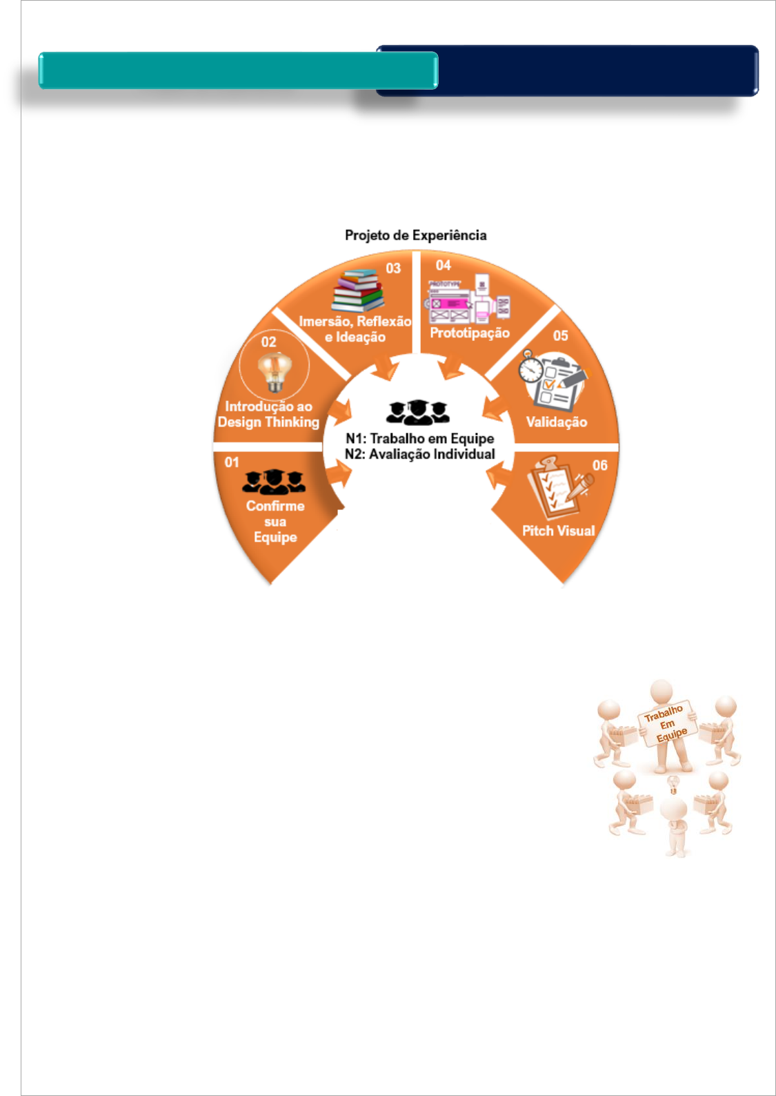 Projeto de Experiência Pós-graduação Trilha de Aprendizagem Olá, Estudante! Bem-vindo (a) ao Módulo Projeto de Experiência! Esta é uma fase de grande importância de seu curso, pois é o momento de colocar em prática todo o conhecimento adquirido até aqui e uma excelente oportunidade de trabalharmos em equipe. Sim, aqui você desenvolverá um trabalho em Equipe podendo compartilhar ideias, trocar experiências e fortalecer sua rede de contatos. Projeto de Experiência Pós-graduação Organização do Projeto Antes de iniciar seu Projeto, você deverá conhecer e confirmar a sua Equipe de trabalho. Para isso, acesse o Material de Aula e clique em Grupo do Projeto. Você identificará as pessoas que irão compor a sua equipe de trabalho para o Projeto de Experiência. Caso o seu nome não esteja inserido em algum grupo, orientamos que faça contato no Fórum Café, bate-papo e Networking e nos sinalize sobre a ocorrência. Organizamos a sua jornada no Projeto de Experiência em 4 Etapas, em que a tomada de decisão deverá ser realizada em equipe com até 6 participantes. Etapa 1 - Design Thinking: conceitos, objetivos e aplicações Etapa 2 - Imersão, Reflexão e Ideação Etapa 3 - Prototipação Etapa 4 - Validação Em cada uma das Etapas, as decisões devem ser tomadas somente após a discussão da Equipe. Metodologia Design Thinking para Resolução de problema profissional Etapa 1 Design Thinking: conceitos, objetivos e aplicações Etapa 2 Imersão, Reflexão e Ideação Etapa 4 Validação Etapa 3 Prototipação Trilha de Aprendizagem Trabalho em Equipe Projeto de Experiência Pós-graduação Fique de olho no Mural de Avisos para participar da Webconferência e do Chat bate-papo. Serão momentos importantes que lhe ajudarão bastante a cumprir cada uma das Etapas do Projeto de Experiência. Metodologia de Avaliação O Processo Avaliativo estará organizado em duas grandes etapas: NOTA 1: A N1 é centrada na apresentação do Pitch Visual, em pdf, que equivale a 60% da Média Final. Ao finalizar a última Etapa do seu Projeto de Experiência, você deverá gerar a apresentação final em PDF, por meio da própria plataforma de construção do Projeto, a Dream Shaper. Em seguida, fazer o upload do arquivo em PDF, no local indicado no Blackboard. NOTA 2: A N2 é composta por uma avaliação em formato de teste com dez questões objetivas, baseada em todo o conteúdo da disciplina. A nota obtida nesta avaliação corresponderá a 40% da Média Final. Tipo de Avaliação Valor Peso N1 Atividade Avaliativa em Equipe que consiste na Entrega do Pitch Visual 10,0 60% N2 Atividade Avaliativa Individual composta por uma avaliação em formato de teste com dez questões objetivas 10,0 40% Média Final: (N1*0,6) + (N2*0,4) 6,0 pontos - mínimo para aprovação Pronto? Vamos conhecer como tudo isso funciona na prática? Acesse o Projeto!