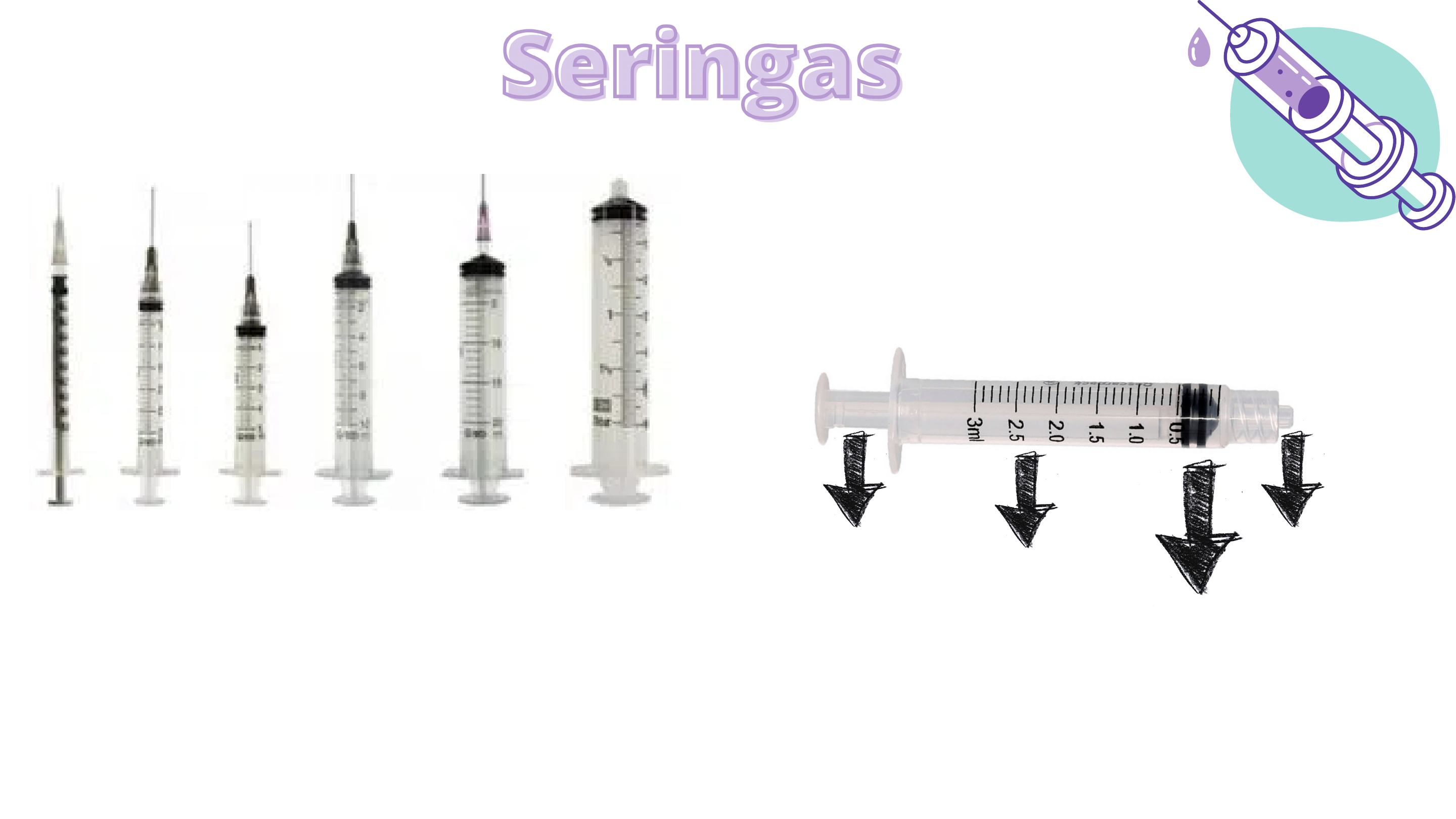 Seringas descartáveis 1ml;3ml; 5ml; 10ml;20ml e 60ml, respectivamente. Partes: CorpoÊmbolo Bico Êmbolo