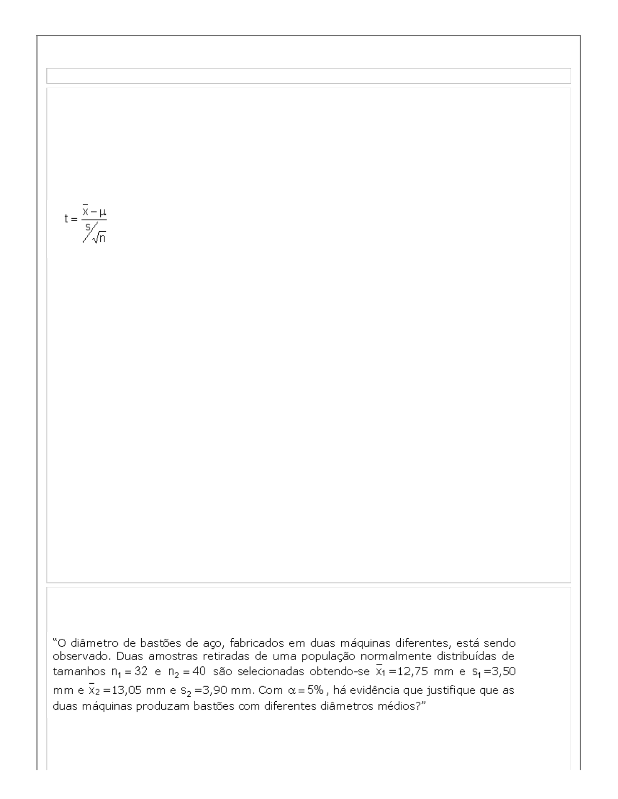 09/11/2020 UNIP - Universidade Paulista : DisciplinaOnline - Sistemas de conteúdo online para Alunos. https://online.unip.br/imprimir/imprimirconteudo 1/10 Exercício 1: "Um revendedor de lâmpadas recebeu um grande carregamento de um fabricante, que afirma que as lâmpadas têm uma vida média de 1200 horas. Uma amostra com 10 lâmpadas extraída deste carregamento apresentou média amostral de 1280 horas e s= 120 horas. Os dados indicam que a vida média das baterias recebidas é maior do que 1200 horas anunciados? Realize o teste com 1% de nível de significância. Assuma que a distribuição de lâmpadas seja normal." Observe o problema acima e responda qual a estatística do teste? A) 5,607 B) 2,790 C) 1,535 D) 0,210 E) 2,108 O aluno respondeu e acertou. Alternativa(E) Comentários: E) Exercício 2: Observe o problema acima e assinale a alternativa que indica o tipo de teste que deve ser realizado e o ponto crítico. 09/11/2020 UNIP - Universidade Paulista : DisciplinaOnline - Sistemas de conteúdo online para Alunos. https://online.unip.br/imprimir/imprimirconteudo 2/10 A) unilateral à esquerda e ponto crítico -1,96. B) unilateral à direita e ponto crítico 1,96. C) bilateral e pontos críticos -1,96 e 1,96. D) unilateral à esquerda e ponto crítico -2,25. E) unilateral à direita e ponto crítico 2,25. O aluno respondeu e acertou. Alternativa(C) Comentários: C) Exercício 3: Observe o problema e responda qual é a estatística do teste? A) 1,23 B) 2,15 C) 09/11/2020 UNIP - Universidade Paulista : DisciplinaOnline - Sistemas de conteúdo online para Alunos. https://online.unip.br/imprimir/imprimirconteudo 3/10 -7,15 D) -0,34 E) 0,4548 O aluno respondeu e acertou. Alternativa(D) Comentários: D) Exercício 4: Em uma escola o professor fez uma pesquisa contando com a participação de 5 alunos. Nesta pesquisa foram feitas duas indagações: Quantas horas você estudou para a prova de Matemática? Qual nota você tirou na prova de Matemática? Os resultados estão listados a seguir: Tempo de estudo (em horas) xi Nota da Prova yi 0 2 1 5 2 6 3 7 4 10 Qual é a equação da reta de regressão linear? A) y*=1,50xi+7,80 09/11/2020 UNIP - Universidade Paulista : DisciplinaOnline - Sistemas de conteúdo online para Alunos. https://online.unip.br/imprimir/imprimirconteudo 4/10 B) y*=1,80xi+2,40 C) y*=-1,50xi+2,78 D D) y*=-1,61xi+7,80 E) y*=0,976xi+7,80 O aluno respondeu e acertou. Alternativa(B) Comentários: B) Exercício 5: Foi feita uma pesquisa contando com a participação de 6 adolescentes de 14 anos. Nesta pesquisa foram feitas duas indagações: Quantos livros você leu no mês de março? Quantas horas você jogou videogame no mês de março? Os resultados estão listados a seguir: Número de horas jogando videogame Números de livros 10 7 24 5 40 3 09/11/2020 UNIP - Universidade Paulista : DisciplinaOnline - Sistemas de conteúdo online para Alunos. https://online.unip.br/imprimir/imprimirconteudo 5/10 50 2 76 1 100 0 Qual é a equação da reta de regressão linear? A) y*=-0,07xi+6,5 B) y*=0,07xi+6,5 C) y*=-0,95xi+6,5 D) y*=0,95xi+6,5 E) y*=-0,07xi-6,5 O aluno respondeu e acertou. Alternativa(A) Comentários: A) Exercício 6: Foi feita uma pesquisa contando com a participação de 6 adolescentes de 14 anos. Nesta pesquisa foram feitas duas indagações: Quantos livros você leu no mês de março? Quantas horas você jogou videogame no mês de março? Os resultados estão listados a seguir: 09/11/2020 UNIP - Universidade Paulista : DisciplinaOnline - Sistemas de conteúdo online para Alunos. https://online.unip.br/imprimir/imprimirconteudo 6/10 Número de horas jogando videogame Números de livros 10 7 24 5 40 3 50 2 76 1 100 0 O gráfico da reta de regressão linear é: A) B) 09/11/2020 UNIP - Universidade Paulista : DisciplinaOnline - Sistemas de conteúdo online para Alunos. https://online.unip.br/imprimir/imprimirconteudo 7/10 C) D) 09/11/2020 UNIP - Universidade Paulista : DisciplinaOnline - Sistemas de conteúdo online para Alunos. https://online.unip.br/imprimir/imprimirconteudo 8/10 E) O aluno respondeu e acertou. Alternativa(E) Comentários: E) Exercício 7: 09/11/2020 UNIP - Universidade Paulista : DisciplinaOnline - Sistemas de conteúdo online para Alunos. https://online.unip.br/imprimir/imprimirconteudo 9/10 A) uma correlação linear positiva (r=0,91) B) uma correlação linear negativa (r=-0,89). C) uma correlação linear perfeita negativa (r=-1). D) uma correlação linear perfeita positiva (r=1). E) não existe correlação entre as variáveis. O aluno respondeu e acertou. Alternativa(D) Comentários: 09/11/2020 UNIP - Universidade Paulista : DisciplinaOnline - Sistemas de conteúdo online para Alunos. https://online.unip.br/imprimir/imprimirconteudo 10/10 D)