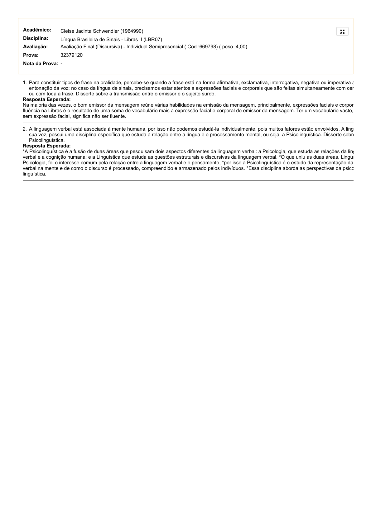 20/05/2021 UNIASSELVI - Centro Universitário Leonardo Da Vinci - Portal do Aluno - Portal do Aluno - Grupo UNIASSELVI https://portaldoalunoead.uniasselvi.com.br/ava/avaliacao/avaliacao_lista.php 1/1 Acadêmico: Cleise Jacinta Schwendler (1964990) Disciplina: Língua Brasileira de Sinais - Libras II (LBR07) Avaliação: Avaliação Final (Discursiva) - Individual Semipresencial ( Cod.:669798) ( peso.:4,00) Prova: 32379120 Nota da Prova: - 1. Para constituir tipos de frase na oralidade, percebe-se quando a frase está na forma afirmativa, exclamativa, interrogativa, negativa ou imperativa a entonação da voz; no caso da língua de sinais, precisamos estar atentos a expressões faciais e corporais que são feitas simultaneamente com cer ou com toda a frase. Disserte sobre a transmissão entre o emissor e o sujeito surdo. Resposta Esperada: Na maioria das vezes, o bom emissor da mensagem reúne várias habilidades na emissão da mensagem, principalmente, expressões faciais e corpor fluência na Libras é o resultado de uma soma de vocabulário mais a expressão facial e corporal do emissor da mensagem. Ter um vocabulário vasto, sem expressão facial, significa não ser fluente. 2. A linguagem verbal está associada à mente humana, por isso não podemos estudá-la individualmente, pois muitos fatores estão envolvidos. A ling sua vez, possui uma disciplina específica que estuda a relação entre a língua e o processamento mental, ou seja, a Psicolinguística. Disserte sobre Psicolinguística. Resposta Esperada: *A Psicolinguística é a fusão de duas áreas que pesquisam dois aspectos diferentes da linguagem verbal: a Psicologia, que estuda as relações da ling verbal e a cognição humana; e a Linguística que estuda as questões estruturais e discursivas da linguagem verbal. *O que uniu as duas áreas, Linguí Psicologia, foi o interesse comum pela relação entre a linguagem verbal e o pensamento, *por isso a Psicolinguística é o estudo da representação da verbal na mente e de como o discurso é processado, compreendido e armazenado pelos indivíduos. *Essa disciplina aborda as perspectivas da psico linguística.