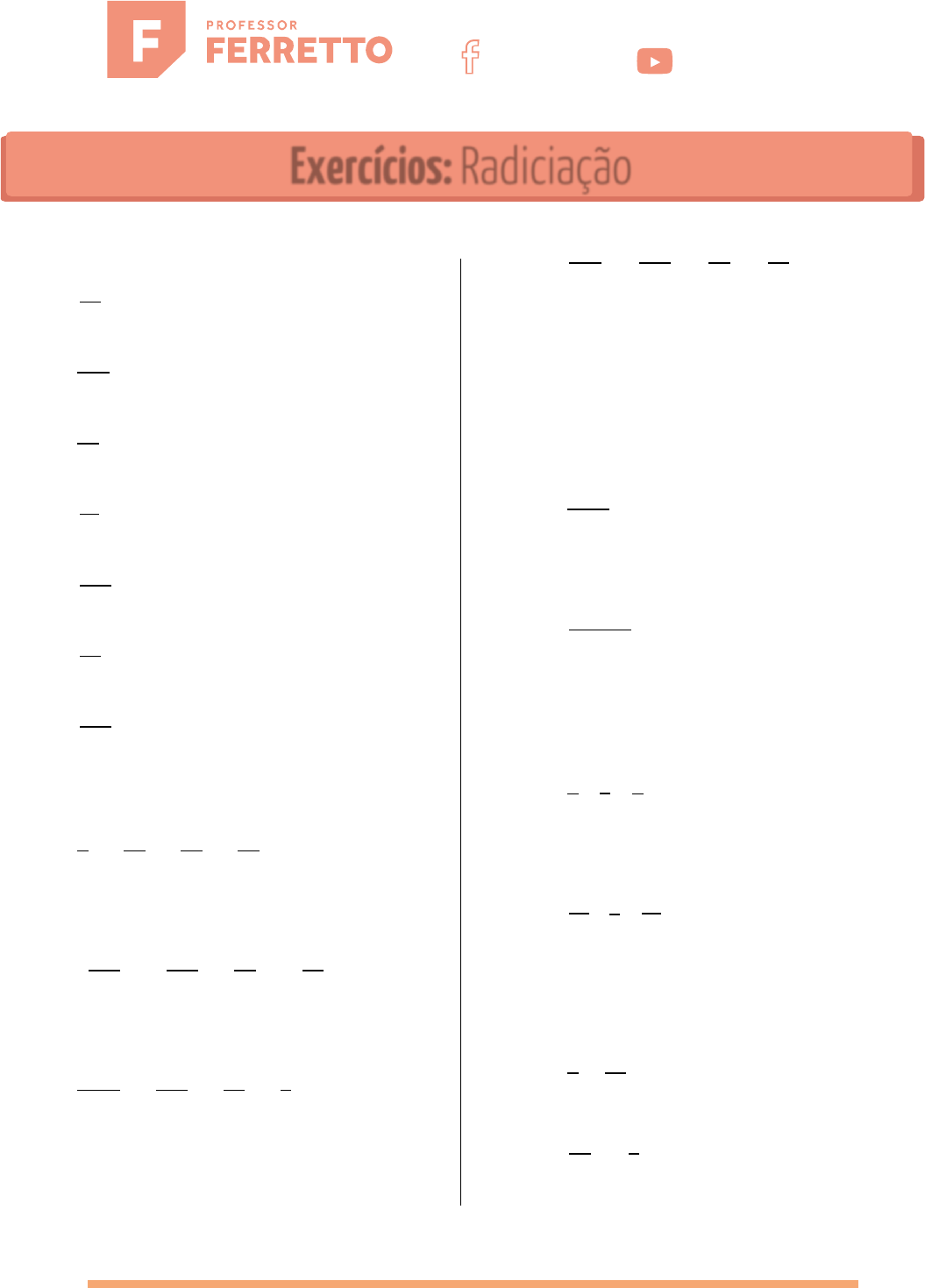 1 Simplifique os radicais: 1. √64 3 = 2. √576 = 3. √12 = 4. √27 3 = 5. √625 4 = 6. √72 3 = 7. √512 4 = Simplifique as expressões: 8. √8 + √32 + √72 − √50 = 9. 5√108 + 2√243 − √27 + 2√12 = 10. √2000 + √200 + √20 + √2 = 11. √128 3 − √250 3 + √54 3 − √16 3 = Simplifique: 12. √81𝑥3 = 13. √45𝑥3𝑦2= Reduza ao mesmo índice: 14. √2, √5 3 , √3 5 = 15. √22 3 , √3, √53 4 = Efetue as operações indicadas com as raízes: 16. √3 ⋅ √12 = 17. √24 3 ÷ √3 3 = Exercícios: Radiciação www.professorferretto.com.br ProfessorFerretto ProfessorFerretto http://www.professorferretto.com.br 2 18. √ 3 2 ÷√ 1 2 = 19. √3 ⋅ √2 3 = 20. √4 3 ÷ √2 4 = 21. √ 5 2 3 ÷ √ 1 2 5 = Efetue as operações: 22. 2√3(3√5 − 2√20 − √45) = 23. (√20 − √45 + 3√125) ÷ 2√5 = Expresse na forma de potência de expoente racional os seguintes radicais: 24. √5 = 25. √4 3 = 26. √√2 = 27. √√5 34 = 28. (√22 3 ) 2 = Calcule, substituindo as potências de expoente racional pelos correspondentes radicais: 29. 8 1 3 = 30. 64 −1 2 = 31. (0,25) −1 2 = 32. ( 9 4 ) 1 2 = 33. ( 1 32 ) −1 5 = 34. (0,81) −1 2 = GABARITO: 1. 4 2. 24 3. 2√3 4. 4√23 5. 5 6. 2√93 7. 4√24 8. 7√2 9. 49√3 10. 22√5 + 11√2 11. 0 12. 9𝑥√𝑥, 𝑥 ≥ 0 13. 3𝑥𝑦√5𝑥, 𝑥 ≥ 0 14. √21530 , √51030 , √3630 15. √2812 , √3612 , √5912 16. 6 17. 2 18. √3 19. √1086 20. √3212 21. √5 5 22 15 22. −8√15 23. 7 24. 5 1 2 25. 2 2 3 26. 2 1 4 27. 5 1 12 28. 2 4 3 29. 2 30. 1/8 31. 2 32. 3/2 33. 2 34. 10/9