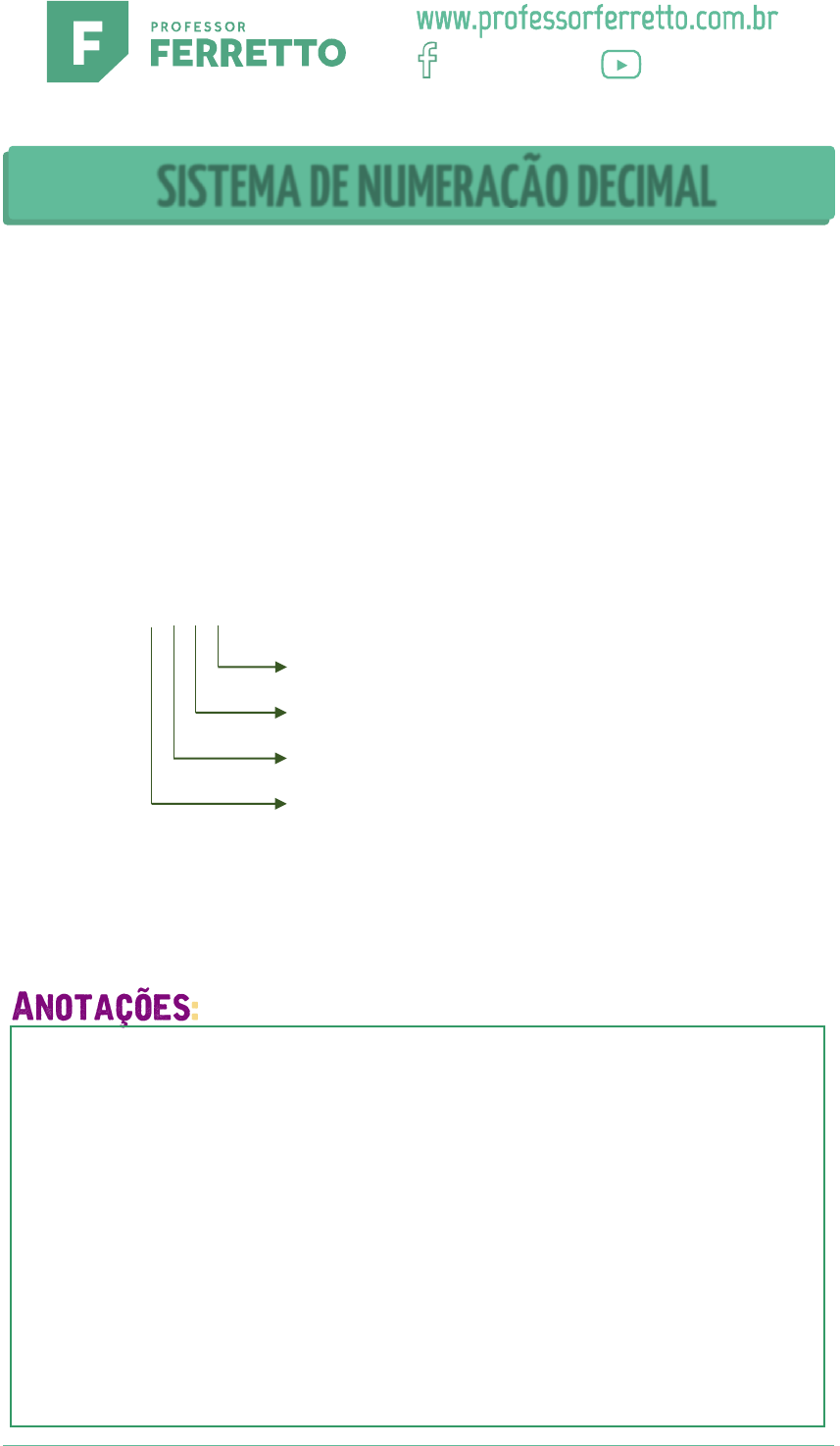 1 Sistema Hindu-Arábico É um sistema decimal (Base 10): 0 1 2 3 4 5 6 7 8 9 É um sistema posicional: Cada algarismo muda de valor de acordo com a posição que ele ocupa em um determinado número. 5555 Utilização do zero 5055 ProfessorFerretto ProfessorFerretto SISTEMA DE NUMERAÇÃO DECIMAL cinco unidades cinco dezenas cinco centenas cinco milhares 2 Classes e Ordens Classes MILHÕES MILHARES UNIDADES Ordens centena dezena unidade centena dezena unidade centena dezena unidade 100.000.000 10.000.000 1.000.000 100.000 10.000 1.000 100 10 1 108 107 106 105 104 103 102 101 100 84.506 Representação para números decimais centena dezena unidade décimo centésimo milésimo 100 10 1 0,1 0,01 0,001 102 101 100 10-1 10-2 10-3 35,147