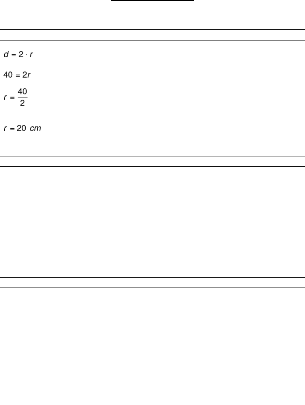Lista Circunferência 1. Determine o raio de uma circunferência que possui diâmetro medindo 40 cm. Resolução: Sabemos que o diâmetro é o dobro do raio, assim: 2. Determine o comprimento da circunferência de raio 5 cm. Resolução: O raio da circunferência é igual 5 cm, logo, para determinar o comprimento da circunferência, devemos substituir esse valor na fórmula. C = 2πr C = 2(3,14)(5) C = 6,24 · 5 C = 31,2 cm 3. Determine a área de uma circunferência que possui raio igual 4 cm. Resolução: Temos que o raio da circunferência é igual a 4 cm, logo, podemos substituir essa medida na fórmula da área. Veja: A = π · r2 A = 3,14 · (4)2 A = 3,14 · 16 A = 50,24 cm2 4.Considerando que uma pizza tradicional grande possui 35 cm de raio e uma pizza tradicional pequena apresenta 25 cm, determine a diferença entre a área das duas pizzas. Resolução: Vamos calcular, separadamente, a área do círculo que corresponde à cada pizza: Pizza Grande AG= π · r² AG= π · (35)² AG= π · 1225 AG= 1225π cm² Pizza Pequena AP= π · r² AP= π · (25)² AP= π · 625 AP= 625π cm² Conhecendo as duas áreas, vamos encontrar a diferença entre elas, a qual chamaremos de x: x = AG– AP x = 1225π – 625π x = 600π cm² Portanto, a diferença entre a área de uma pizza grande tradicional e a área de uma pizza pequena é de 600π cm². 5.(UESPI) Um trabalhador gasta 3 horas para limpar um terreno circular de 6 metros de raio. Se o terreno tivesse 12 metros de raio, quanto tempo o trabalhador gastaria para limpar tal terreno? a) 6 h. b) 9 h. c) 12 h. d) 18 h. e) 20 h. Resolução: Primeiramente, vamos calcular a área dos dois terrenos, A1 e A2: A1= π · r² A1= π · 6² A1= 36π m² A2= π · r² A2= π · 12² A2= 144π m² Portanto, podemos afirmar que o trabalhador gasta três horas para limpar um terreno de 36π m² e x horas para limpar um terreno de 144π m². Por meio de uma regra de três simples, temos: 3 h –––––– 36π m² x h –––––– 144π m² 36π · x = 3 · 144π x =432 π 36π x = 12 h Podemos concluir que o trabalhador gastará 12 h para limpar um terreno de 12 metros de raio. A alternativa correta é a letra C.