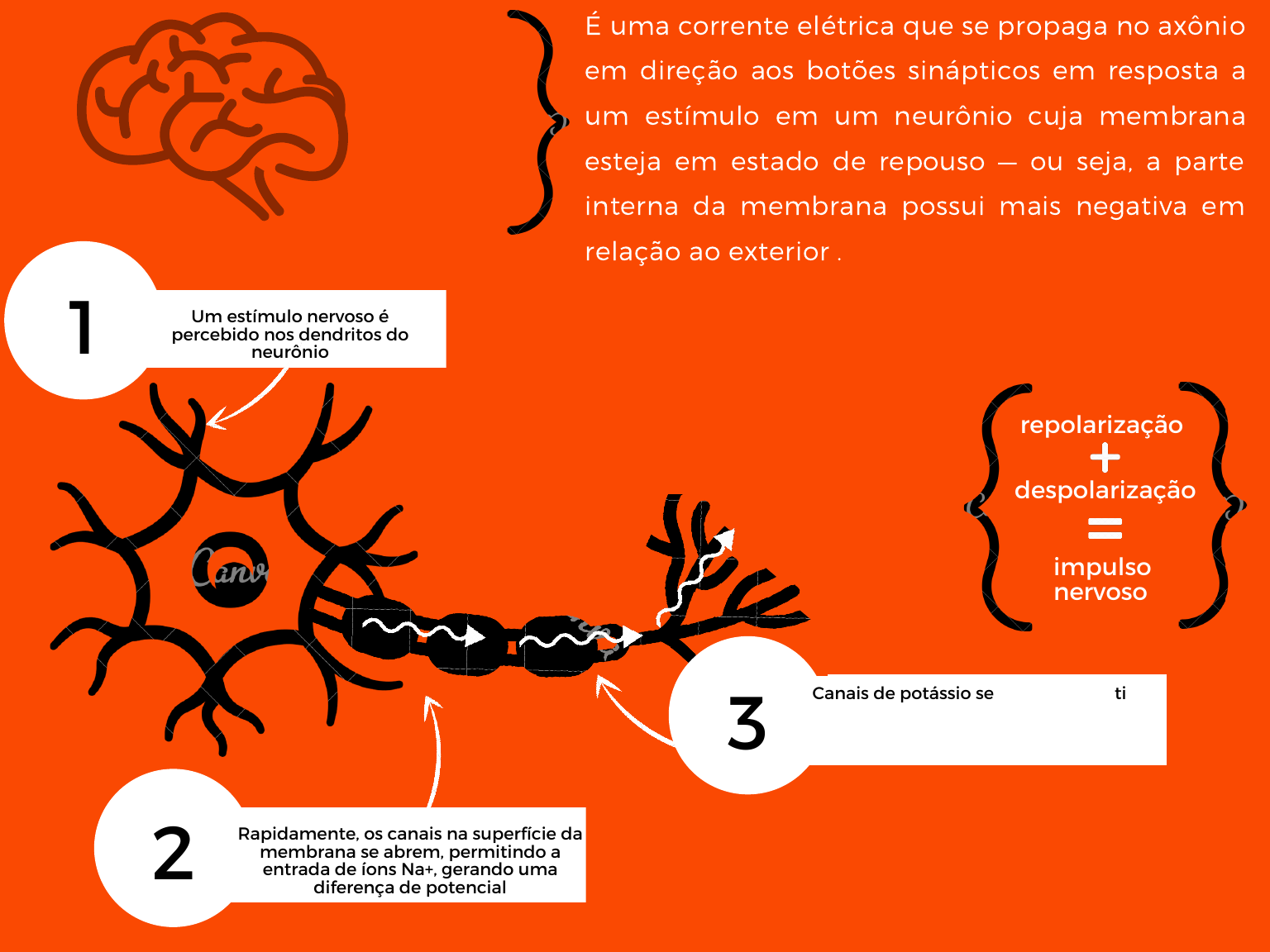 IMPULSO NERVOSO É uma corrente elétrica que se propaga no axônio em direção aos botões sinápticos em resposta a um estímulo em um neurônio cuja membrana esteja em estado de repouso — ou seja, a parte interna da membrana possui mais negativa em relação ao exterior . despolarização repolarização impulso nervoso 1 Um estímulo nervoso épercebido nos dendritos doneurônio 2 Rapidamente, os canais na superfície damembrana se abrem, permitindo aentrada de íons Na+, gerando uma diferença de potencial 3 Canais de potássio se abrem, permitindo o fluxo de íons K+ dentro do neurônio, que por sua vez se torna novamente negativo em relação ao exterior repolarização despolarização direção do impulso nervoso esse estímulo percorre todo o axônio até o botão sináptico, onde ele é transmitido para outra célula. essa comunicação se denomina sinapse, podendo ser intermediada ou não por neurotransmissores.