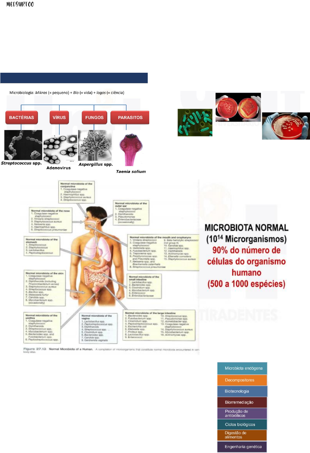 @ Nivya Moraes P2/UC6 UNIT – AL 1 HABILIDADES LABORATORIAIS MICROBIOLOGIA E MORFOLOGIA BACTERIANA INTRODUÇÃO O QUE A MICROBIOLOGIA ESTUDA? Morfologia, Ecologia, Genética e Bioquímica das bactérias bem como outros muitos aspectos relacionados com elas. É um ramo da Biologia e é de grande importância para o homem por seus envolvimentos médicos. POR QUE É IMPORTANTE ESTUDAR MICROBIOLOGIA? É necessário conhecer a microbiota humana. Cada sítio tem sua flora e a partir do momento que alguns determinados microrganismos se proliferam nessa região ou há exacerbação da flora que cause desequilíbrio na microbiota pode levar a um processo patológico Figura 1: processos importantes aos quais as bactérias se relacionam @ Nivya Moraes P2/UC6 UNIT – AL 2 Malefícios da microbiota associada a batérias: intoxicação e doenças infecciosas CÉLULA BACTERIANA Bactérias são seres unicelulares, procariontes e podem ser autótrofas ou heterótrofas. Fazem parte do reino monera Reprodução assexuada por bipartição ou cissiparidade Conjugação ou transformação (no caso de indivíduos de espécies diferentes) - é o processo em que uma bactéria fixa sua pili sexual em outra bactéria e ambas trocam seus DNAs plasmidiais. COMPONENTES DA BACTÉRIAS: RIBOSSOMOS – síntese proteica FLAGELO – estruturas locomotoras formadas principalmente por uma proteína denominada flagelina PLASMÍDEO – fragmento de DNA, ligação importante à resistência bacteriana (algumas bactérias podem pegar informações do plasmídeo e passar para outras bactérias, o que pode desenvolver resistência bacteriana) DNA – disperso no citoplasma PAREDE CELULAR – presente na maioria das bactérias, é localizada externamente à membrana plasmática, formada por peptideoglicano ou mureína, que garante proteção e forma à célula, além de controle osmótico CITOPLASMA - ausência de organelas membranosas e a presença de ribossomos FÍMBRIAS - atuam auxiliando na fixação das bactérias NUCLEOIDE – região celular em que se concentra maior quantidade de DNA algumas bactérias possuem uma CÁPSULA DE POLISSACARÍDEO que auxilia na sua proteção frente a outros organismos e substâncias, além de promover a adesão em superfícies. Essa cápsula pode ser formada por exopolissacarídeos (EPS) MESOSSOMOS - são "membranas internas" onde ocorrem os processos respiração celular para obtenção de ATP e fotossíntese (no caso das bactérias fotossintetizantes). EXISTEM BACTÉRIAS QUE NÃO POSSUEM PAREDE CELULAR? Sim, o nicoplasma, por exemplo, é um tipo de bactéria que não possui parede celular MORFOLOGIA BACTERIANA Organismo Procarionte Tamanho varia 0,2 a 5,0μM Bactérias existem há mais do que 3,5 bilhões anos. Graça às estruturas simples, bactérias podem sobreviver em todos ambientes da terra. Podem ser encontradas no ar, no solo, na água, vulcão, no mar profundo, nas fontes quentes, no gelo, no sal, na pele dos homens, etc. Em condições desfavoráveis algumas bactérias formam esporos, que podem sobreviver vários anos. @ Nivya Moraes P2/UC6 UNIT – AL 3 FORMAS E ARRANJOS Esféricas → Cocos Forma de bastão→ Bacilos Forma espiral→ Espiraladas: Espirilos ou Espiroquetas Forma de vírgula → Vibrião Cocos e Bacilos podem unir-se → colônias o Cadeias(“estrepto-“) o Cacho (“estafilo-“) o Pares (“diplo-“) ESTREPTOBACILOS: bastonetes agrupados em cadeias. PALIÇADA: bastonetes alinhados lado a lado como palitos de fósforo. Ex: Corynebacterium COCOBACILOS: tem forma intermédia entre os coco e bacilos. Ex: Haemophilus influenzae e Gardenerella vaginalis ESTRUTURA BACTERIANA FÍMBRIAS OU PILI: Apêndices filamentosos → Presentes nos pólos ou homogeneamente distribuídos Auxiliam na reprodução, comunicação e adesão da bactéria em determinadas células Pili sexual (As fímbrias são de natureza protéica – pilina) FLAGELO: Apêndices, em forma de filamentos, que servem para a sua locomoção, fator de virulência e quimiotaxia. @ Nivya Moraes P2/UC6 UNIT – AL 4 Longos apêndices filamentosos → Possuem 3 partes básicas Proteína FLAGELINA As bactérias recebem denominações especiais de acordo com a distribuição dos flagelos: GLICOCÁLICE Reservatório de água e nutriente Aumento da capacidade invasiva Aderência Aumento da resistência Produção industrial BIOFILME: São agremiações funcionais de microrganismos aderidos a uma superfície e embebidos em substância polimérica extracelulares (EPS) PAREDE CELULAR: Resistência Classificação em dois grandes grupos: o Gram- positiva e gram- negativa Ponto de ancoragem ASPECTO DAS PAREDES CELULARES DE ORGANISMOS GRAM POSITIVOS E NEGATIVOS: Comparando: A camada de peptidioglicano é mais espessa na gram positiva Na gram negativa tem dois tipos de membrana: interna e externa Gram negativa é mais complexa: @ Nivya Moraes P2/UC6 UNIT – AL 5 BACTÉRIAS GRAM NEGATIVAS: Membrana externa : impermeabiliza a célula; oferece proteção extra contra enzimas digestivas. Espaço periplasmático: rico em enzimas hidrolíticas; enzimas relacionadas a virulência ( beta – lactamase); apresenta sistema de transporte de açúcar e captação de outros metabólicos . LPS / endotoxina : muito imunogênico o Pode ser liberdo em infecções e ser tóxico o Pode funcionar como receptor e bloquear a resposta imune. COLORAÇÃO DE GRAM COMO É FEITA? 1 – isola a bactéria 2 – coloca no esfregaço 3 – fixa na lâmina com calor 4 – usa o corante cristal violeta, que vai ser absorvido pela parede celular (tanto na gram negativa quanto na gram positiva) 5 – depois lava o excesso de corante e joga lugol/iodo, que vai ajudar a fixar o cristal violeta 6 – lava o material com álcool, que vai descorar o corante (principalmente os bacilos gram negativos, por que quando joga o álcool, destrói a membrana externa que é lipoproteica) 7 – coloca o corante safranina/fuxina (corante rosa) e quem descorou vai corar.