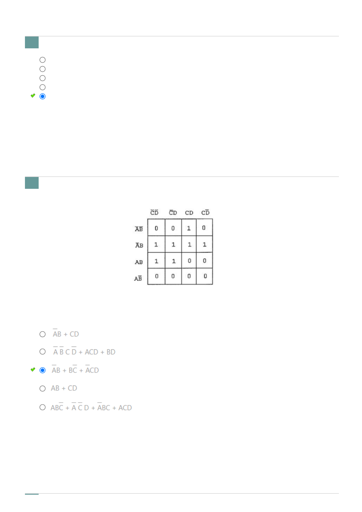 22/05/2021 Estácio: Alunos https://simulado.estacio.br/alunos/?p0=186165540&user_cod=2371409&matr_integracao=201903446015 1/3 Definir a máquina de estados, definir a numeração binária dos estados, projetar o circuito combinacional e projetar o decodificador de saída, se for o caso. Esses são os passos necessários para o projeto de: Observe a seguir o mapa de Karnaugh para quatro variáveis. Encontre a equação lógica simplificada, através do mapa de Karnaugh apresentado acima, e assinale a opção correta. 1. Diagrama de Sincronismo Diagrama de Boole Unidades Lógicas Aritméticas Numeração de Estados Circuito Sequencial Explicação: Circuito Sequencial 2. Explicação: . https://simulado.estacio.br/bdq_simulados_exercicio.asp# https://simulado.estacio.br/bdq_simulados_exercicio.asp# 22/05/2021 Estácio: Alunos https://simulado.estacio.br/alunos/?p0=186165540&user_cod=2371409&matr_integracao=201903446015 2/3 O processo de Mapa de Karnaugh possui muitas vantagens em relação sobre o método algébrico. Dentre os motivos pode se destacar: A tabela abaixo refere-se a um mapa de Karnaugh com quantas variáveis? O Mapa de Karnaugh mostra a relação entre entradas lógicas e saídas desejadas por meio de: Alguns circuitos lógicos podem ter sido projetados de modo que não existam certas condições de entrada para as quais não existam níveis de saída especificado. Este processo é conhecido como: 3. Mais fácil de ser estudado Possui maior rapidez Possui um processo mais ordenado Possui o processo de tentativa e erro. Possui um processo mais limpo 4. Nenhuma variável, pois trata-se de uma tabela verdade. Quatro Variáveis Uma variável Duas variáveis Três variáveis Explicação: . 5. Registrador de Deslocamento Diagrama de Sincronismo Tabela Verdade flip-flop Mapa Mental 6. Dont´Care Exclusivos Circuitos Lógicos Mapa K https://simulado.estacio.br/bdq_simulados_exercicio.asp# https://simulado.estacio.br/bdq_simulados_exercicio.asp# https://simulado.estacio.br/bdq_simulados_exercicio.asp# https://simulado.estacio.br/bdq_simulados_exercicio.asp# 22/05/2021 Estácio: Alunos https://simulado.estacio.br/alunos/?p0=186165540&user_cod=2371409&matr_integracao=201903446015 3/3 Registrador de Deslocamento Explicação: .