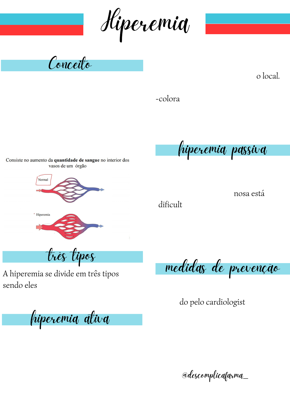 O aumento da quantidade de sangue no interior dos vasos em um órgão ou tecido. - distúrbio da circulação -vermelhidão - aumento do sangue , @descomplicafarma_ Conceito três tipos Hiperemia A hiperemia se divide em três tipos sendo eles: A hiperemia ativa, hiperemia passiva e hiperemia mista. A hiperemia ativa é causada por, estímulos vaso dilatadores neurogenicos ou metabólicos, por mediadores inflamatórios vasodilatadores, pode ser transitórias seguida de passiva e sucessivamente torna-se mista medidas de prevenção O tratamento para a hiperemia deve ser orientado pelo cardiologista, no entanto como se trata apenas de uma alteração normal ou consequência de doença, não há tratamento específico para essa situação. hiperemia ativa Vasodilatação arteriolar ocorrendo um aumento de fluxo sanguíneo no local. -coloração facial hiperemia facial -neurogênica hiperemia ativa durante exercício físico. - hiperemia na inflamação aguda hiperemia passiva A hiperemia passiva também é conhecida como congestão, ocorre quando a drenagem venosa está dificultada como também, pela diminuição do retorno venoso em consequência de uma obstrução ou embolia e também pela redução do retorno venoso sistêmico ou pulmonar