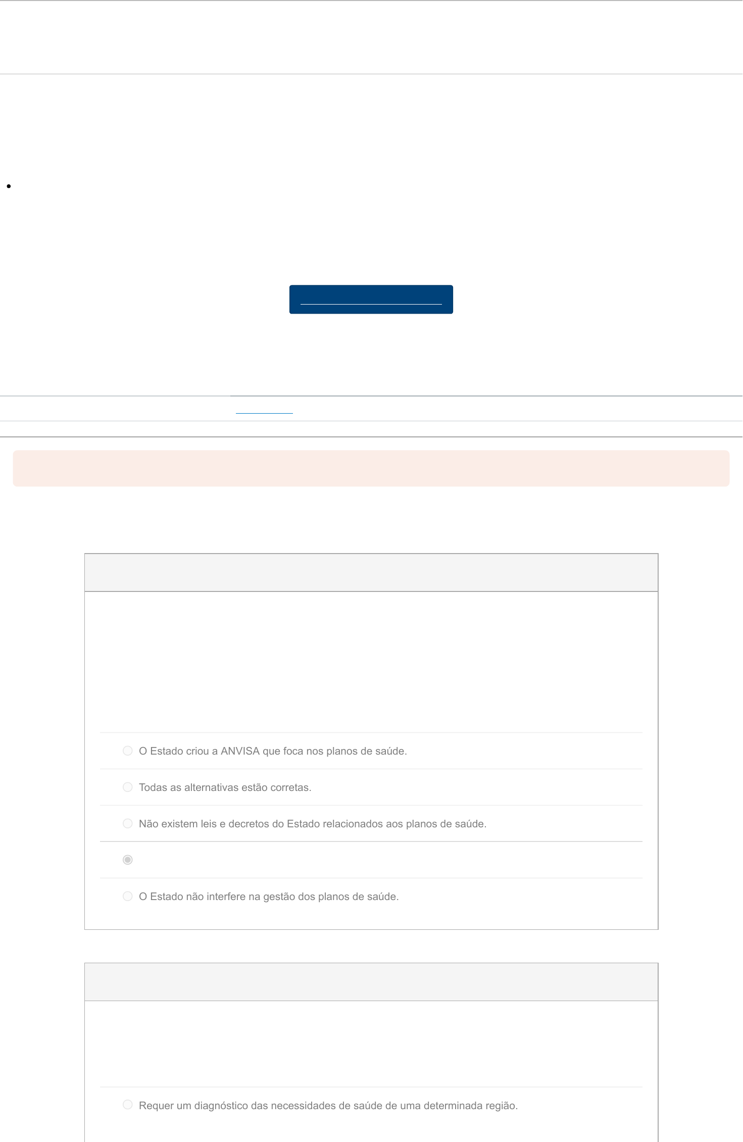 Prova Eletrônica Entrega 25 abr em 23:59 Pontos 30 Perguntas 10 Disponível 16 mar em 0:00 - 25 abr em 23:59 aproximadamente 1 mês Limite de tempo 60 Minutos Tentativas permitidas 2 Instruções Histórico de tentativas Tentativa Tempo Pontuação MAIS RECENTE Tentativa 1 42 minutos 24 de 30 As respostas corretas estarão disponíveis em 25 abr em 0:00. Pontuação desta tentativa: 24 de 30 Enviado 4 abr em 14:15 Esta tentativa levou 42 minutos. A Prova Eletrônica tem peso 30 e é composta por: 10 (dez) questões objetivas (cada uma com o valor de 3 pontos); Você terá 60 (sessenta) minutos para finalizar esta atividade avaliativa e as respostas corretas serão apresentadas um dia após a data encerramento da Prova Eletrônica. Fazer o teste novamente 3 / 3 ptsPergunta 1 O Estado, também denominado "mediador coletivo", direciona os serviços de saúde. Em relação aos planos de saúde, é correto afirmar: O Estado criou a ANVISA que foca nos planos de saúde. Todas as alternativas estão corretas. Não existem leis e decretos do Estado relacionados aos planos de saúde. O Estado dita as "regras do jogo" relacionados aos planos de saúde. O Estado não interfere na gestão dos planos de saúde. 3 / 3 ptsPergunta 2 A regulação dos serviços de saúde: Requer um diagnóstico das necessidades de saúde de uma determinada região. https://dombosco.instructure.com/courses/4588/quizzes/16652/history?version=1 https://dombosco.instructure.com/courses/4588/quizzes/16652/take?user_id=19231 Todas as afirmações estão corretas. Busca proteger o interesse público. Requer a elaboração de protocolos e fluxos nos diferentes níveis de atuação. Inclui a colocação de exigências sobre empresas, sobre cidadãos e sobre si mesmo para alcançar os objetivos das políticas públicas. 3 / 3 ptsPergunta 3 Em relação à saúde suplementar é correto afirmar: O acesso universal permite que todos os brasileiros residentes no país tenham acesso ao serviço de saúde público. Todas as alternativas estão corretas. A Agência Nacional que regula ações relacionadas à saúde suplementar está vinculada ao Ministério da Saúde. Quem tem um plano de saúde também tem o direito de ser atendido no SUS. A regulação do Estado interfere na saúde suplementar. 3 / 3 ptsPergunta 4 A regulação da assistência tem alguns objetos e sujeitos definidos. Assinale a alternativa incorreta. A gestão pública é responsável pela regulação da assistência. Nenhuma das alternativas. A classificação do risco, protocolos e outros critérios de priorização são utilizados. O acesso à assistência deve ser realizado sempre conforme a sequência de inserção na fila de espera. 3 / 3 ptsPergunta 5 Um Rede de Atenção à Saúde robusta deve contemplar os seguintes serviços: Todas as Unidades de Saúde do município. Todos os hospitais do Estado. Unidade de Saúde e Unidade de Pronto Atendimento. Todos os serviços de assistência necessários para o usuário. Unidade de Saúde, Unidade de Pronto Atendimento e hospital. 0 / 3 ptsPergunta 6IncorretaIncorreta Algumas ações são atreladas à regulação em serviços de saúde. Ações relacionadas ao faturamento do serviço e à melhoria da qualidade de atenção e nos direitos do cidadão são de: Controle. Auditoria. Coordenação. Avaliação. Fiscalização. 3 / 3 ptsPergunta 7 A política de regulação dos serviços de saúde do SUS é norteada por princípios e diretrizes, dentre os quais está a integralidade da assistência. Referente ao conceito de integralidade da assistência é correto afirmar: é um conjunto de ações, tanto preventivas como curativas nos diversos níveis de assistência, de acordo com cada caso. é a preservação da autonomia das pessoas relacionada à sua integralidade física e moral. o direito ao serviço de saúde está relacionado exclusivamente ao nível primário (nas Unidades de Saúde). é a integração das ações de saúde, meio ambiente e saneamento básico em nível executivo. 3 / 3 ptsPergunta 8 "...a regulação pode ser vista como a influência deliberada e propriamente dita do Estado em qualquer área ou setor que influencie a sociedade..." (VILARINS; SHIMIZU; GUTIERREZ, 2012, p. 643). Esta afirmação inclui o seguinte, exceto: Definição de critérios de organização e prestação dos serviços de saúde. Busca pela adequação da vaga em relação à procura por assistência à saúde. Todas as alternativas. Não inclui os serviços de saúde suplementar. 0 / 3 ptsPergunta 9IncorretaIncorreta Em relação aso protocolos necessários para a regulação da assistência, é correto afirmar: Os protocolos clínicos são diretrizes para orientar a solicitação e o uso adequado e racional das tecnologias de apoio. Os protocolos de acesso padronizam o uso de recursos para qualificar a assistência a ser prestada. As alternativas b e c estão corretas. Os protocolos dão suporte adequado para as equipes e servem para ordenar os fluxos de encaminhamentos e organizar as ações a serem executadas. As alternativas a e c estão corretas. 3 / 3 ptsPergunta 10 A ANVISA é uma agência nacional que tem por finalidade/localização o seguinte, exceto: Promover o controle sanitário da produção e consumo de produtos e serviços submetidos à vigilância sanitária. Além da sede em Brasília, está representada em portos, aeroportos e outros locais. Ter o controle sobre os planos de saúde. Nenhuma das alternativas. Pontuação do teste: 24 de 30